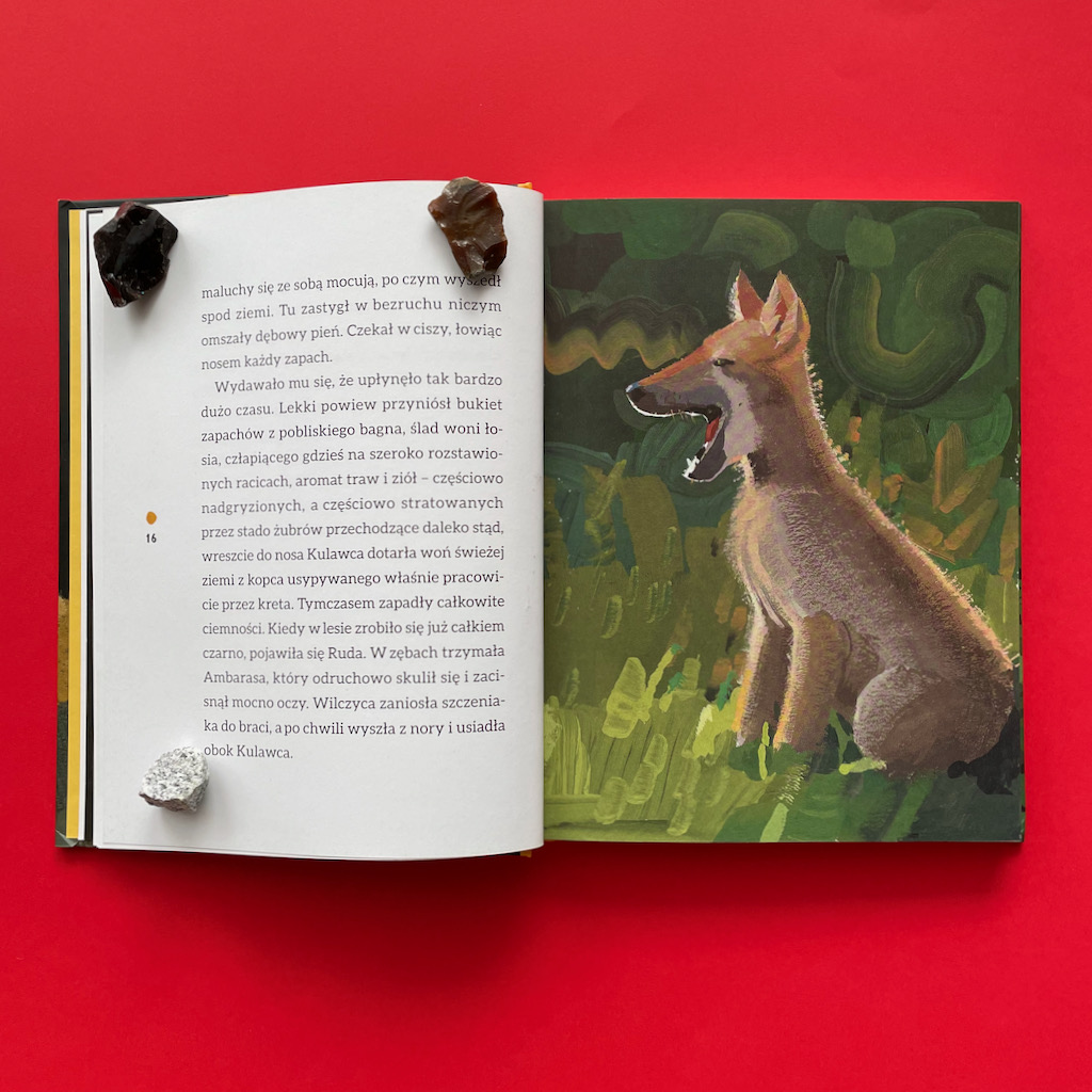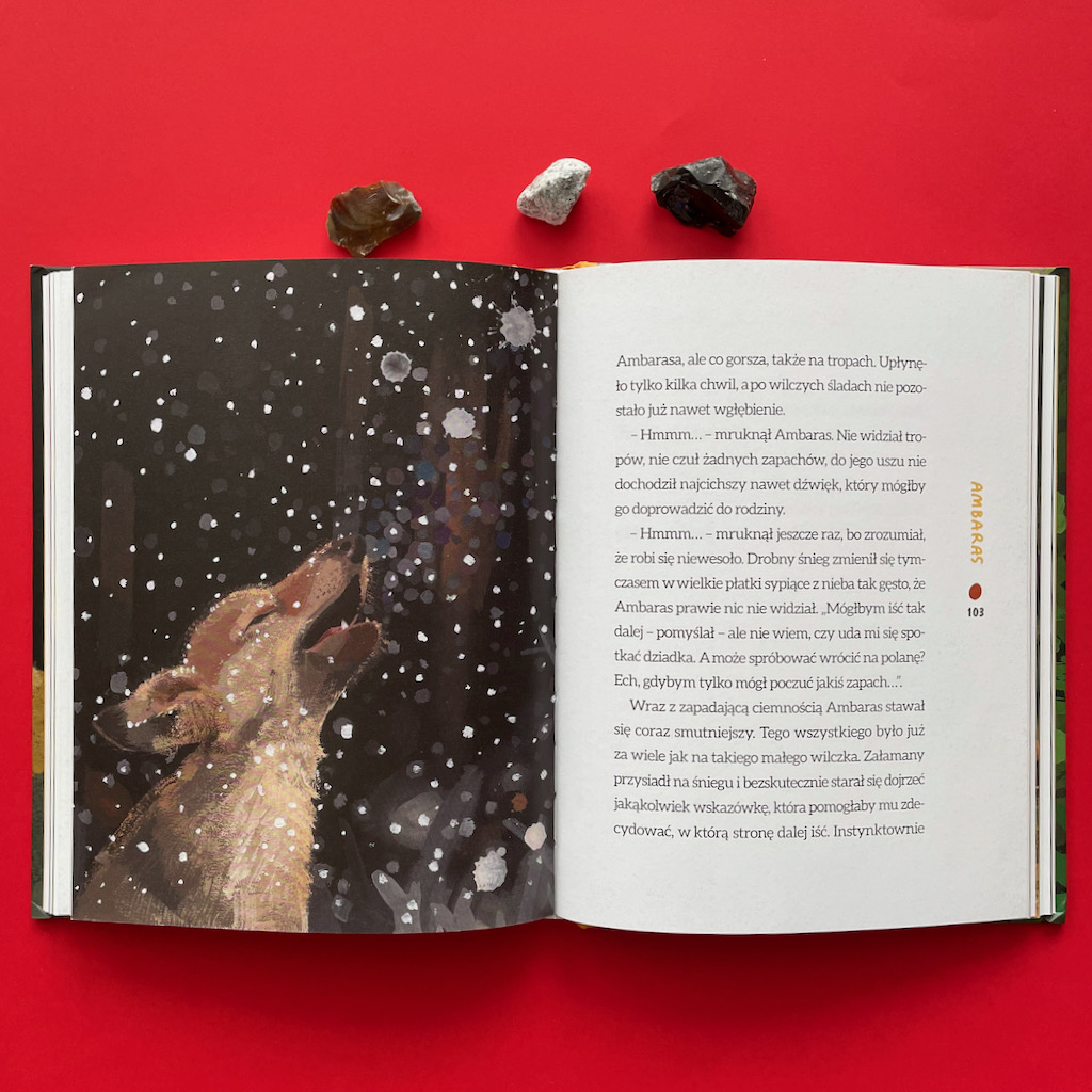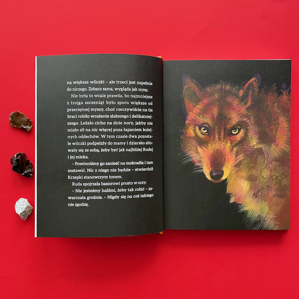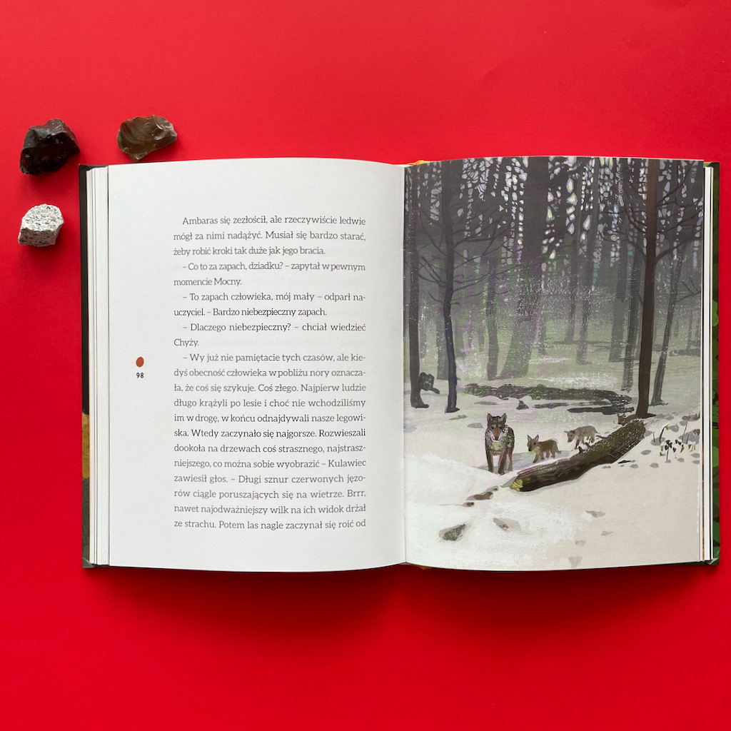Nade wszystko, jest to również przejmująca historia relacji wilków z ludźmi. Wnyki, straszenie i polowania oglądane z perspektywy wilków, są dla mnie jeszcze bardziej przerażające, niż kiedy słucham o nich jako człowiek. Jest to jednak niezwykle ważna książka, której treść uwrażliwia na ten problem. Polecam ją nie tylko rodzicom, ale także wszystkim nauczycielom pracującym z dziećmi powyżej piątego roku życia.