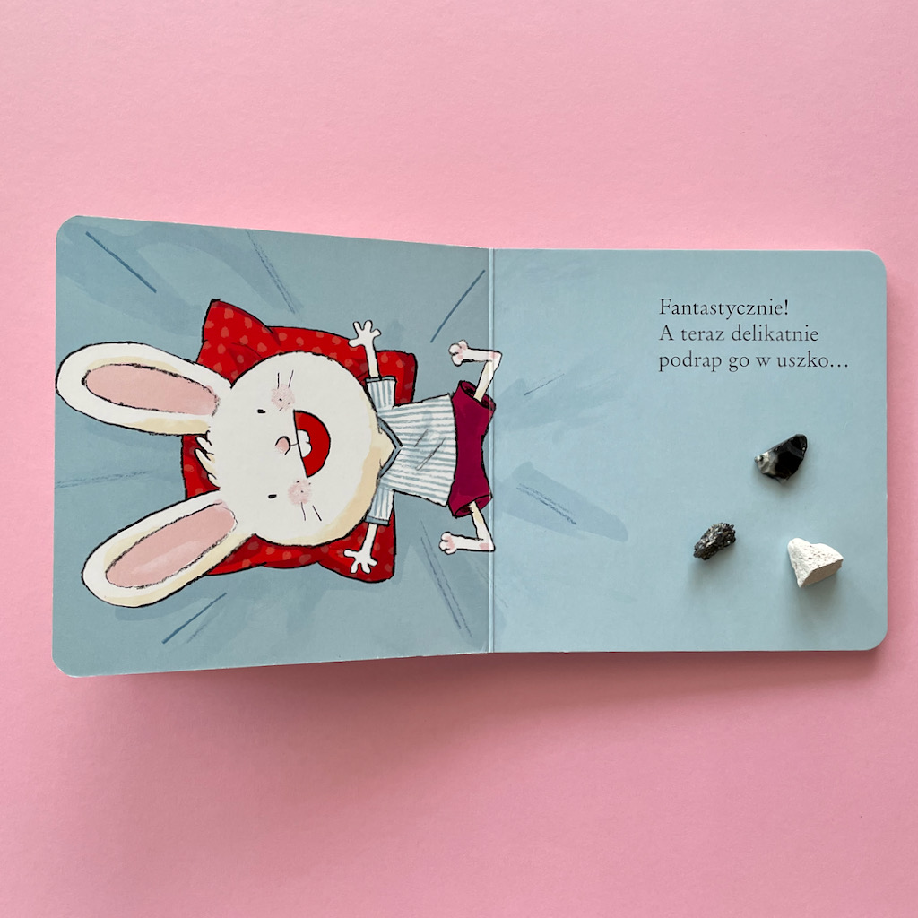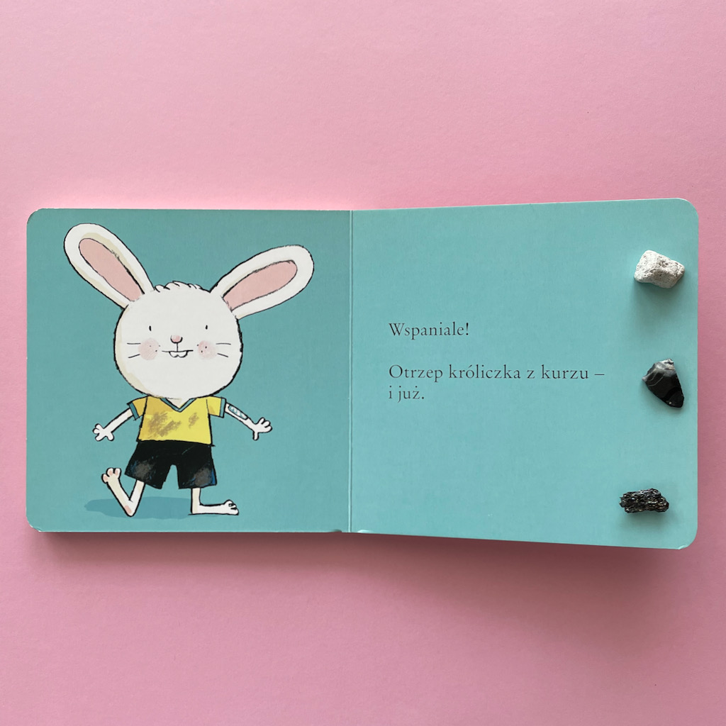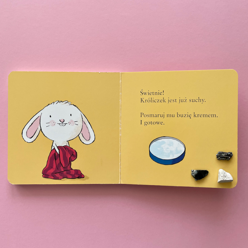I tyle. Po prostu świetnie zharmonizowana propozycja dla dzieciaków, które zaczynają swoją przygodę z czytaniem książek. Nie jest to zwykłe, tradycyjne czytanie dzieciom, bo naprawdę u 2-latków jest to często niemożliwe. To książeczki, które aktywizują, wciągają dziecko w akcję. Angażują w pomoc króliczkowi. Dziecko czuje się sprawcą, przeżywa przygodę, a jednocześnie wyrabia nawyk wytrwania przy książeczce do końca. Wysłuchania historii do ostatniej strony. To, wbrew pozorom, nie jest umiejętność, z którą dzieci się rodzą. To taka sama czynność jak każda inna, której musimy się nauczyć. Jeśli nie będziemy jej trenować to później trudniej będzie zachęcić starsze dziecko do czytania. A skoro mamy tak wspaniały wspomagacz to koniecznie musicie z niego skorzystać.