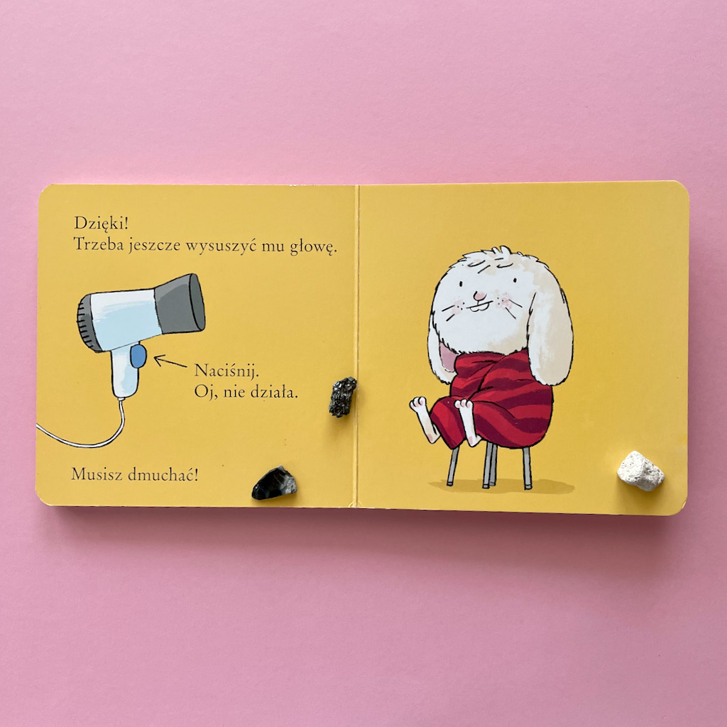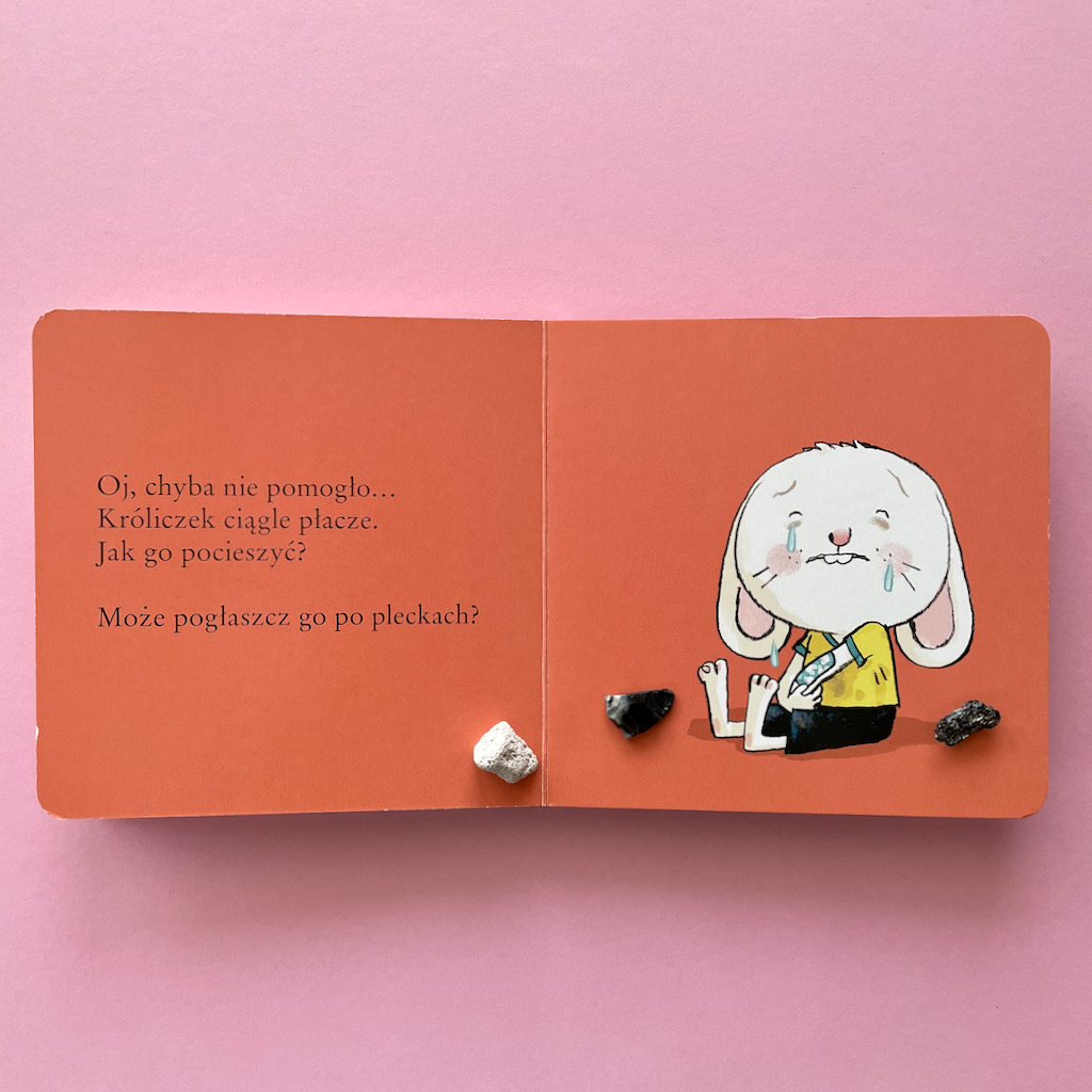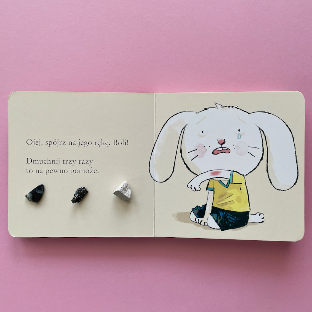 I tyle. Po prostu świetnie zharmonizowana propozycja dla dzieciaków, które zaczynają swoją przygodę z czytaniem książek. Nie jest to zwykłe, tradycyjne czytanie dzieciom, bo naprawdę u 2-latków jest to często niemożliwe. To książeczki, które aktywizują, wciągają dziecko w akcję. Angażują w pomoc króliczkowi. Dziecko czuje się sprawcą, przeżywa przygodę, a jednocześnie wyrabia nawyk wytrwania przy książeczce do końca. Wysłuchania historii do ostatniej strony. To, wbrew pozorom, nie jest umiejętność, z którą dzieci się rodzą. To taka sama czynność jak każda inna, której musimy się nauczyć. Jeśli nie będziemy jej trenować to później trudniej będzie zachęcić starsze dziecko do czytania. A skoro mamy tak wspaniały wspomagacz to koniecznie musicie z niego skorzystać.