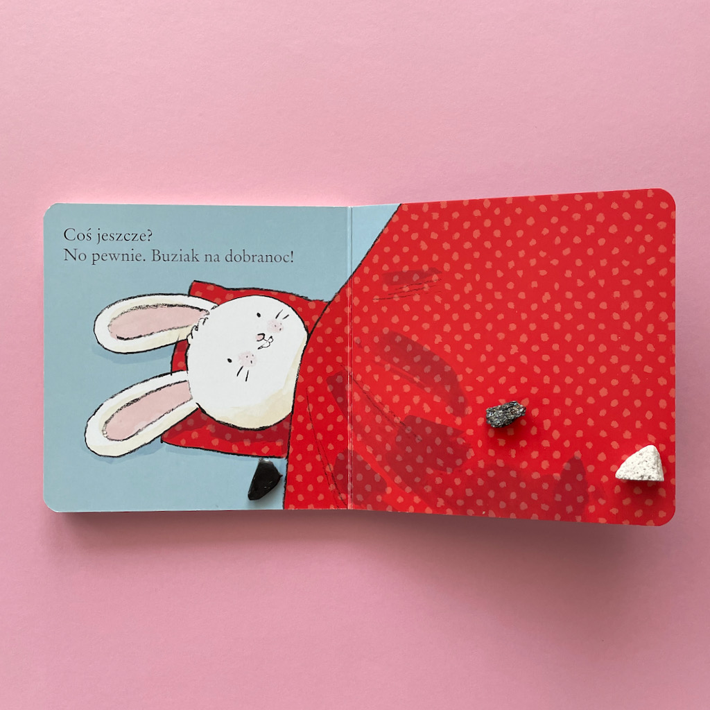 My już niestety z króliczka wyrośliśmy. Dlatego właśnie dzisiaj piszę o tej serii – dopóki leży na naszej półce. Niebawem przekażemy ją pewnie jakiemuś znajomemu maluszkowi. Młodszy syn kochał króliczka całym sercem. Ale teraz ma już 3,5 roku i przerzucił się na książeczki, które mają więcej tekstu. Wciąż jednak patrzy na nie z sentymentem. I oczywiście jak tylko je wyszperałam z zakamarków regału, to kolejny raz musieliśmy zaopiekować się starym przyjacielem. Być może było to już nasze pożegnanie. Wam jednak serdecznie polecam jako powitanie świata dziecięcych książeczek.