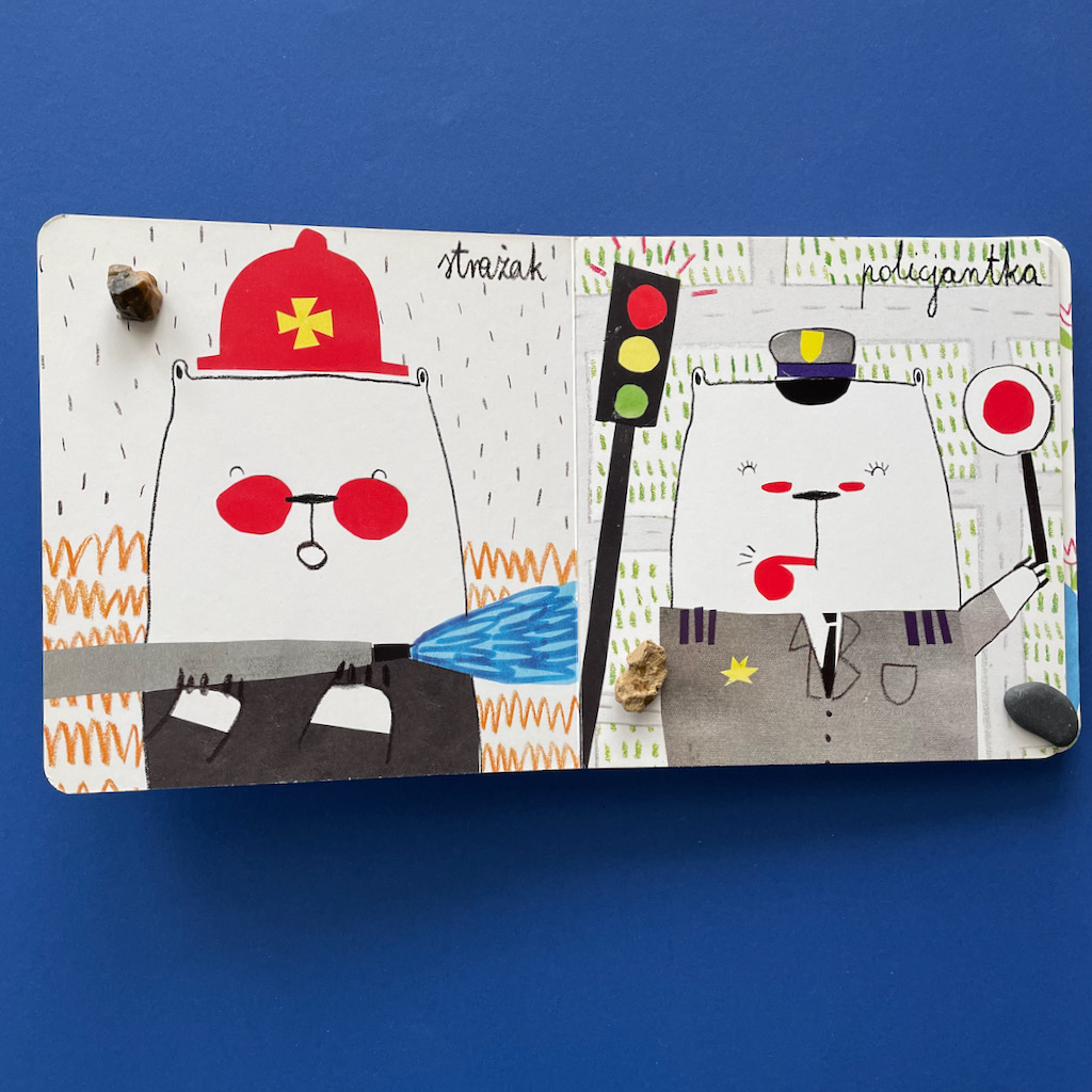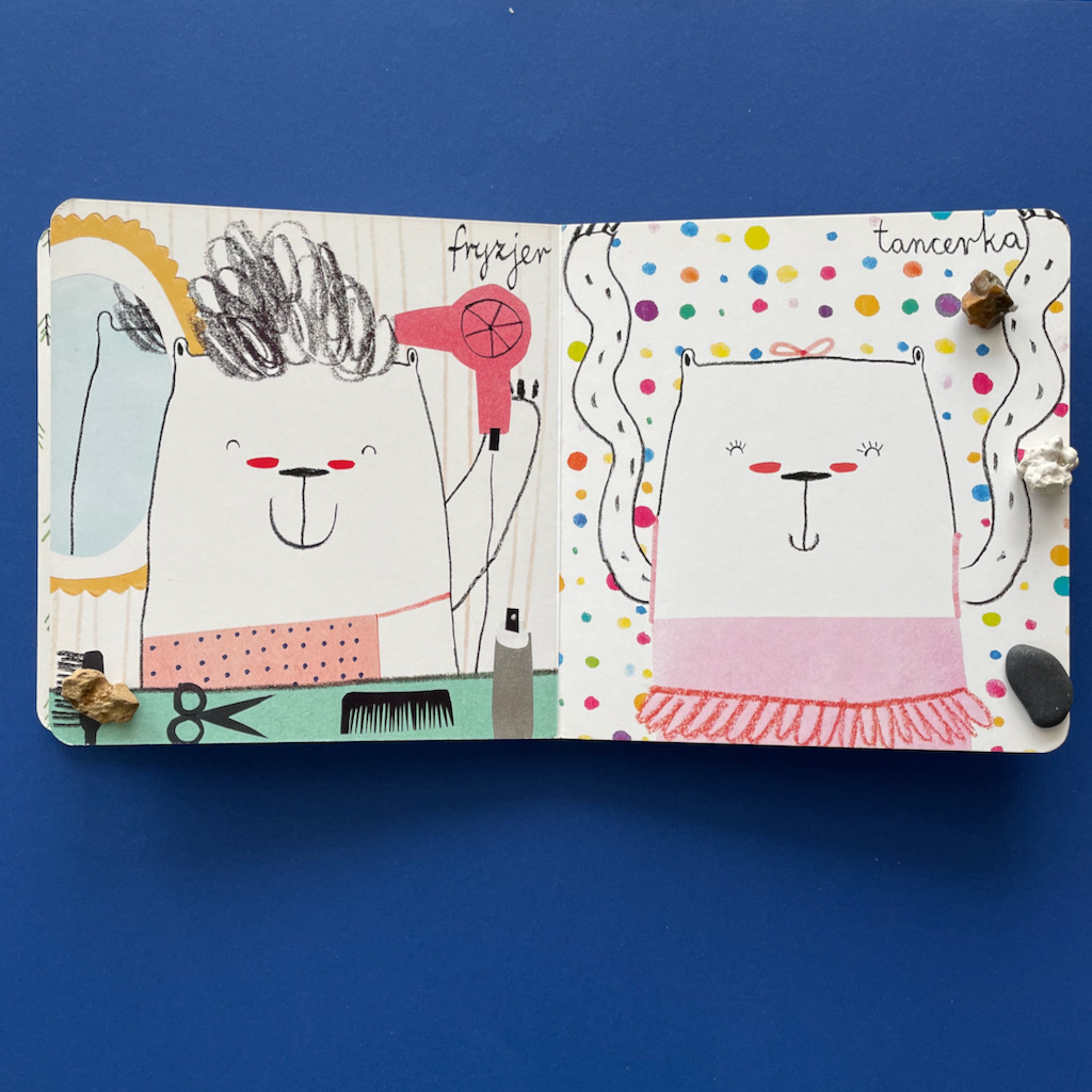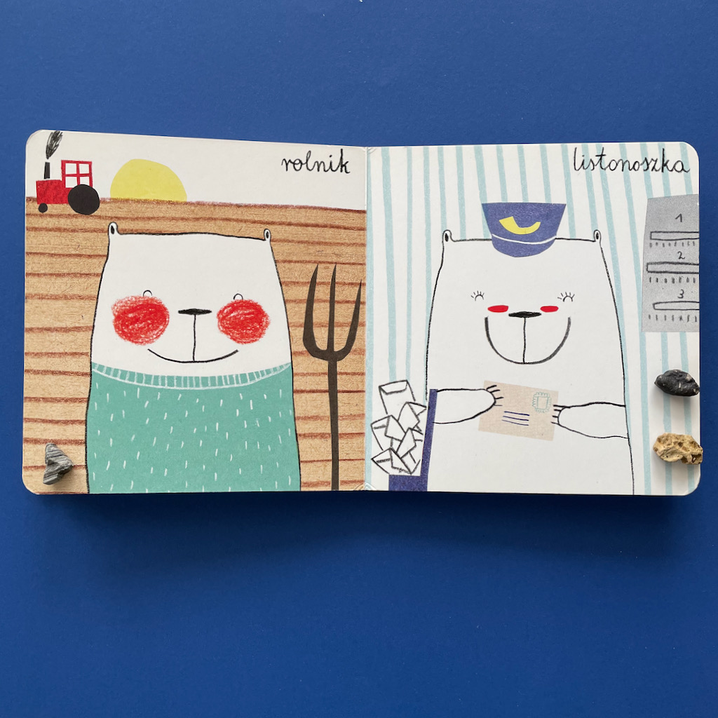 A z pomocą w tym zakresie przychodzi książeczka Agaty Królak Robimisie. To kartonówka dla najmłodszych, ale świetnie sprawdza się też przy starszych przedszkolakach. Na każdej stronie jest inny miś, który jest przedstawicielem konkretnego zawodu. A może to ten sam miś, który wciela się w różne role? W każdym razie mamy śliczne, zabawne ilustracje i całą gamę, bardzo zajętych, misiów.