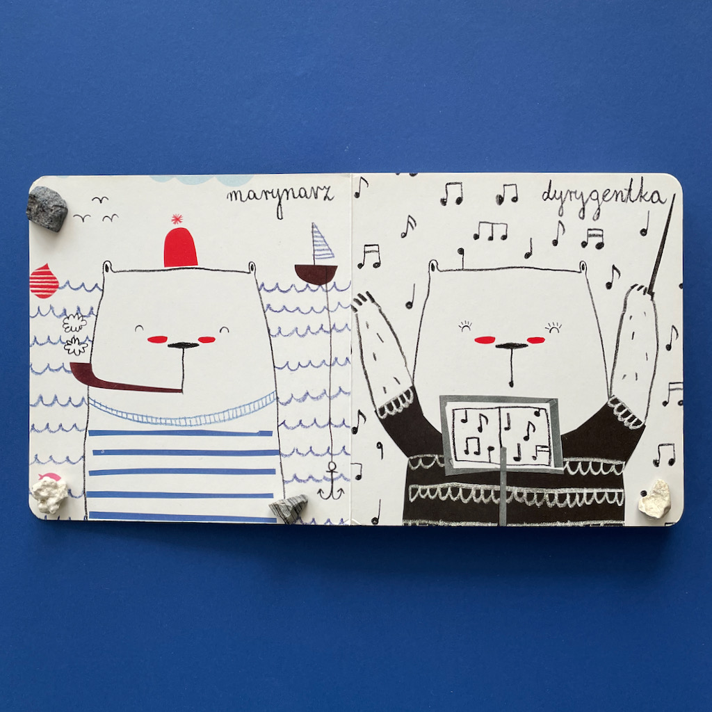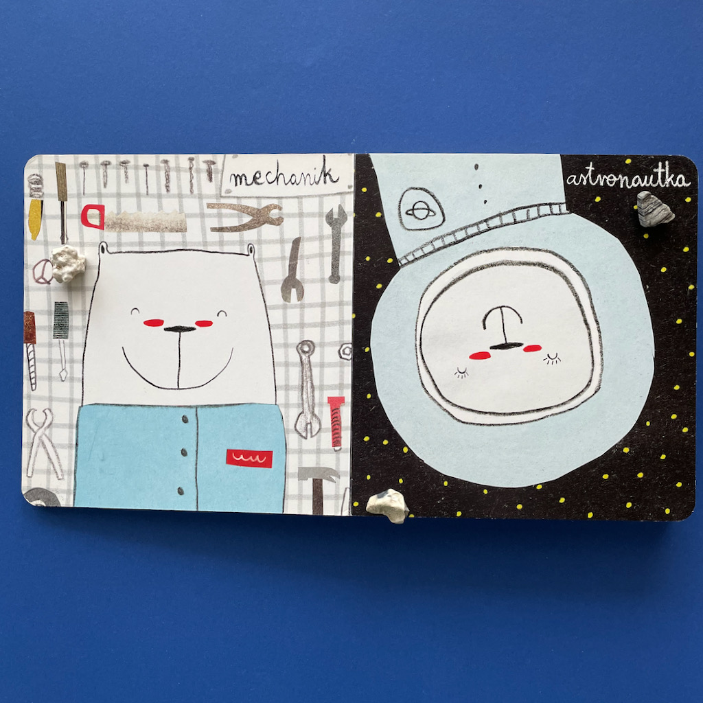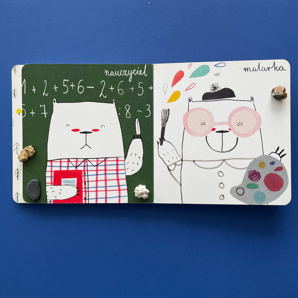 A z pomocą w tym zakresie przychodzi książeczka Agaty Królak Robimisie. To kartonówka dla najmłodszych, ale świetnie sprawdza się też przy starszych przedszkolakach. Na każdej stronie jest inny miś, który jest przedstawicielem konkretnego zawodu. A może to ten sam miś, który wciela się w różne role? W każdym razie mamy śliczne, zabawne ilustracje i całą gamę, bardzo zajętych, misiów.