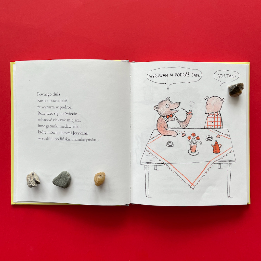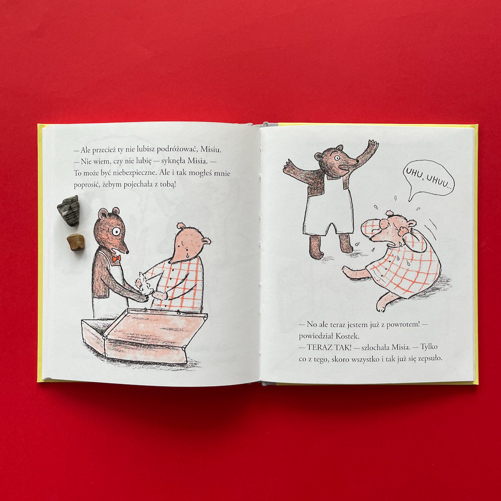 Misia i Kostek to niepozorna książeczka. Kupiłam ją, bo spodobał mi się styl ilustracji i założyłam, że będzie idealna dla młodszego synka. Chyba nawet nie sprawdziłam dla jakiego wieku jest dedykowana. Na okładce dwa misie, jeden zadowolony, drugi smutny, co tu się może nie zgadzać?