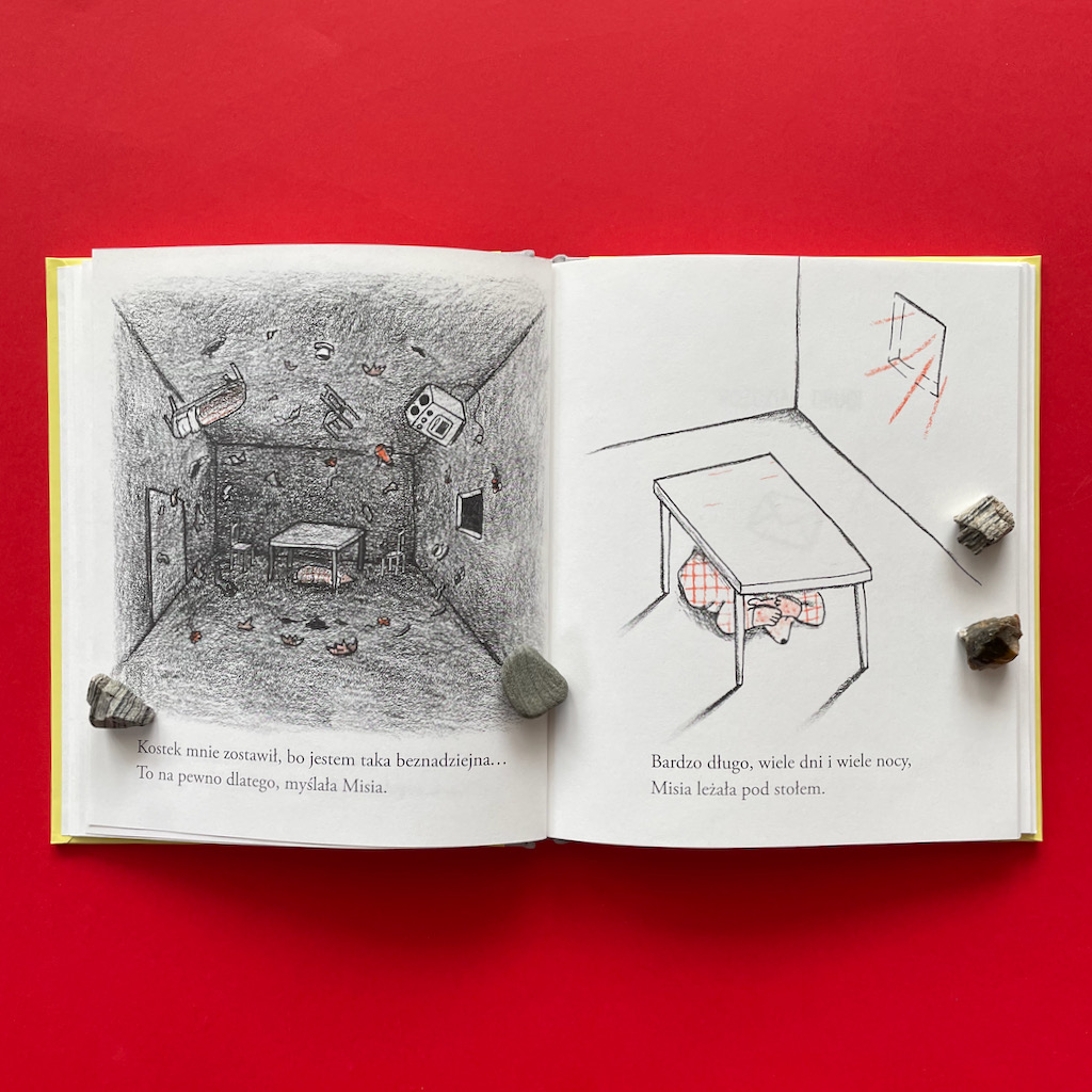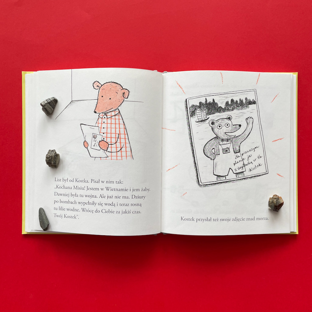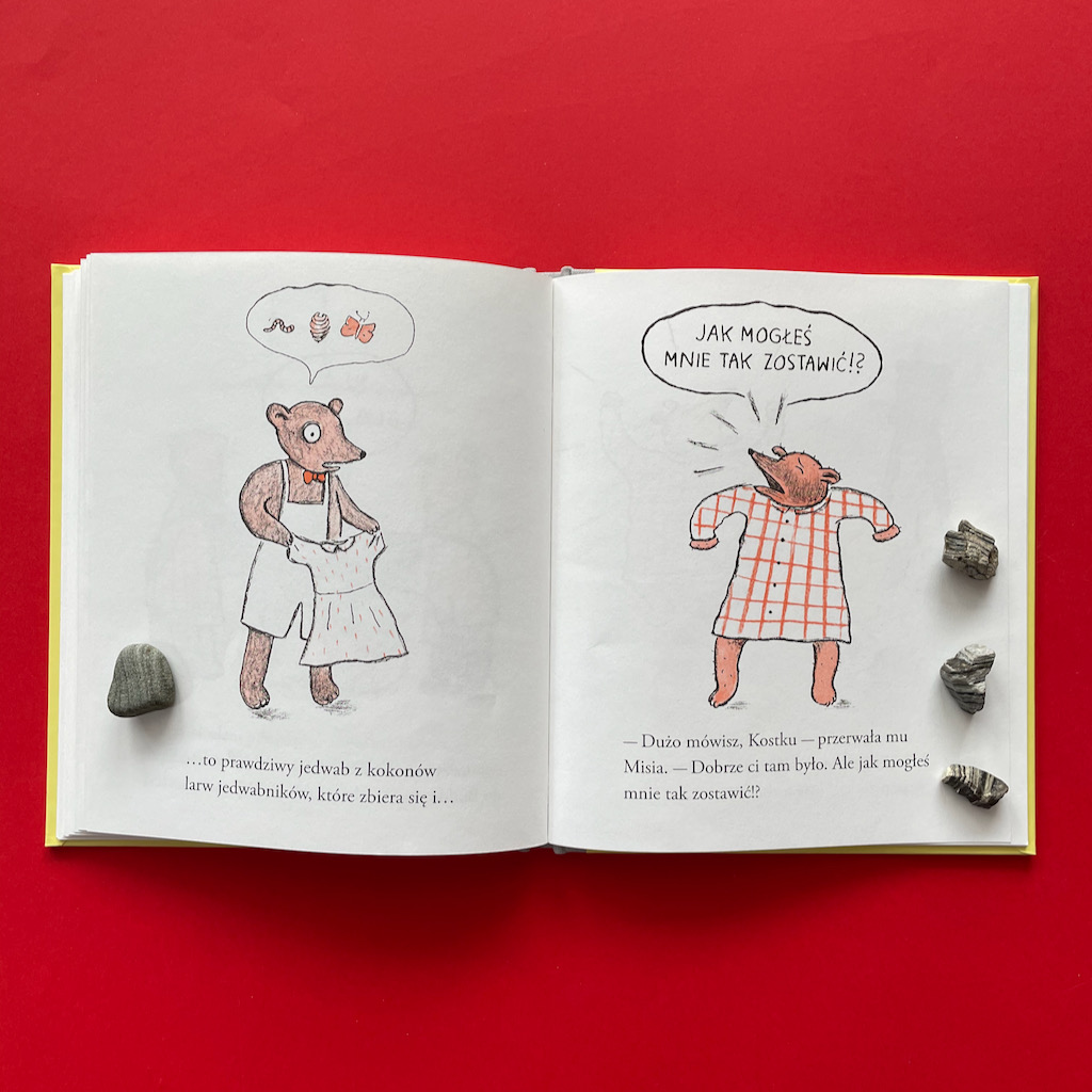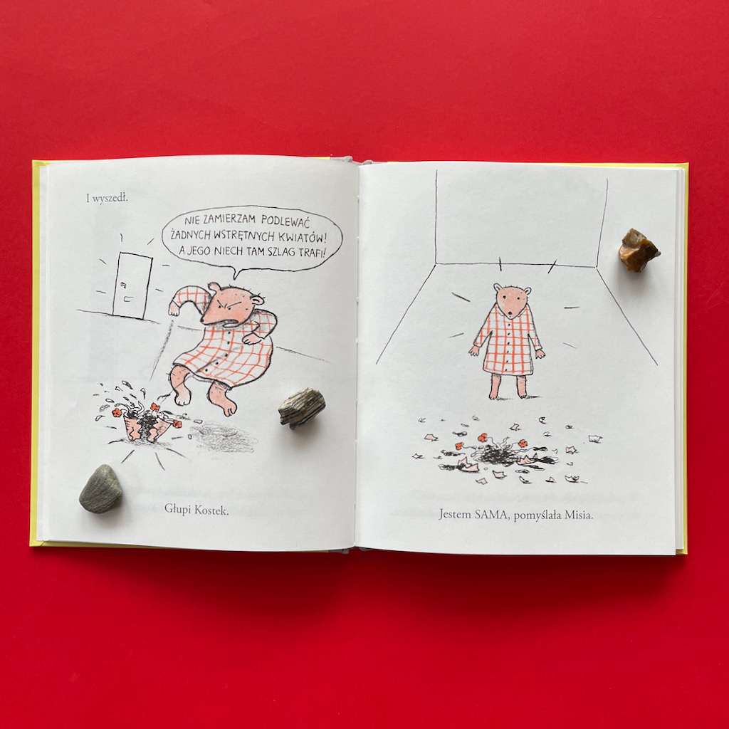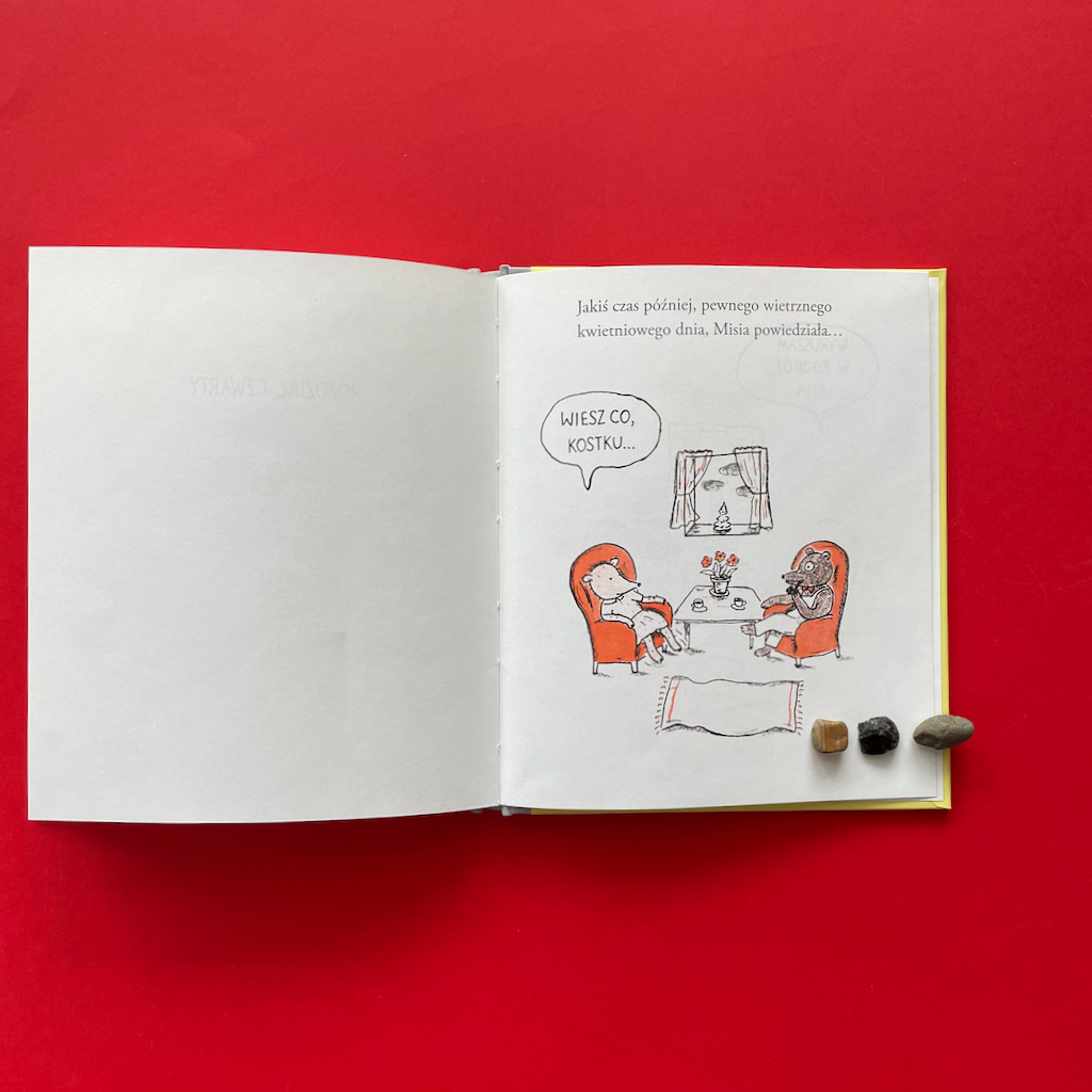 Na koniec o najważniejszym dla mnie fragmencie. W swojej rozpaczy Misia dochodzi do momentu, w którym obwinia siebie o postępowanie Kostka. Dla mnie to wstrząs, gdy czytam: „Kostek mnie zostawił, bo jestem taka beznadziejna…”. To zdanie omawiam z chłopcami bardzo często. Rozmawiamy o poczuciu własnej wartości, o roli sprawcy i ofiary. W dzisiejszych czasach, kiedy nareszcie zaczyna się głośno mówić o depresji, a także o przemocy fizycznej i psychicznej, to zdanie jest niezwykle ważne. Pokazuje, że o trudnych sprawach można (a nawet trzeba) z dziećmi rozmawiać.