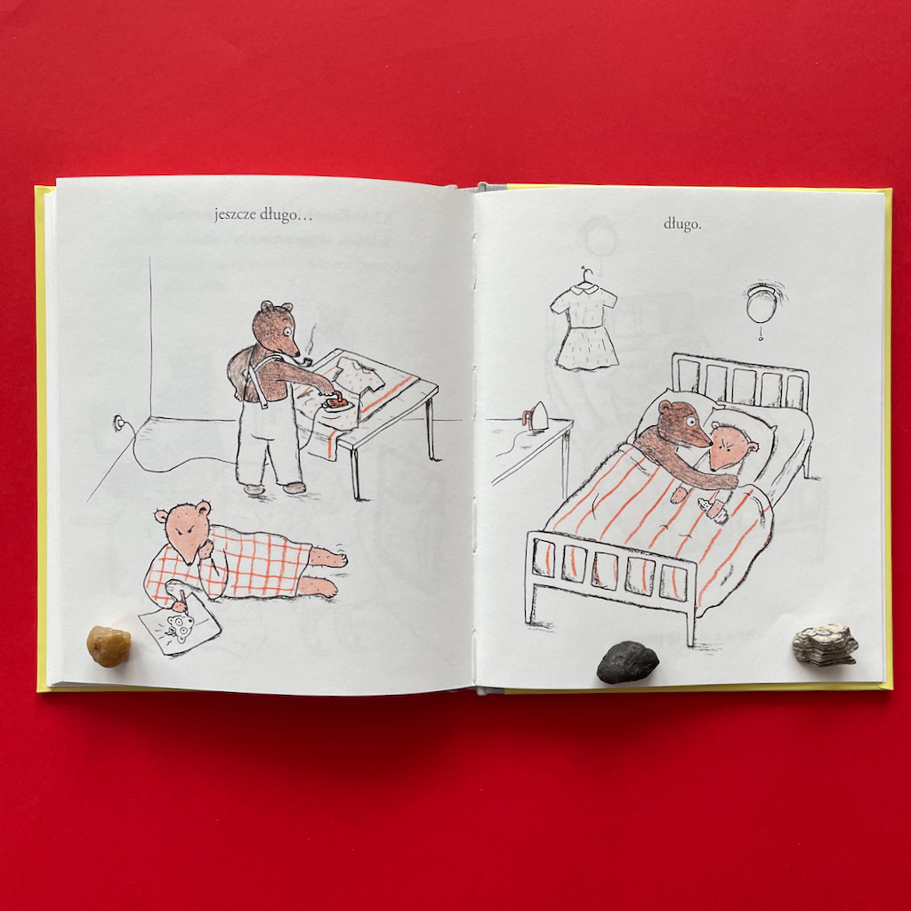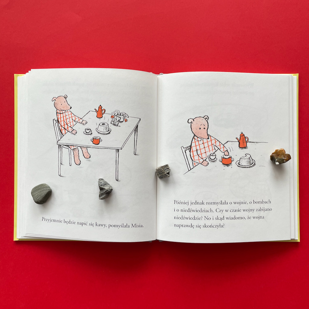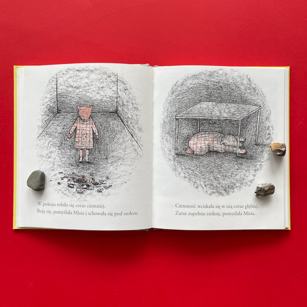 Wrócę teraz do ilustracji, które przyciągnęły mnie do niej na samym początku. Nie są one dla wszystkich. Na pewno wielu dzieciom się nie spodobają, bo są czarno-biało-czerwone i bardzo proste. Ale nas ujęły. W tak prostej formie autorka zawarła niesłychaną ilość emocji. Bardzo podoba mi się zabieg zaciemniania tła, który obrazuje pogrążanie się w rozpaczy. Całą sobą czuję wtedy ten smutek, który odczuwa Misia.