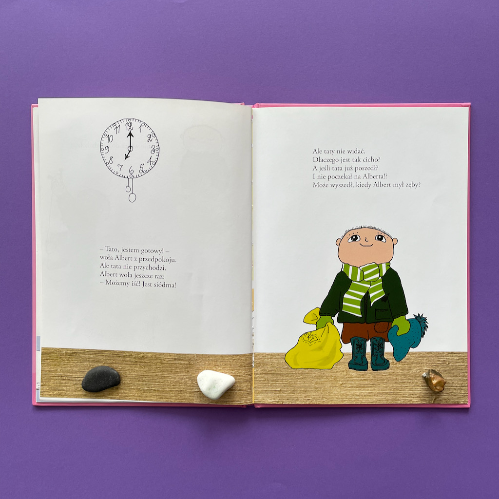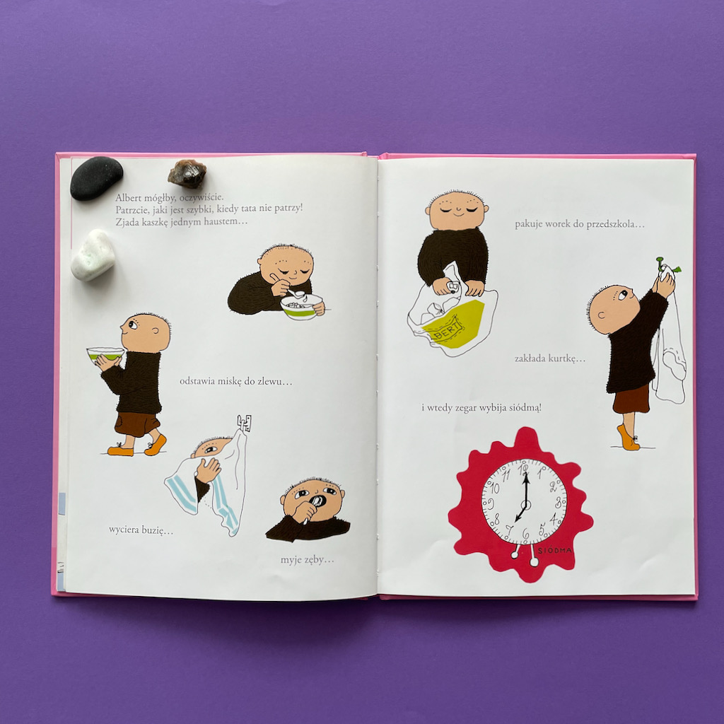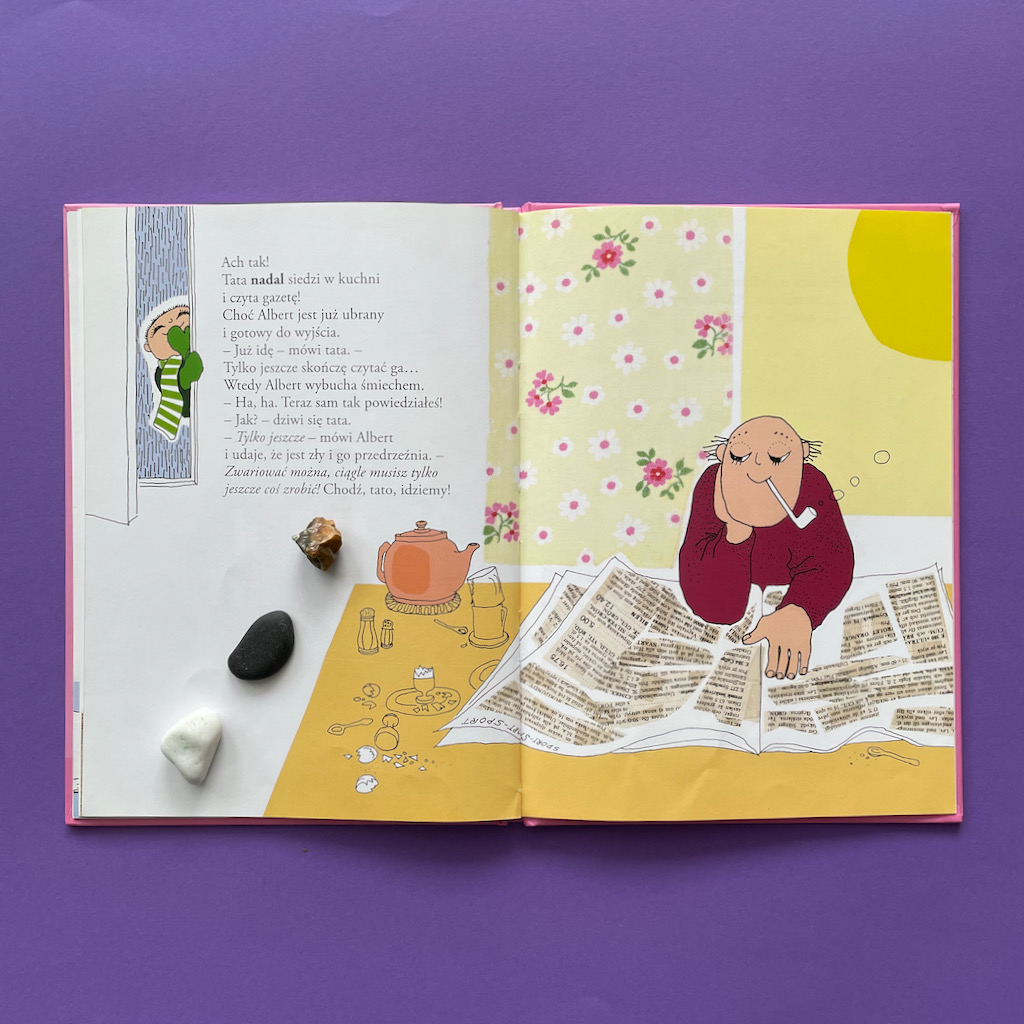 No dobrze, ale co z tym tatą Alberta? Czy on faktycznie jest taki zorganizowany, przygotowany i zniecierpliwiony długim oczekiwaniem na synka? To właśnie dowcip całej historii. Gdy Albert w końcu przyspiesza, wykonuje wszystkie potrzebne czynności i jest gotowy do wyjście, okazuje się, że… tata się zaczytał. Teraz to on musi się bardzo spiąć, żeby zdążyć. To naprawdę bardzo życiowe przedstawienie problemu. Pokazuje jak często się z dzieckiem rozmijamy. Szczególnie w definiowaniu tego, co jest ważne w danej chwili. Ale jednocześnie pokazuje, że dorośli też mają swoje słabości. Też potrafią się zagapić, zapomnieć, zająć czymś bardzo interesującym i odłożyć przez to inne rzeczy. Rzecz w tym, czy potrafimy się do tego przyznać i uznajemy, że skoro nam się to zdarza, to nie powinniśmy być zbyt surowi wobec dzieci. Czy może uważamy, że nam (dorosłym) wolno więcej, a dzieci powinny się dostosowywać?