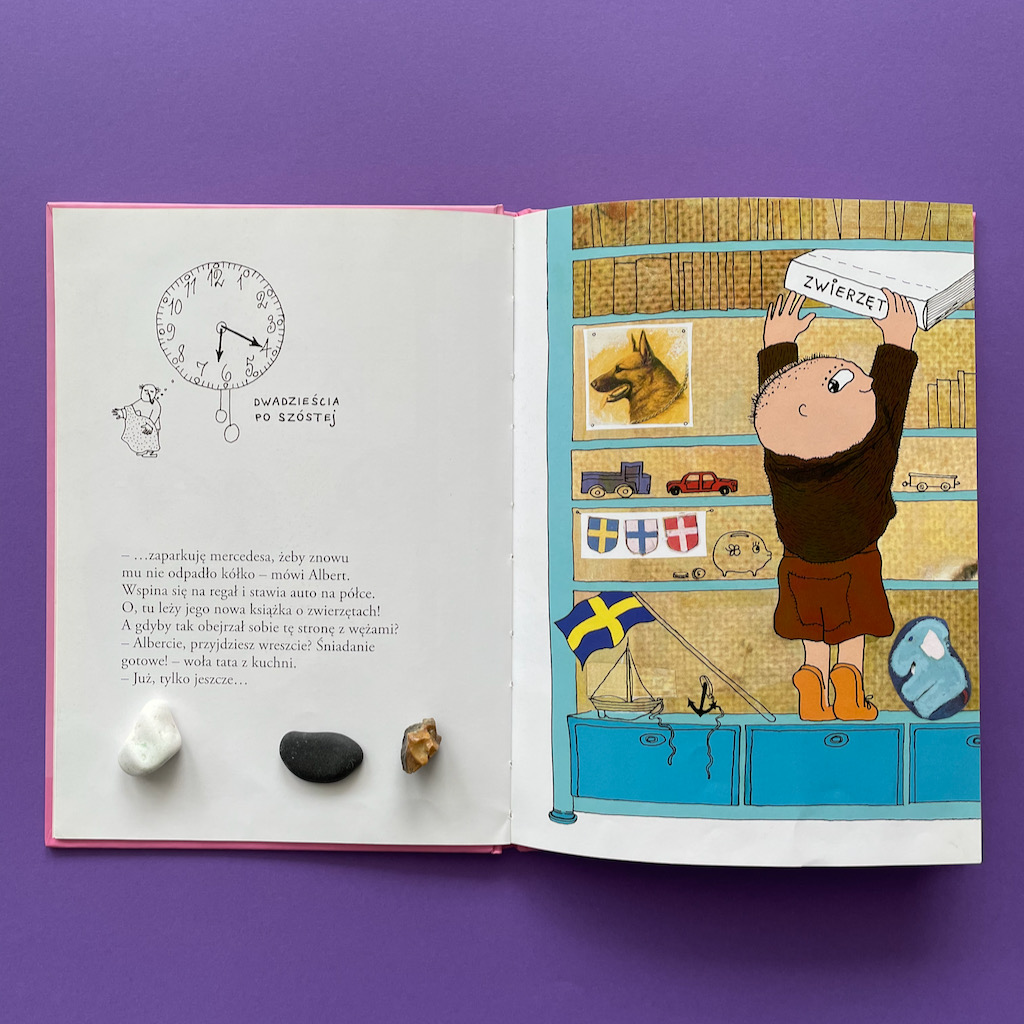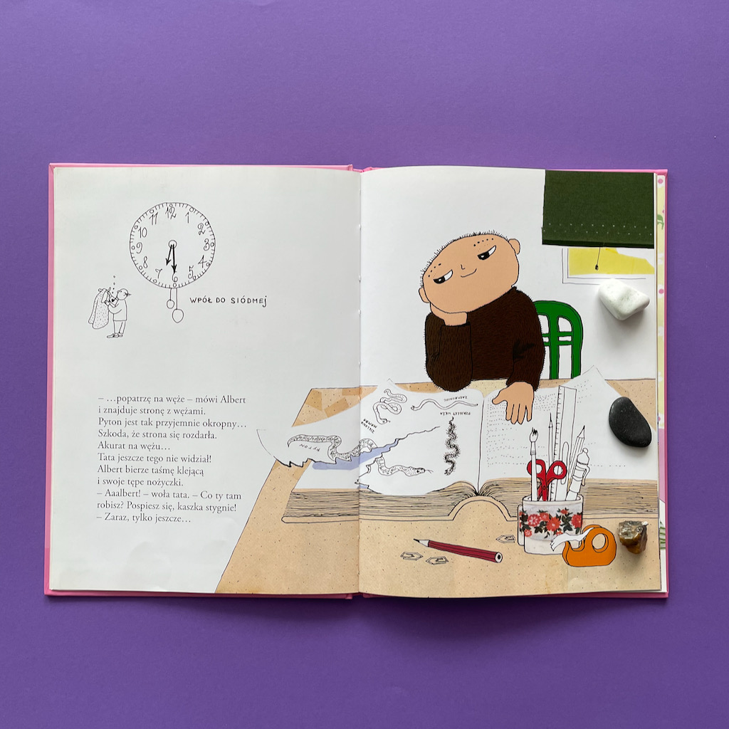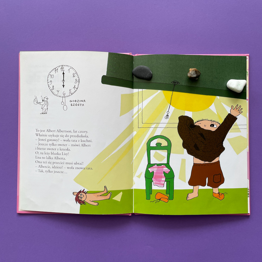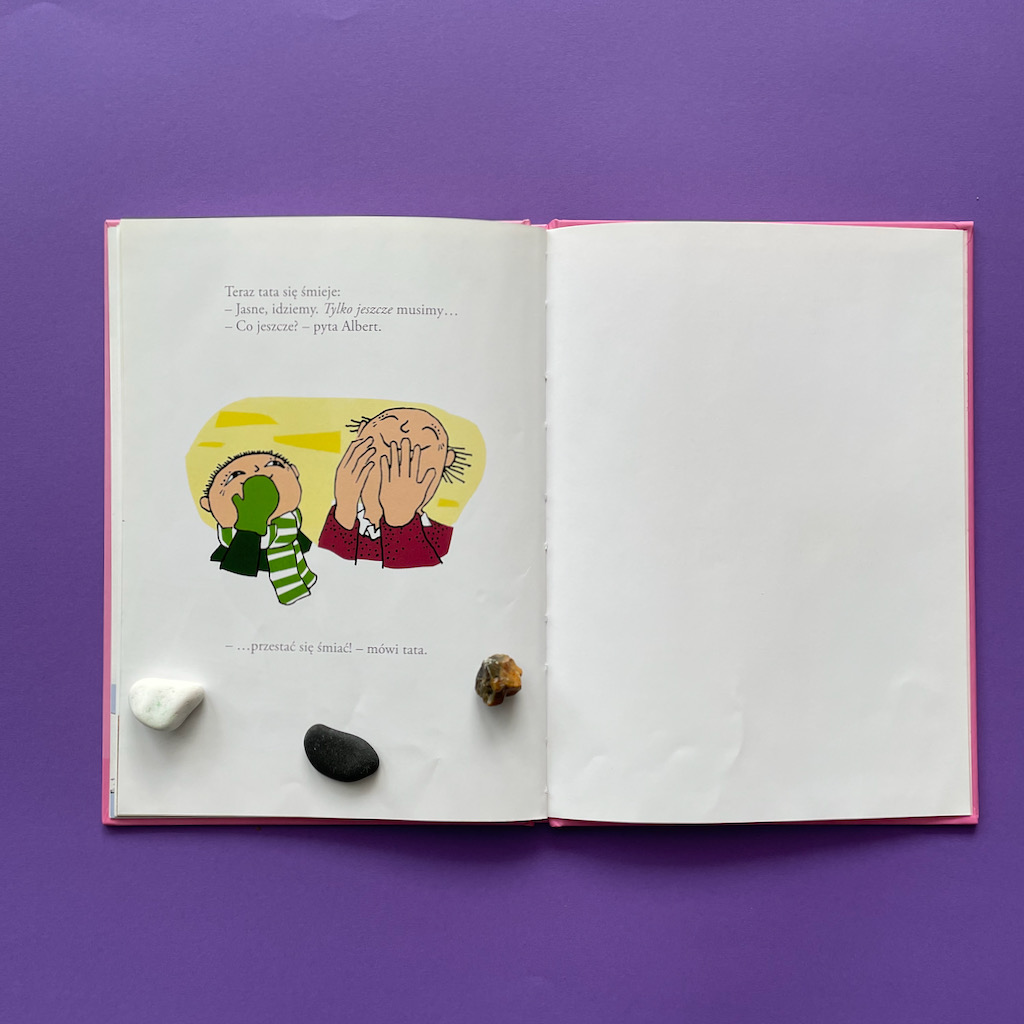 No dobrze, ale co z tym tatą Alberta? Czy on faktycznie jest taki zorganizowany, przygotowany i zniecierpliwiony długim oczekiwaniem na synka? To właśnie dowcip całej historii. Gdy Albert w końcu przyspiesza, wykonuje wszystkie potrzebne czynności i jest gotowy do wyjście, okazuje się, że… tata się zaczytał. Teraz to on musi się bardzo spiąć, żeby zdążyć. To naprawdę bardzo życiowe przedstawienie problemu. Pokazuje jak często się z dzieckiem rozmijamy. Szczególnie w definiowaniu tego, co jest ważne w danej chwili. Ale jednocześnie pokazuje, że dorośli też mają swoje słabości. Też potrafią się zagapić, zapomnieć, zająć czymś bardzo interesującym i odłożyć przez to inne rzeczy. Rzecz w tym, czy potrafimy się do tego przyznać i uznajemy, że skoro nam się to zdarza, to nie powinniśmy być zbyt surowi wobec dzieci. Czy może uważamy, że nam (dorosłym) wolno więcej, a dzieci powinny się dostosowywać?