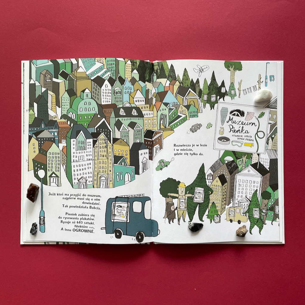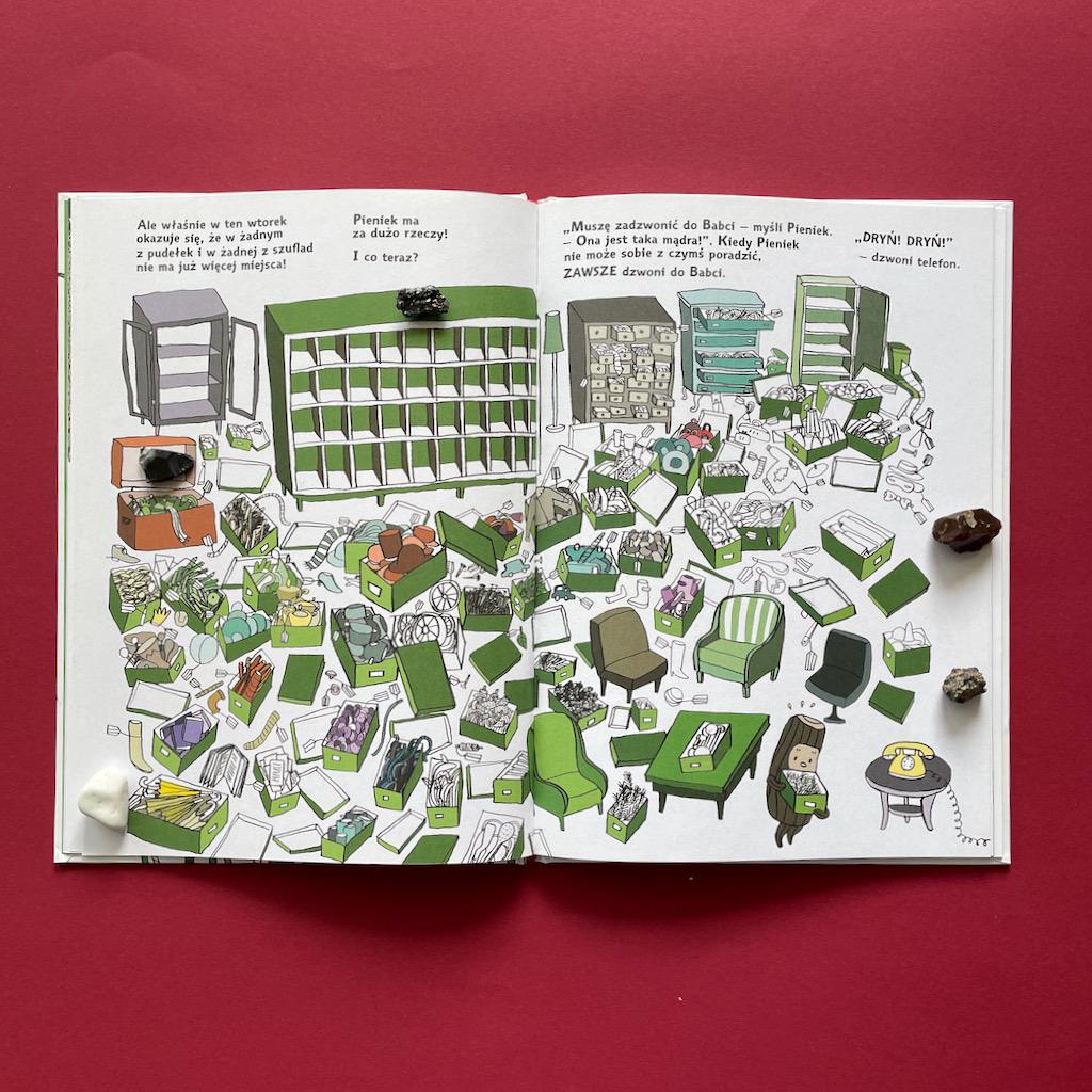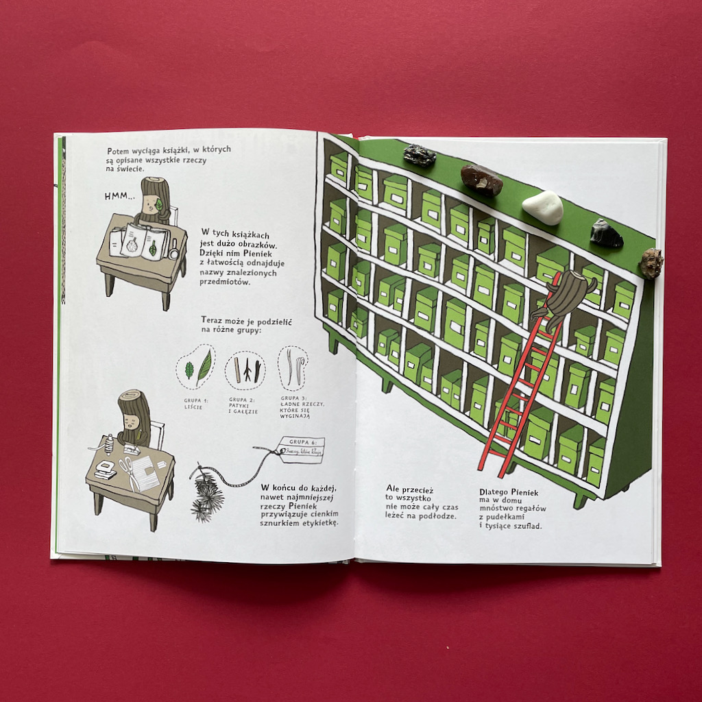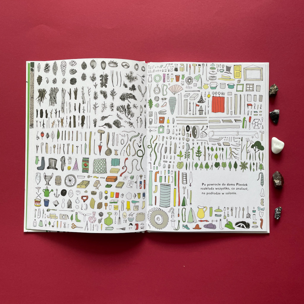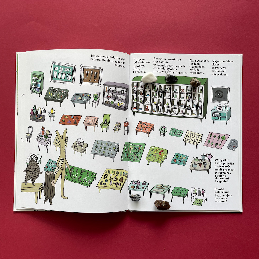 Bardzo podoba mi się zakończenie całej historii. Po skatalogowaniu eksponatów Pieniek zaczyna roznosić rzeczy w miejsca, w których powinny się znaleźć. To co dała natura – wraca do lasu. To co jeszcze może się przydać – do antykwariatu lub przyjaciół. Śmieci są segregowane do odpowiednich koszy. A na koniec zostają rzeczy, z których można stworzyć coś nowego. Całe mnóstwo tematów do rozmów.
