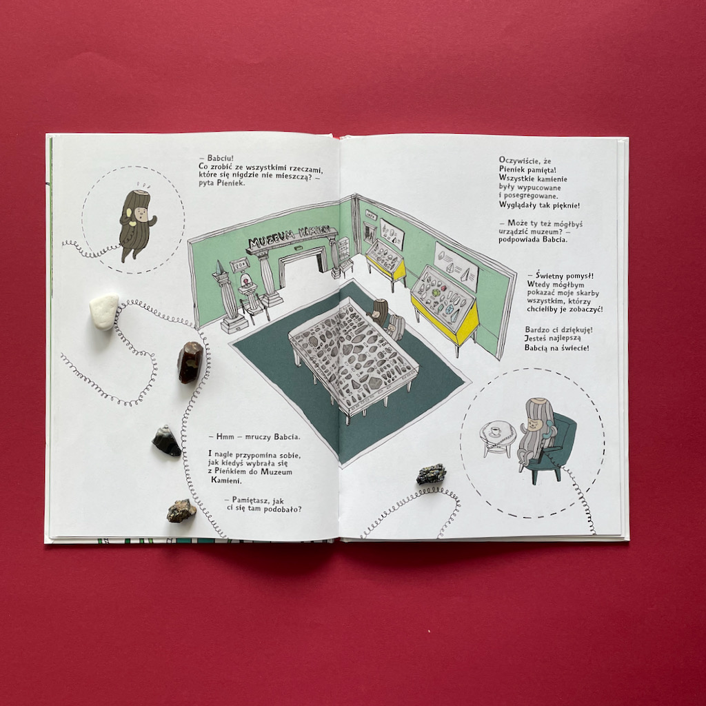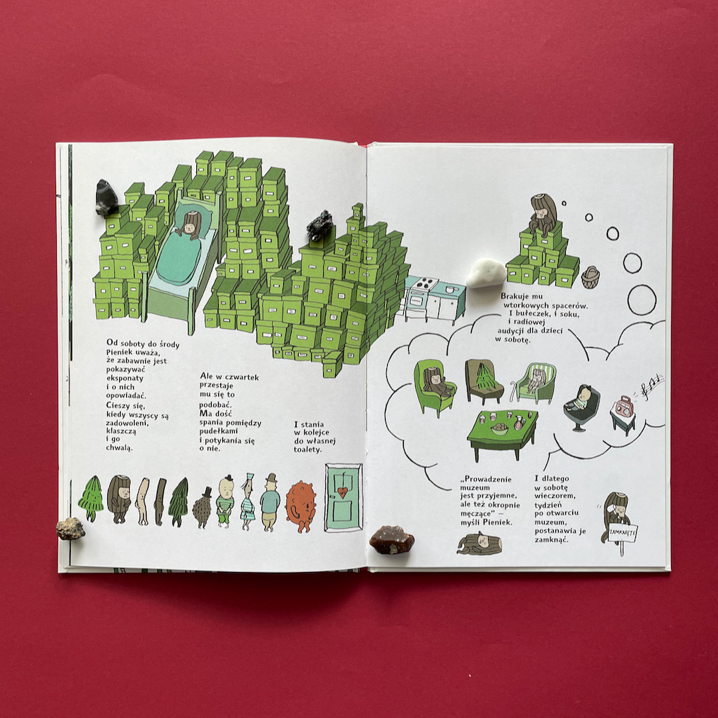 Mamy więc historię o tym, jak tworzone są zbiory, jak się je porządkuje, opisuje, organizuje wystawę i kataloguje eksponaty. Jest też emocjonalne podejście tematu, czyli to z czym mierzą się nasze dzieci. Dla nich każda znaleziona rzeczy to skarb, z którym trudno się rozstać. Dla rodziców to często rupiecie. Nie możemy jednak deprecjonować dziecięcych emocji. Ta książka pomoże wam podsunąć dzieciom pomysł na to, jak zachować kolekcję bez gromadzenia jej na półkach. Jeśli to nie przejdzie, to może zachęci dzieci przynajmniej do segregowania rzeczy i chowania do pudełek. Może dobrym pomysłem będzie wybranie jednej półki i robienie na niej czasowych wystaw, a z reszty skarbów zrobienie magazynu, tak jak w prawdziwym muzeum.