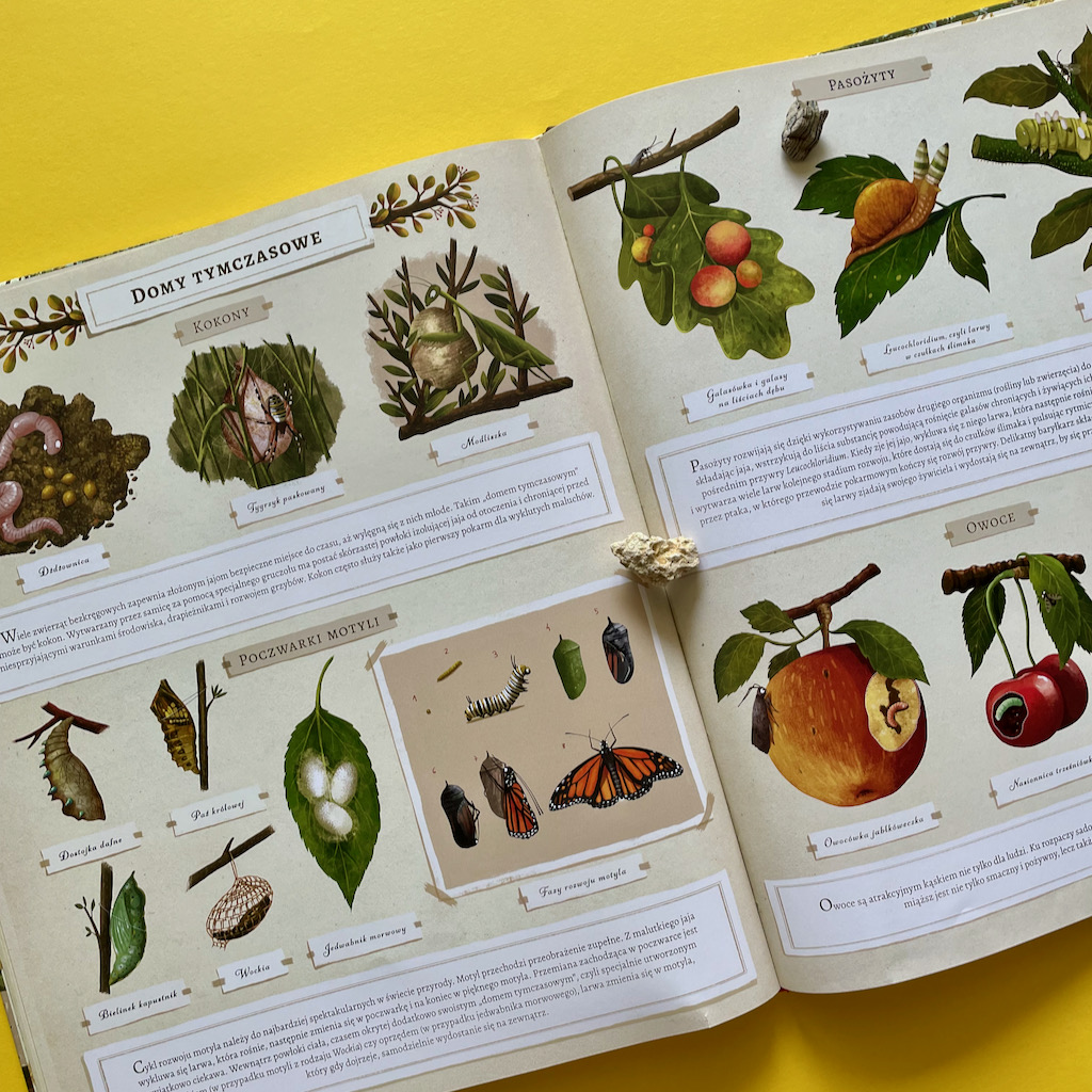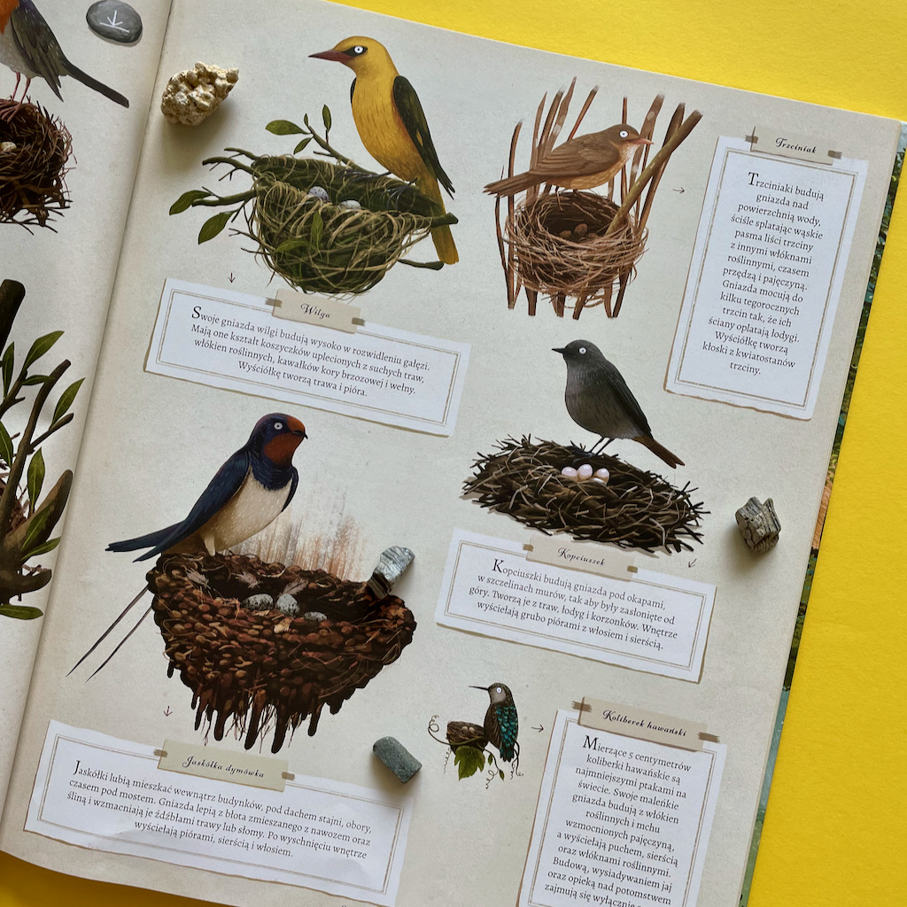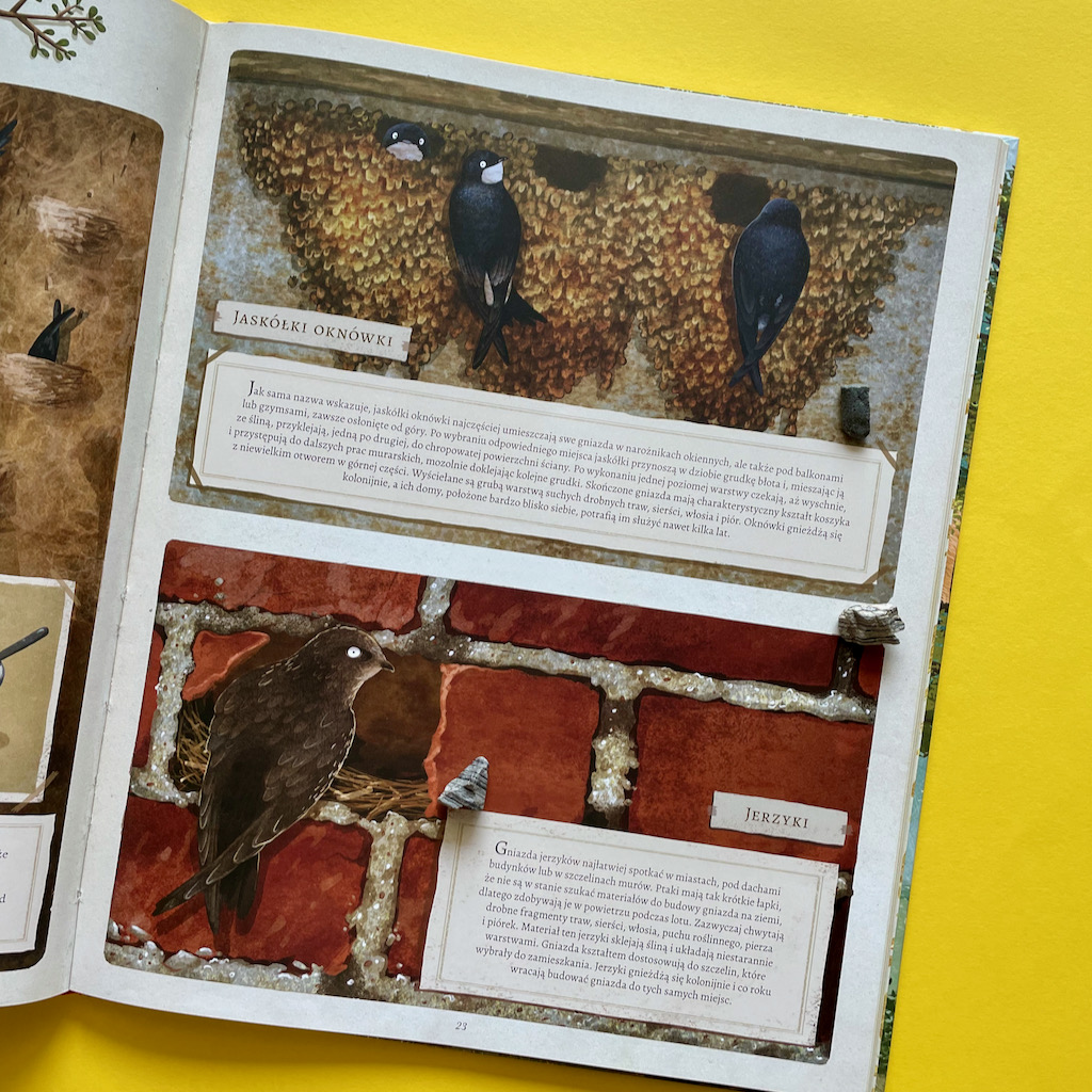 Ale do rzeczy… W albumie jest dość obszerny spis treści. Mamy rozdział o tym, z jakich materiałów zwierzęta budują swoje domy i jakie są ich typy. Są rozdziały o otwartych i zamkniętych rodzajach gniazd, o ptasich osiedlach, budowlach owadów, domach termitów, siedzibach pająków, muszlach, budowlach wodnych, podziemnych, a nawet inspiracjach, które ludzie czerpią z tych konstrukcji i wykorzystują to budowy ludzkich domostw. Każda ilustracja opatrzona jest szczegółową notatką i tworzy z nią spójną całość. Niesłychane, ile jest rodzajów ptasich gniazd. To daje do myślenia, bo burzy wtłaczany dzieciom stereotyp, kształtu, budowy i umieszczenia ptasiego gniazda. Podobnie zresztą jest z domami pszczół.