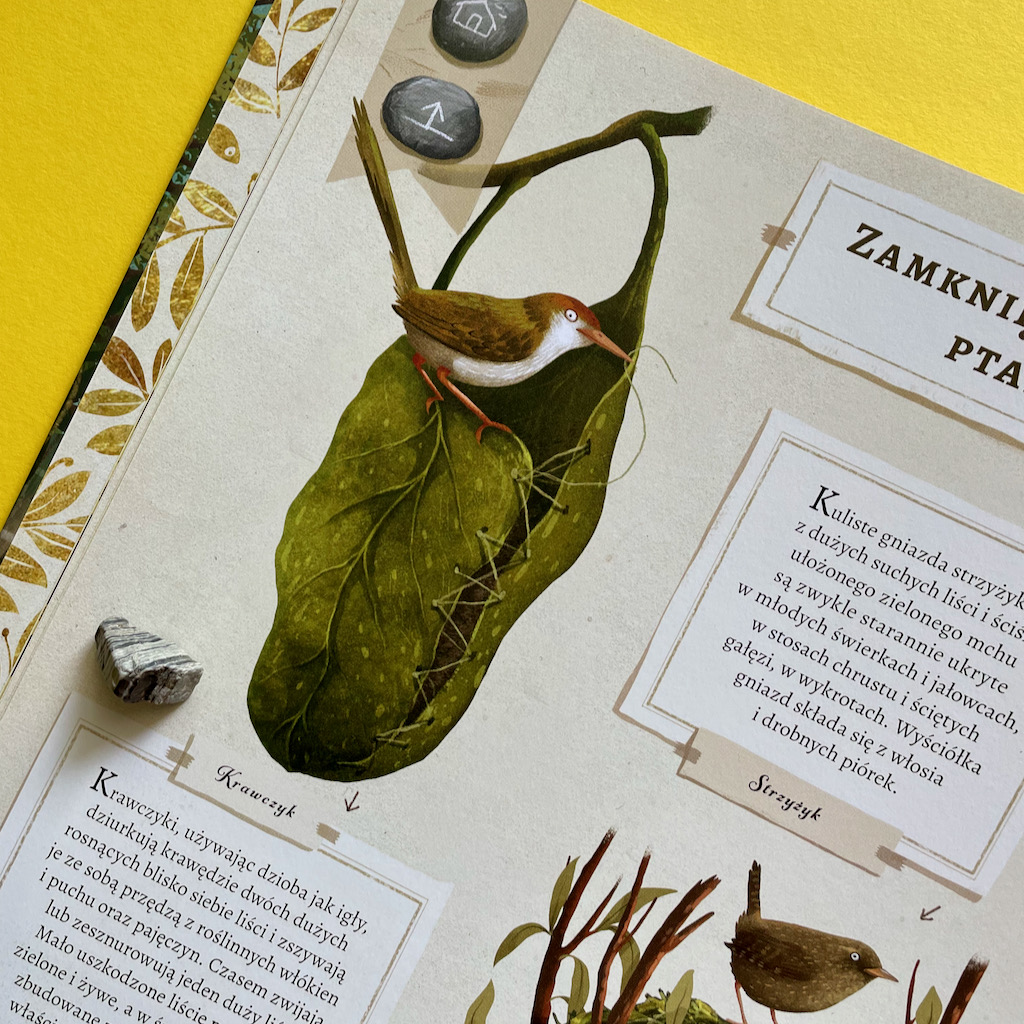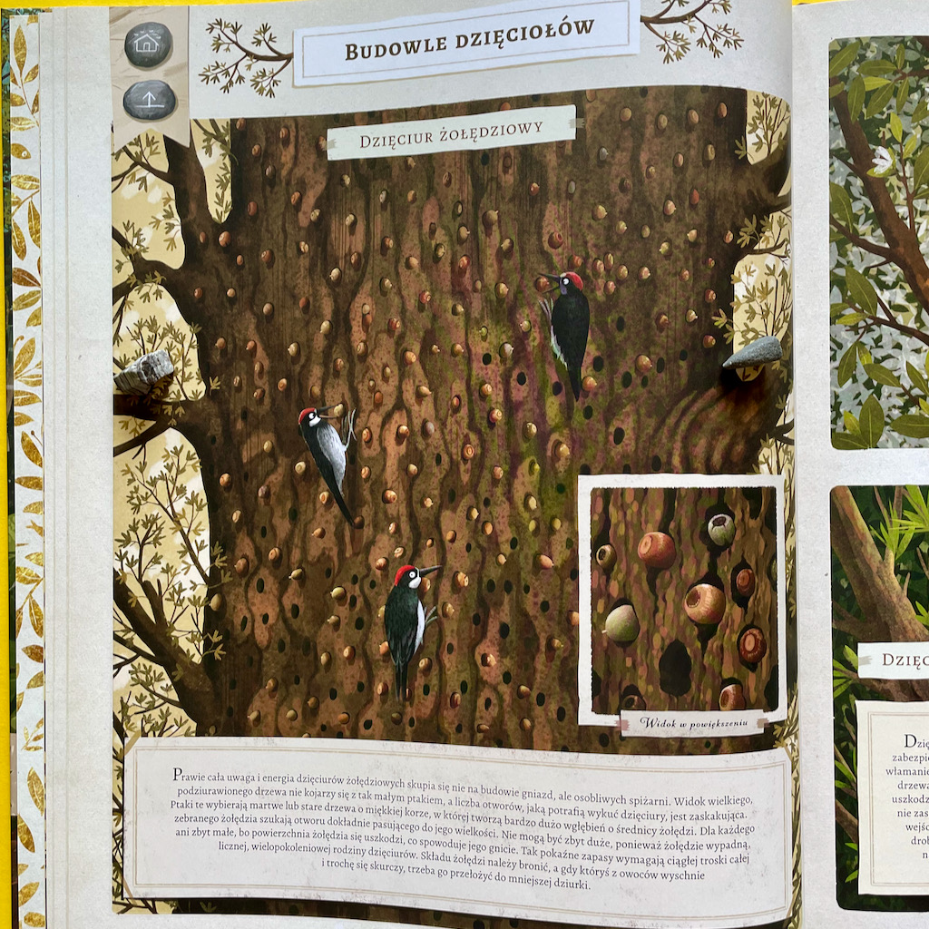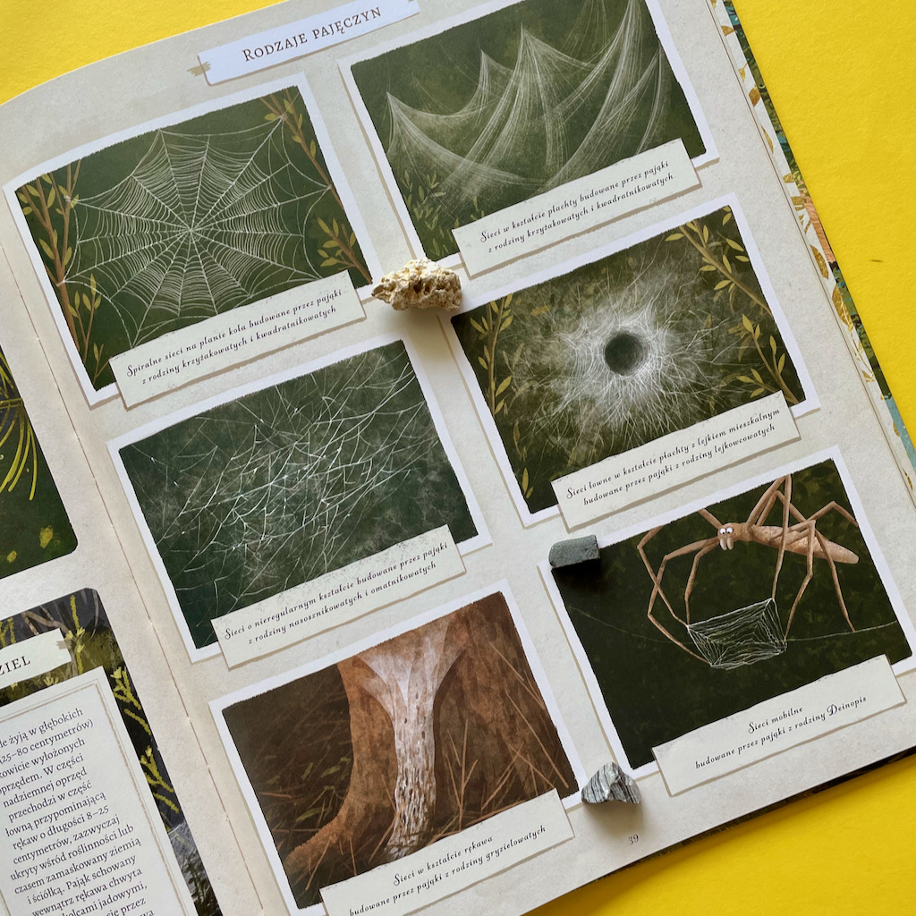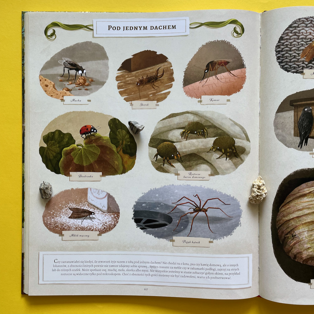 Ale do rzeczy… W albumie jest dość obszerny spis treści. Mamy rozdział o tym, z jakich materiałów zwierzęta budują swoje domy i jakie są ich typy. Są rozdziały o otwartych i zamkniętych rodzajach gniazd, o ptasich osiedlach, budowlach owadów, domach termitów, siedzibach pająków, muszlach, budowlach wodnych, podziemnych, a nawet inspiracjach, które ludzie czerpią z tych konstrukcji i wykorzystują to budowy ludzkich domostw. Każda ilustracja opatrzona jest szczegółową notatką i tworzy z nią spójną całość. Niesłychane, ile jest rodzajów ptasich gniazd. To daje do myślenia, bo burzy wtłaczany dzieciom stereotyp, kształtu, budowy i umieszczenia ptasiego gniazda. Podobnie zresztą jest z domami pszczół.