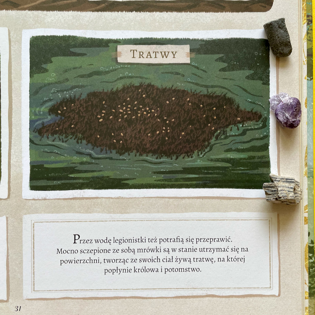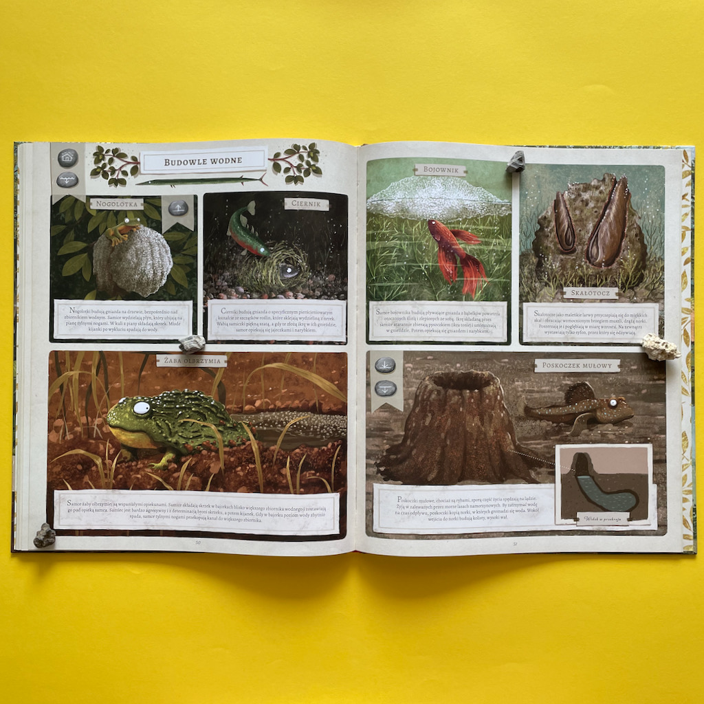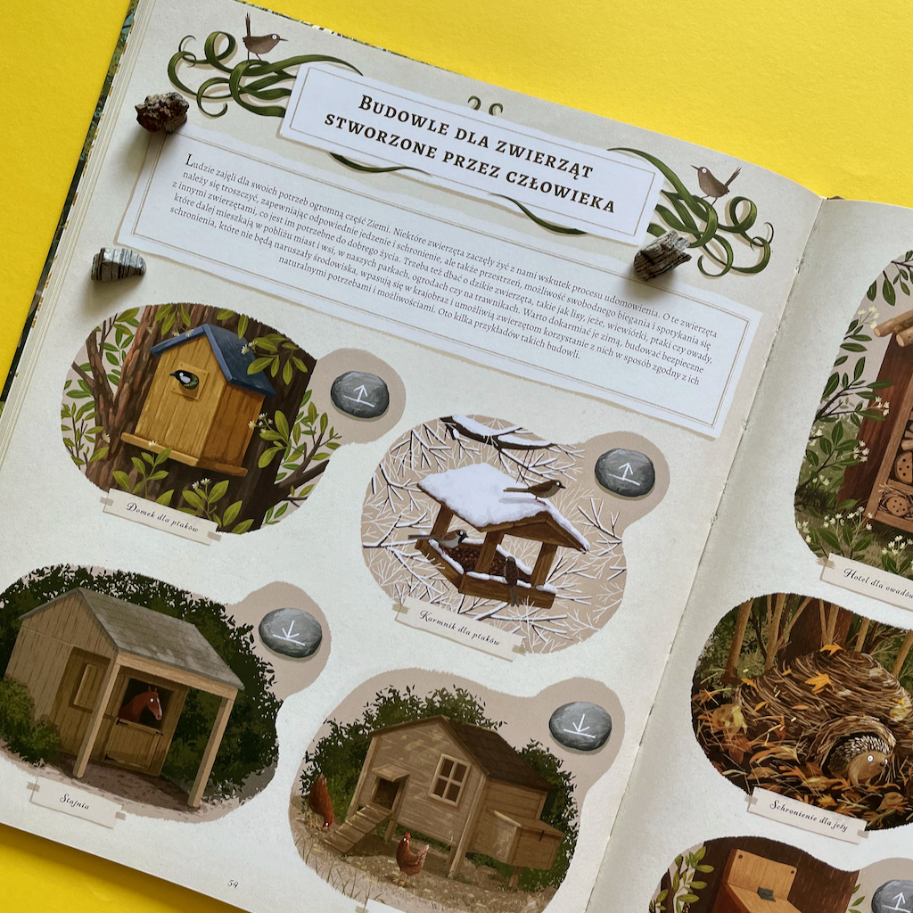 Czasem jednak możecie natrafić na kopiec, norę, albo jakiś zupełnie inny twór i nie będziecie umieli odpowiedzieć, do jakiego zwierzęcia należy, z czego jest zbudowane i dlaczego w ogóle pływa na wodzie zamiast być na gałęzi. Co robicie w takich sytuacjach? Mówicie tylko „nie wiem” i idziecie dalej? Czy może próbujecie rozwiązać zagadkę? Dzisiaj oczywiście najlepiej poszukać informacji w Internecie. Wystarczy zrobić zdjęcie naszego znaleziska, a Google zaraz nam podpowiedzą co to jest, kto to zamieszkuje i z czego to jest zrobione. Ale ja proponuję wam książkę, która jest estetycznym arcydziełem. Która was zachwyci i zachęci do poznawania świata zwierząt.