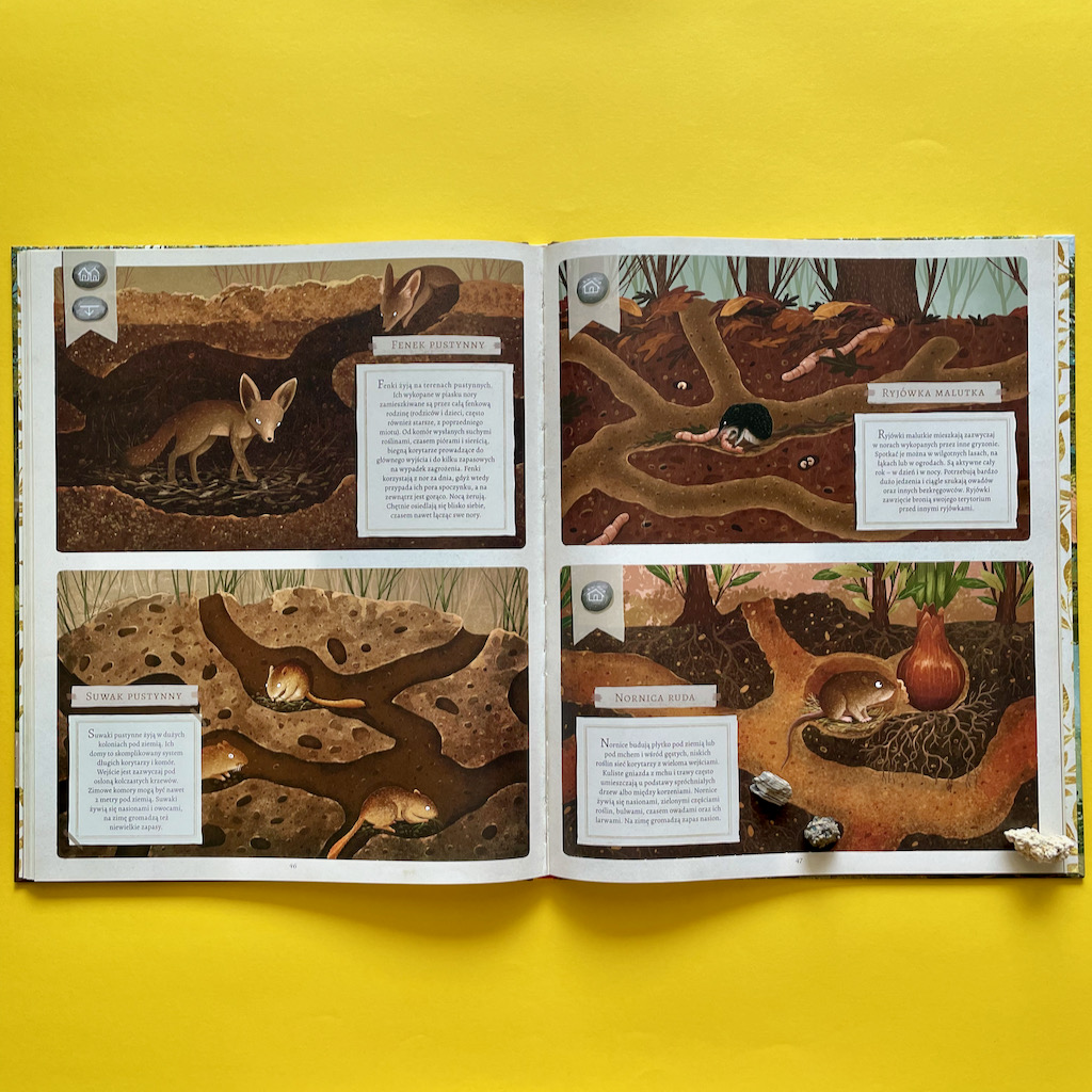 Co budują zwierzęta to coś pomiędzy książką i albumem przyrodniczym. Zilustrowana i napisana przez Emilię Dziubak. Na blogu pojawiały się już moje zachwyty na temat ilustratorskiego talentu autorki, ale uważam, że ich nigdy dość. To, co zmalowała w tej książce, jest absolutnie genialne. Trudno oderwać wzrok od tych ilustracji. Nie mam pojęcia jak ona to robi, że ilustracje są tak miękkie i przytulne, a zarazem realistyczne. Magia!