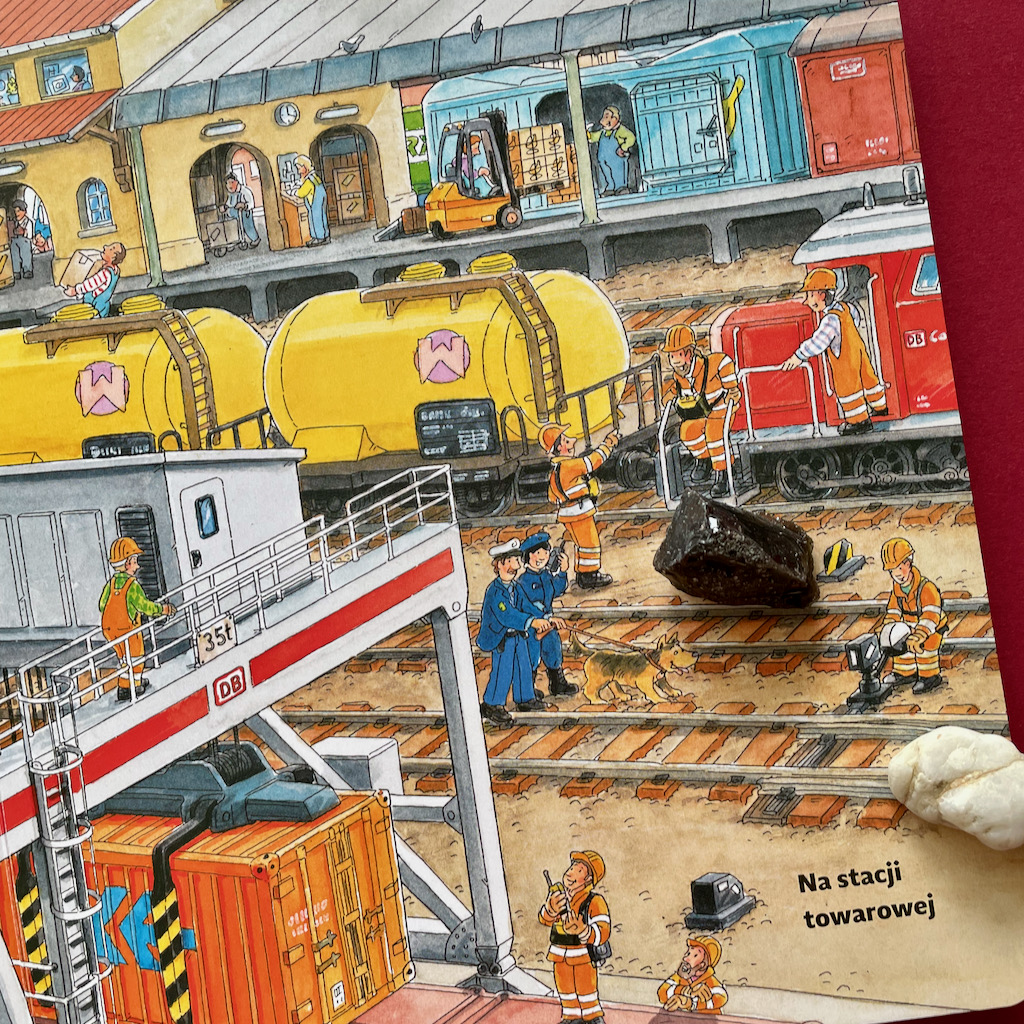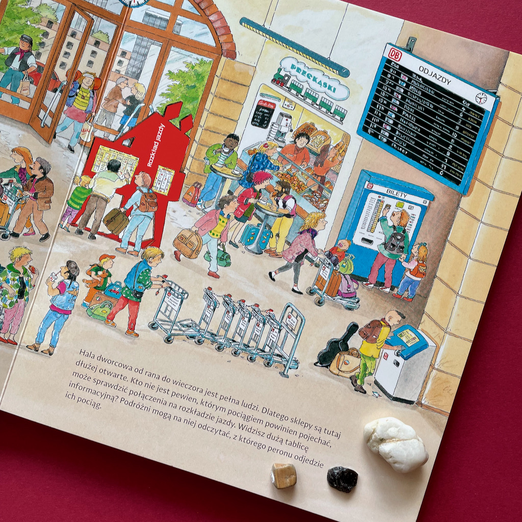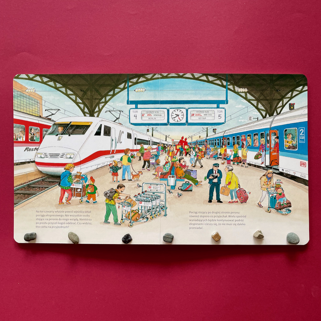 Po co w ogóle są takie książki? Cóż to za problem wsiąść do pociągu (no właśnie… nie byle jakiego!) i dojechać do celu. Dorosłym wydaje się to oczywiste, ale dla dzieci to jest inny świat. Wystarczy zatrzymać się z dzieckiem na środku dworca, przykucnąć przy nim i zobaczyć świat z jego perspektywy. Natychmiast poczujemy jakie wszystko jest wielkie, nieznane, niezrozumiałe. Poczujemy wokół siebie pośpiech, poczujemy lęk przez zgubieniem się i przed byciem zadeptanym. Usłyszymy hałas, który będzie bardziej przytłaczający, bo nawet nie będziemy mogli dostrzec skąd i dlaczego pochodzą jakieś dźwięki. Wtedy zrozumiemy dlaczego każdą podróż należy z dzieckiem przebyć w głowę, na mapie, w książce, w rozmowach. Nie ważne jak, ważne by zrobić to odpowiednio wcześniej, przygotować je na tę podróż i zminimalizować jego stres.