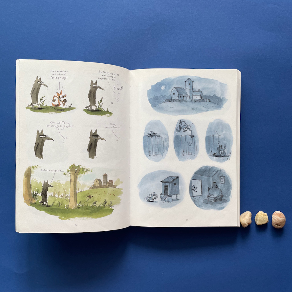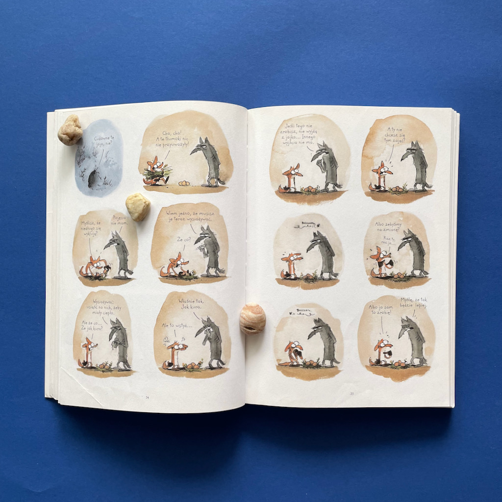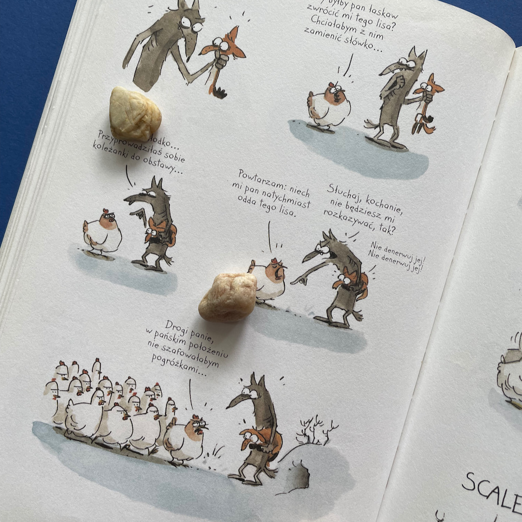 Podczas nauki Lis zdobywa trzy kurze jajka. Jajkami nie naje się jednak ani Lis, ani Wilk, więc trzeba je wysiedzieć, aby sobie ten obiad wyhodować. Tylko co się dzieje, gdy już się te jaja wysiaduje? Jak reagują kurczaki zaraz po wylęgnięciu? No tego to już wam zdradzać nie chcę, ale możecie być pewni, że to początek rewolucji w życiu Lisa. Zmian, które nadciągają, mimo że się ich nie spodziewał.