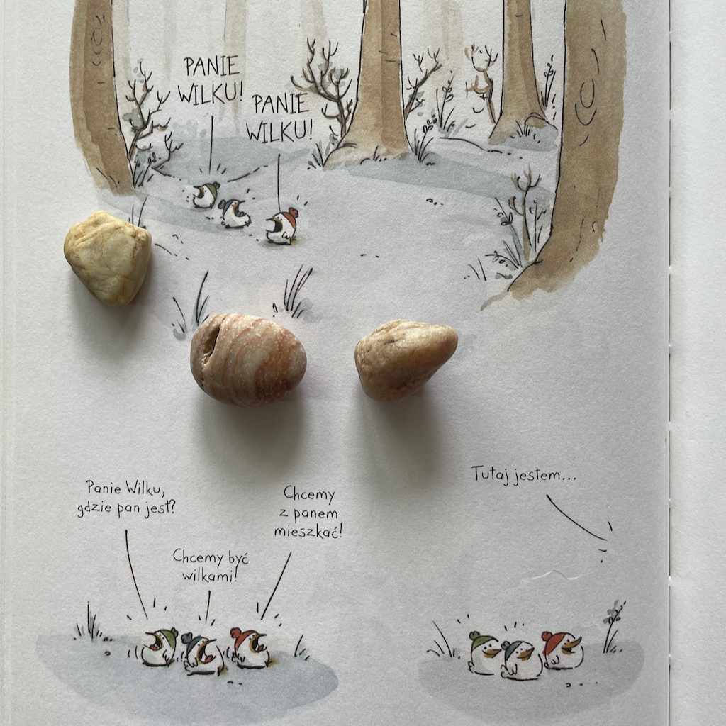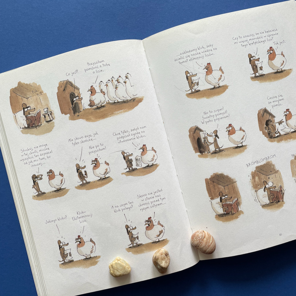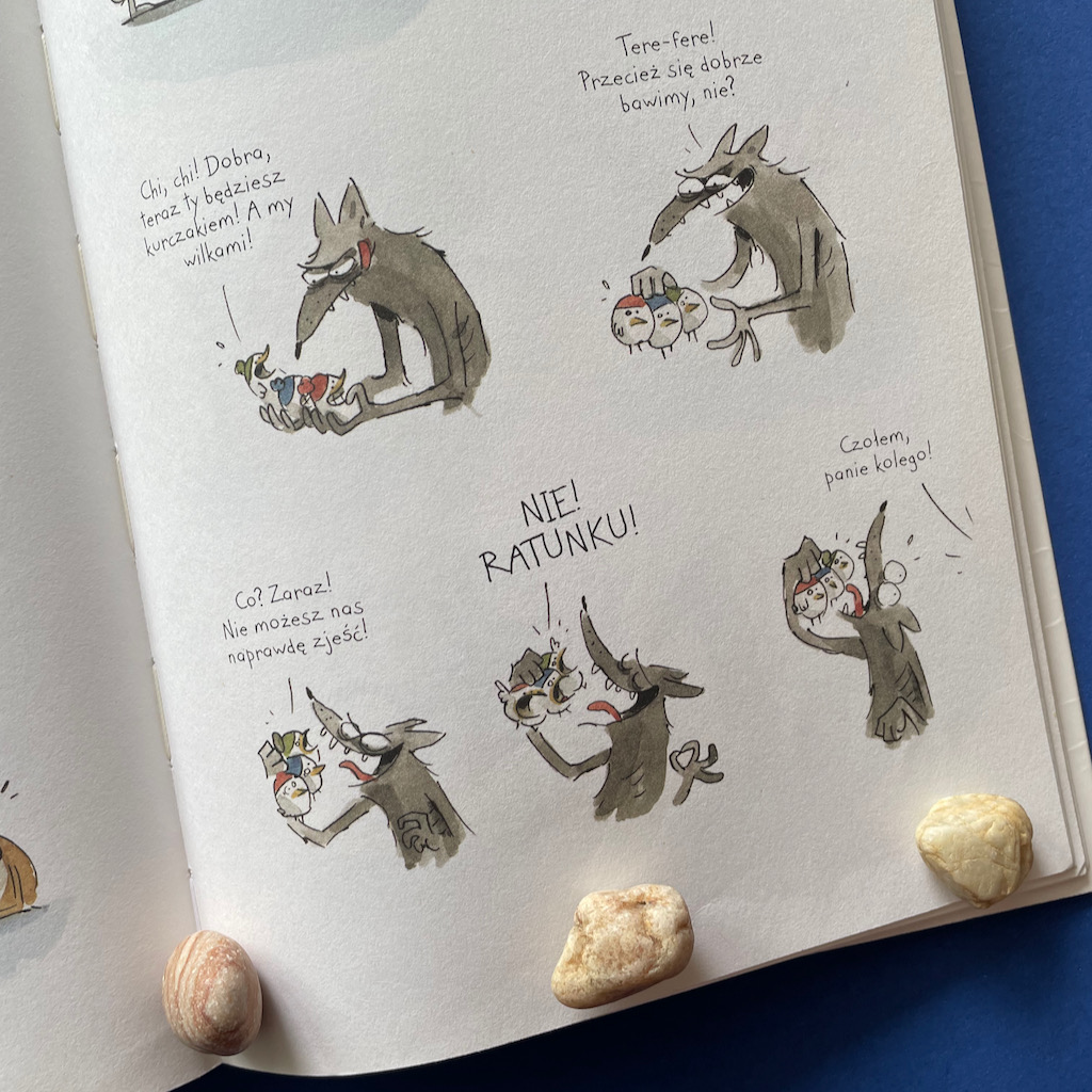 Podczas nauki Lis zdobywa trzy kurze jajka. Jajkami nie naje się jednak ani Lis, ani Wilk, więc trzeba je wysiedzieć, aby sobie ten obiad wyhodować. Tylko co się dzieje, gdy już się te jaja wysiaduje? Jak reagują kurczaki zaraz po wylęgnięciu? No tego to już wam zdradzać nie chcę, ale możecie być pewni, że to początek rewolucji w życiu Lisa. Zmian, które nadciągają, mimo że się ich nie spodziewał.