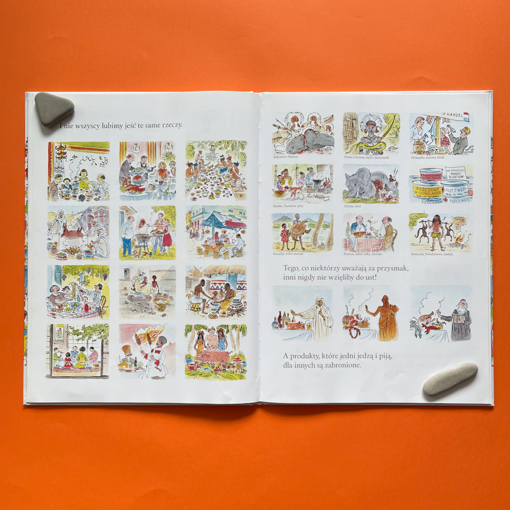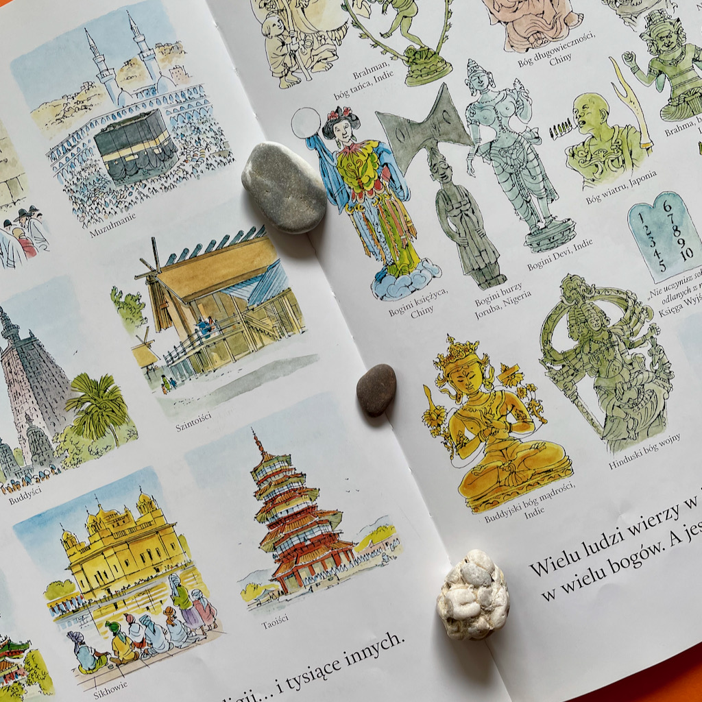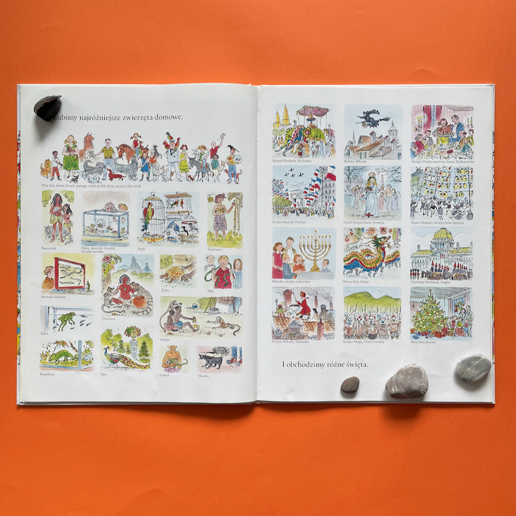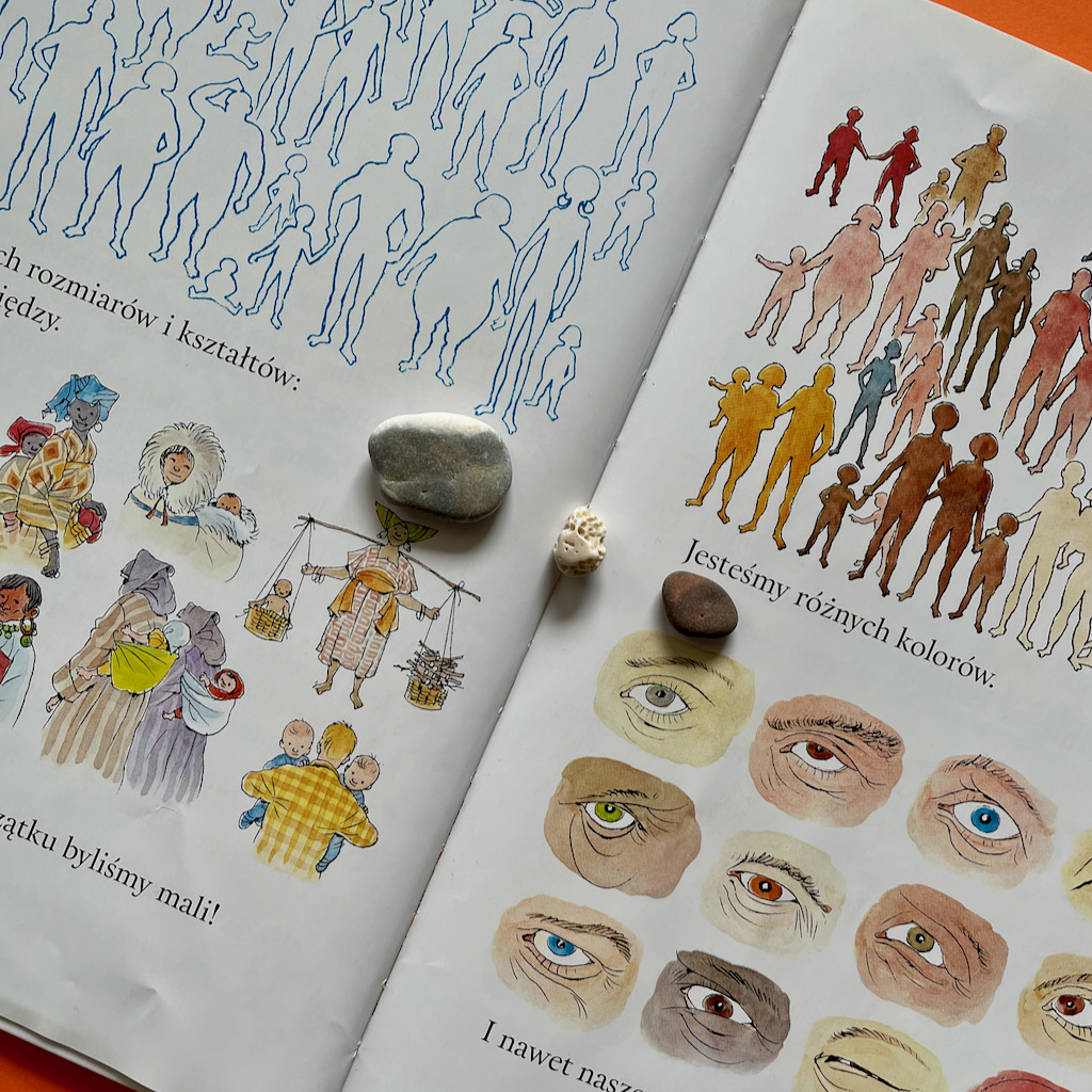 Kiedy już oglądniecie też wszystkie niesamowite ilustracje, otworzą się przed wami drzwi to wielu rozmów. Obracam kolejne strony i te tematy po prostu się mnożą. Dlatego wyglądamy inaczej, co się różni w naszym wyglądzie i dlaczego – czy to cokolwiek oznacza? Dlaczego mamy różne domy – od czego to zależy? Jak to jest z tym Bogiem? Czy to możliwie, żeby było ich aż tylu? Co ludzie jedzą na obiad i czy to nie jest obrzydliwe? A dlaczego niektórych rzeczy nie mogą jeść? Dlaczego niektórzy są mądrzy, a inni niekoniecznie? Dlaczego większość jest dobra, ale część łamie prawo? Czy tacy się urodzili, czy coś ich do tego popchnęło? Jak ludzie spędzają czas, bawią się, w co grają w różnych częściach świata i czy te sposoby są podobne do naszych, czy inne? Które nas ciekawią i chcielibyśmy ich spróbować?