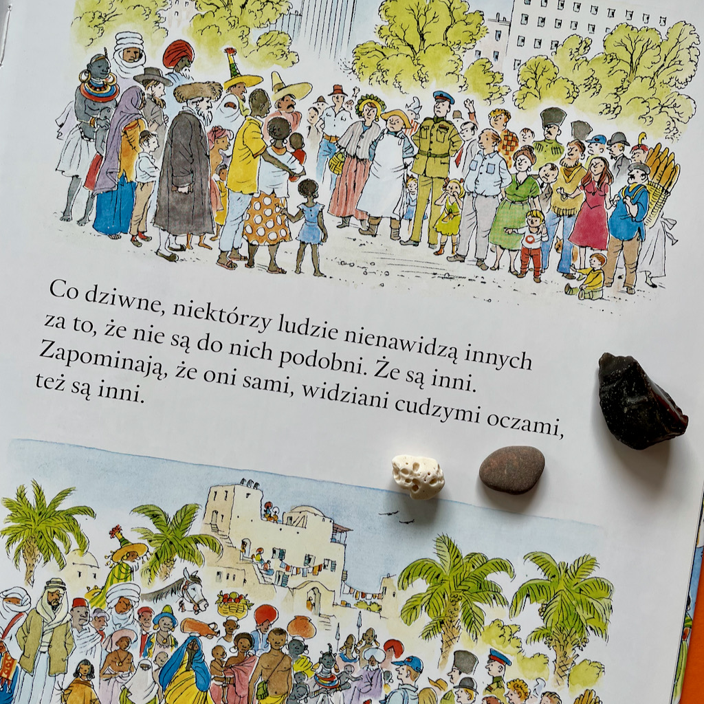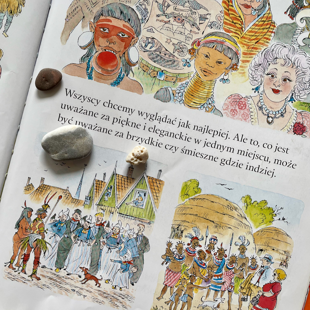 Bardzo podoba mi się fragment, w którym autor pisze, że to co jednych cieszy, innych może smucić oraz to co dla jednych jest piękne, dla innych może być brzydkie. To doskonały wstęp do rozmów z dzieckiem o tym, że nie tylko gusta mamy inne, ale też wychowujemy się w innych częściach świata, innych kulturach, wierzeniach, warunkach naturalnych, więc ludzie na dwóch krańcach Ziemi mają zupełnie inne podejście do życia.