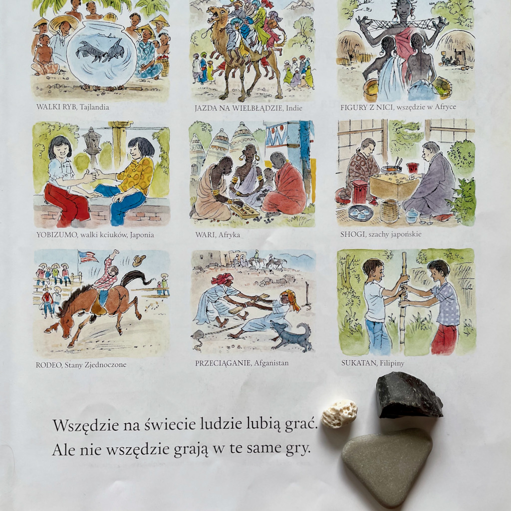 Znajdziecie wiele książek, ktore poruszają te tematy, ale w tej są one szczególnie zilustrowane. Skala różnorodności jest tutaj ogromna. Każdy temat jest zobrazowany wieloma przykładami. Bardzo wciągające jest oglądanie ich, poznawanie nazw, zastanawianie się np. na czym polega dana gra lub jak się zachowuje to zwierzę.