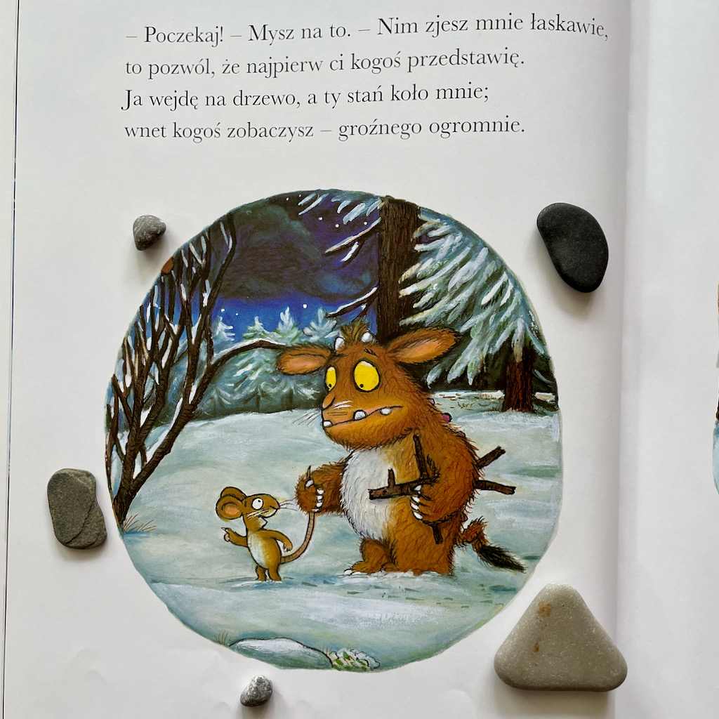 Można założyć, że to książka wyłącznie rozrywkowa, ale ja mimo wszystko wyciągam z niej nieco wyciągam. Poza wspólnym recytowaniem, zabawą słowem i radością z samej historii, widzę tu okazję do rozmowy z dzieckiem o narażaniu się na niebezpieczeństwa. Córeczka Gruffala nie słucha jego rad, wychodzi z domu w ciemną, zimną noc, a potem musi wracać w popłochu. Historia kończy się szczęśliwie, ale uważam, że to dobry pretekst, by przypomnieć dziecku, że łamanie pewnych zasad (zwłaszcza tych związanych z bezpieczeństwem) może się kończyć tragicznie.