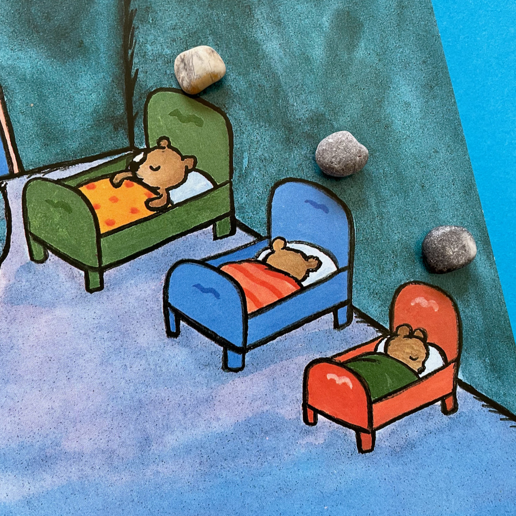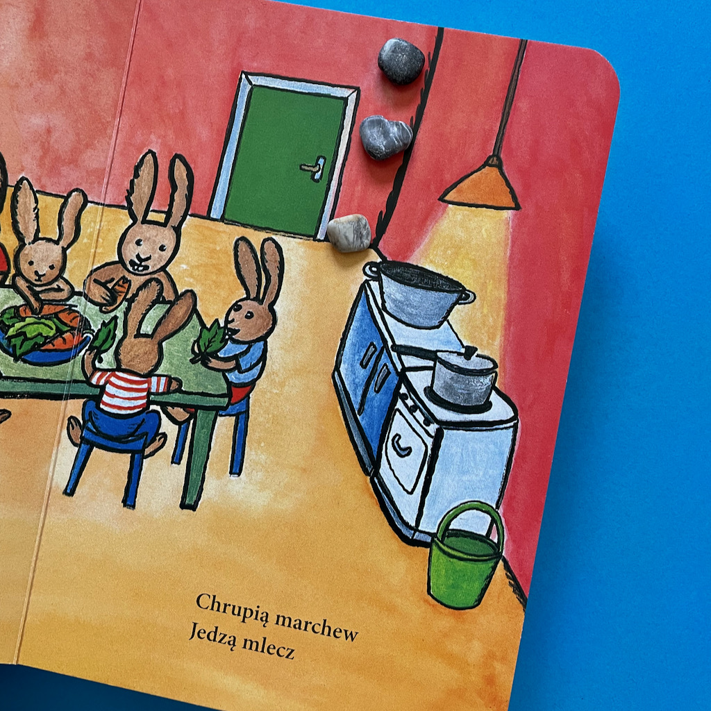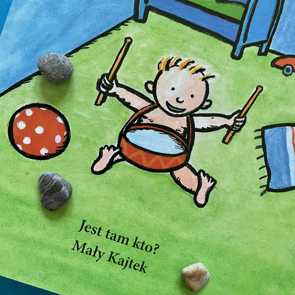W każdym pokoju, po przeczytaniu głównego tekstu, bawiliśmy się w wyszukiwanie różnych elementów. Mowa Tymka dopiero się rozwijała, więc wielu rzeczy nie umiał nazwać, ale potrafił je wskazać, a to już poważny krok w rozwoju mowy. Potem mówił swoimi słowami, a z czasem prawidłowo nazywał wszystkie przedmioty. Na pytania, które mu zadawałam, na początku opowiadał tylko wskazaniem, potem jednym słowem, a na końcu próbował układać proste zdania.