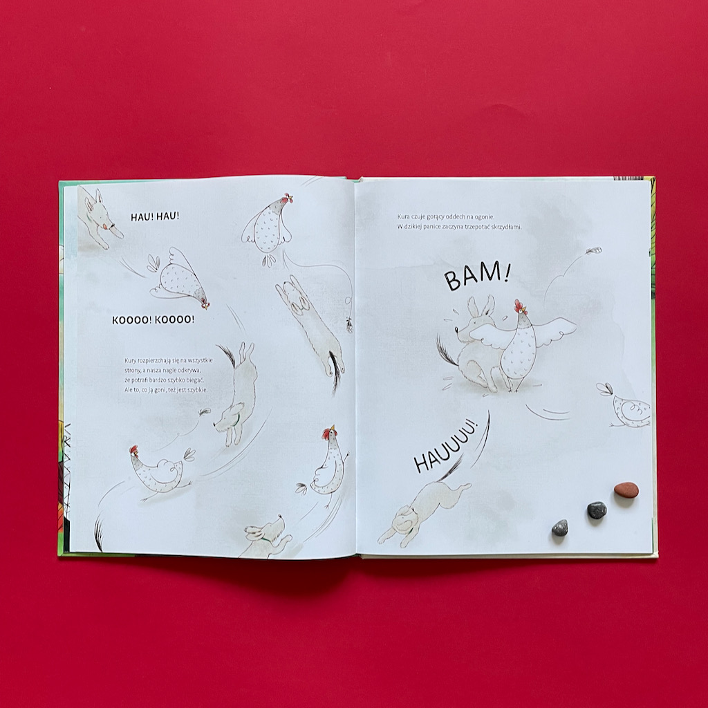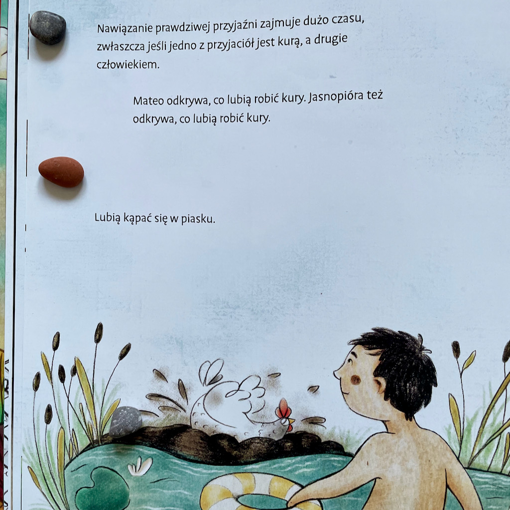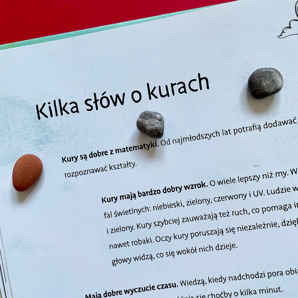 Podczas pierwszego czytania padały pytania: „Mamo, ale dlaczego kury kąpią się w piasku, a nie w wodzie?”; „Mamo, czy ona nie spadnie z tego roweru?” – nie znałam na nie odpowiedzi. Na szczęście okazało się, że na końcu książki umieszczonych jest kilka faktów o kurach, więc znaleźliśmy tam wszystkie potrzebne informacje. Dowiedzieliśmy się, że kury są zaskakującymi, zupełnie niedocenionymi zwierzętami. Większość bardzo nas zaskoczyła i teraz zupełnie inaczej patrzymy na te ptaki. Nie będę Wam oczywiście zdradzać tych ciekawostek, ale zapewnia Was, że są niezwykle ciekawe i warto je poznać!