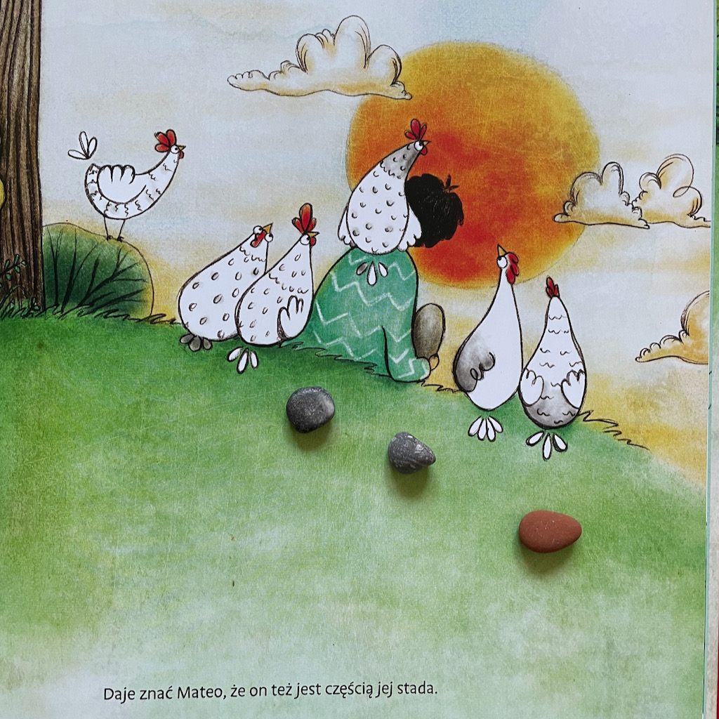Mateo odkrywa, co lubią robić kury. Jasnopióra też odkrywa, co lubią robić kury.