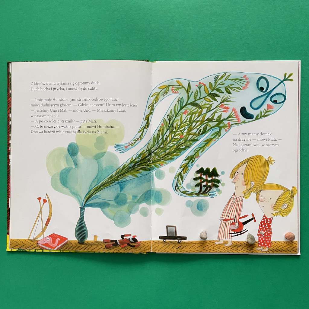 Pewnego dnia przynoszą z targu staroci kilka przedmiotów. Jednym z nich jest stara butelka. Gdy ją odkorkowują wydobywa się z niej dym. Znamy ten motyw z baśni o Aladynie i myślę, że to dobry moment, żeby porozmawiać z dzieckiem o inspiracjach. Tym razem jednak dym nie zmienia się w Dżina, ale w Ducha z cedrowego lasu.
