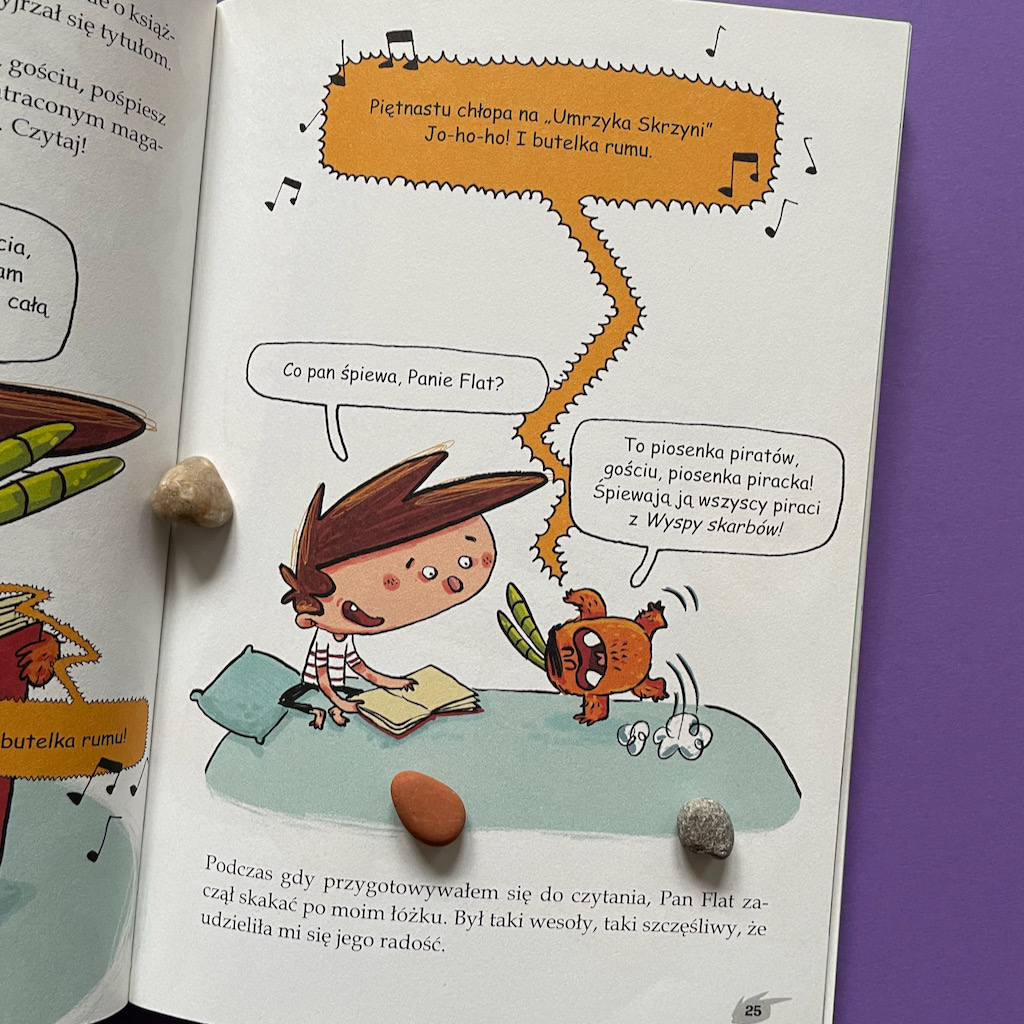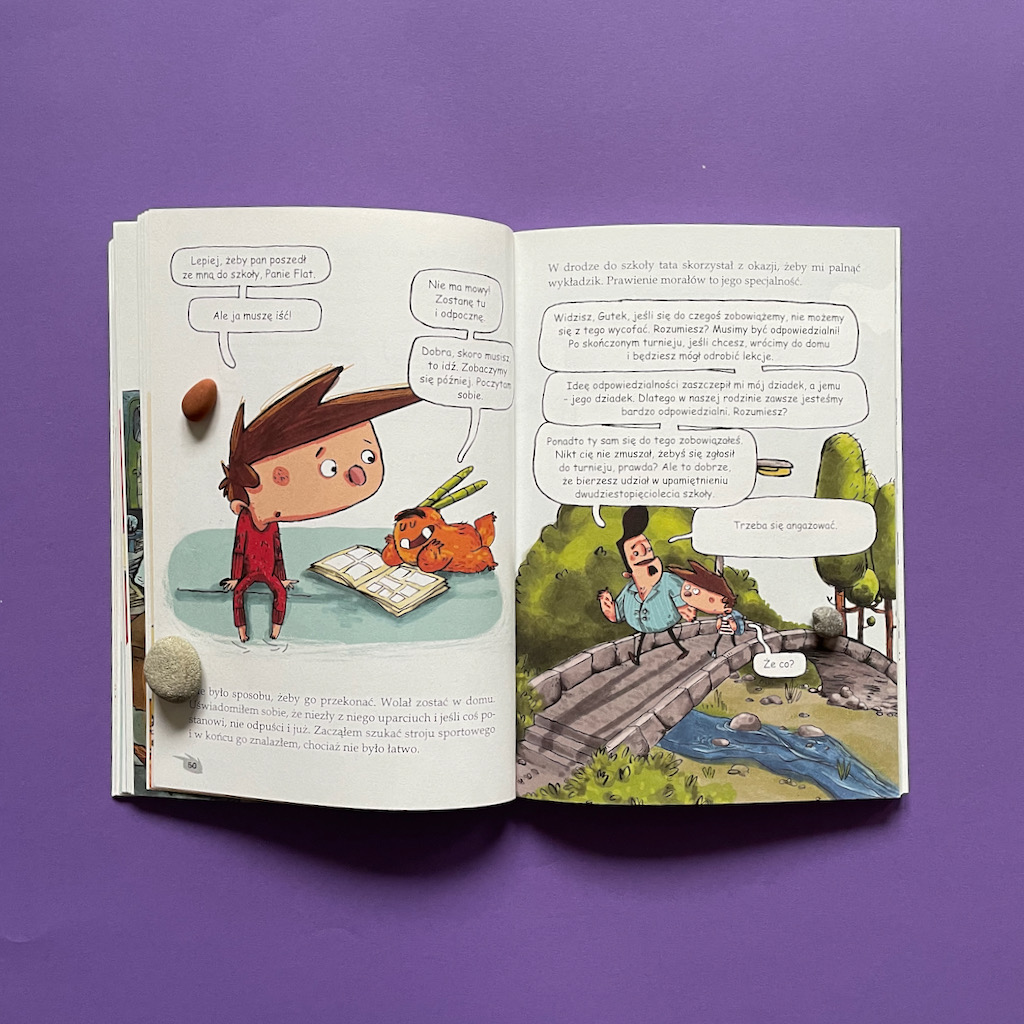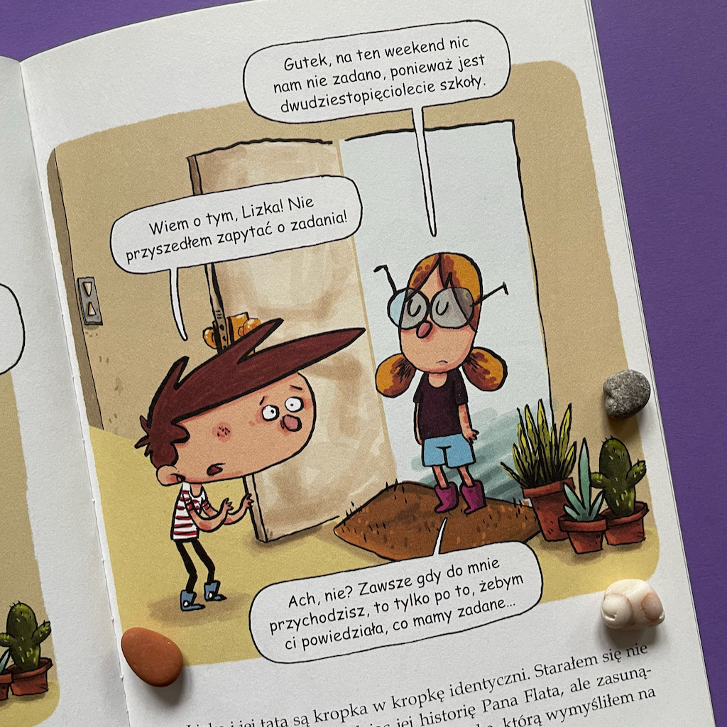Nie jest to jednak zwykłe czytanie. Pan Flat zna już wszystkie książki, które stoją na półkach Gutka. Tymczasem Gutek sięga po nie pierwszy raz. Wcześniej nie był nimi zainteresowany. Teraz właściwie też nie jest, ale czyta by nakarmić swojego nowego przyjaciela. Tyle, że to czytanie ma zupełnie inny wymiar, bo Pan Flat przeżywa, odgrywa scenki i dopowiada ciekawostki. Takie nawiązujące do treści czytanych historii i takie dotyczące autorów książek.