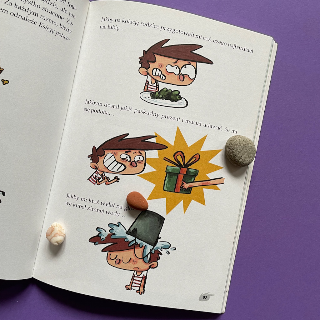 Ta seria to połączenie książki i komiksu. Na każdej stronie znajdziemy fragmenty napisane prozą, duże ilustracje i teksty w dymkach. To fantastycznie połączenie dla dzieci, które są na początku swojej drogi czytelniczej. Po przeczytaniu dłuższych fragmentów tekstu mają chwilę na oddech – na oglądanie ilustracji i czytanie scen komiksowych.