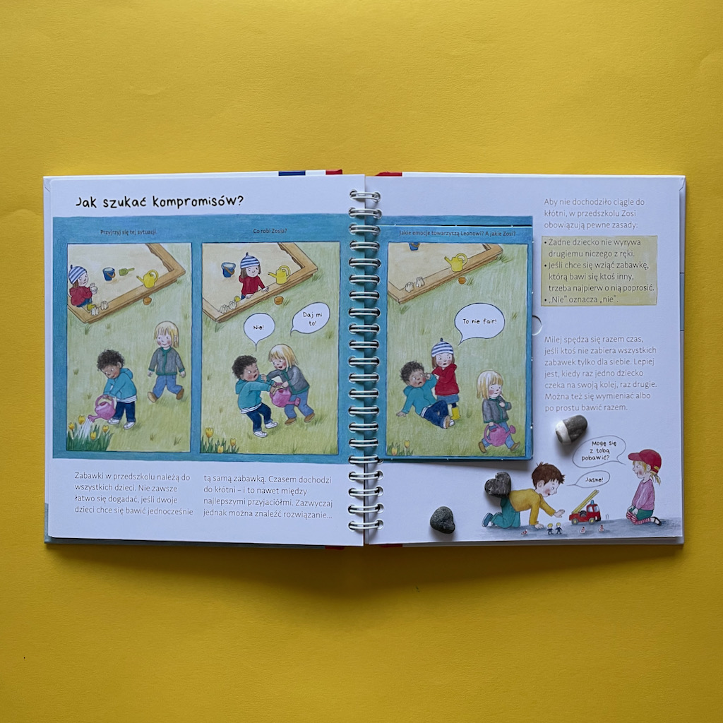 Współdziałanie, empatia, pomoc, rozwiązywanie konfliktów, kompromisy… to nie brzmi, jak temat na proste i przyjemne rozmowy z trzylatkiem. A jednak z takimi problemami mierzy się on każdego dnia! Nie tylko jeśli jest przedszkolakiem. Przecież spotyka dzieci na placu zabaw, w klubach malucha, może ma rodzeństwo lub kuzynostwo, może często odwiedza kolegów. Każde takie spotkanie to całe mnóstwo trudnych sytuacji. Zakładamy, że dziecko będzie się świetnie bawić, tymczasem ono spotka się nagle z brakiem zrozumienia, innymi oczekiwaniami, innymi temperamentami i potrzebami. Nie chce ustąpić, rezygnować ze swoich przyzwyczajeń, ale po drugiej stronie jest dziecko, które odczuwa dokładnie te same emocje.