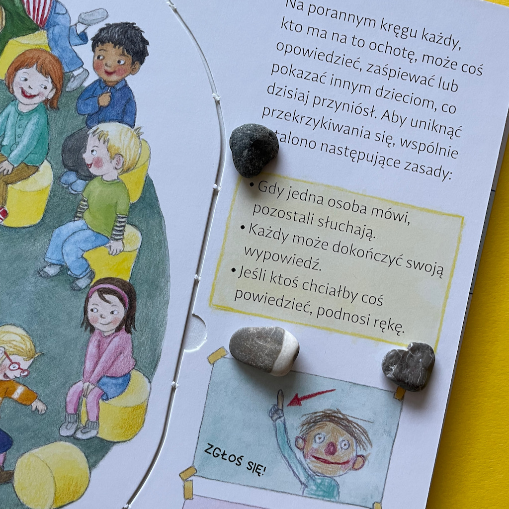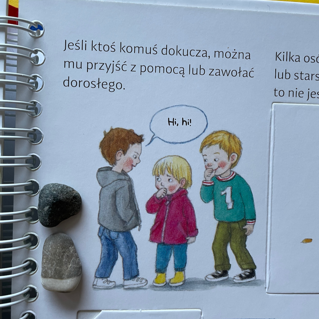 U nas ta książka trafiła w ręce czteroletniego Tymka i sprawdza się doskonale. Oglądamy, czytamy i nieustannie odnosimy się do sytuacji z jego życia. On sam zauważa podobieństwa scenek z książki do swoich przedszkolnych przeżyć. Opisuje je, opowiada, jak je rozwiązał i zastanawia się czy postąpił właściwie, czy może mógł problem rozwiązać inaczej. Czasem są to sytuacje, które go nie dotyczyły, ale dzieci się wzajemnie obserwują, czują swoje emocji i nawet jeśli nie są uczestnikami niektórych wydarzeń, to pozostają one w ich pamięci i sercu. Zdarza się, że ich nie rozumieją, ale mocno je przeżywają. Dlatego ta książka przyda się naprawdę każdemu dziecku.