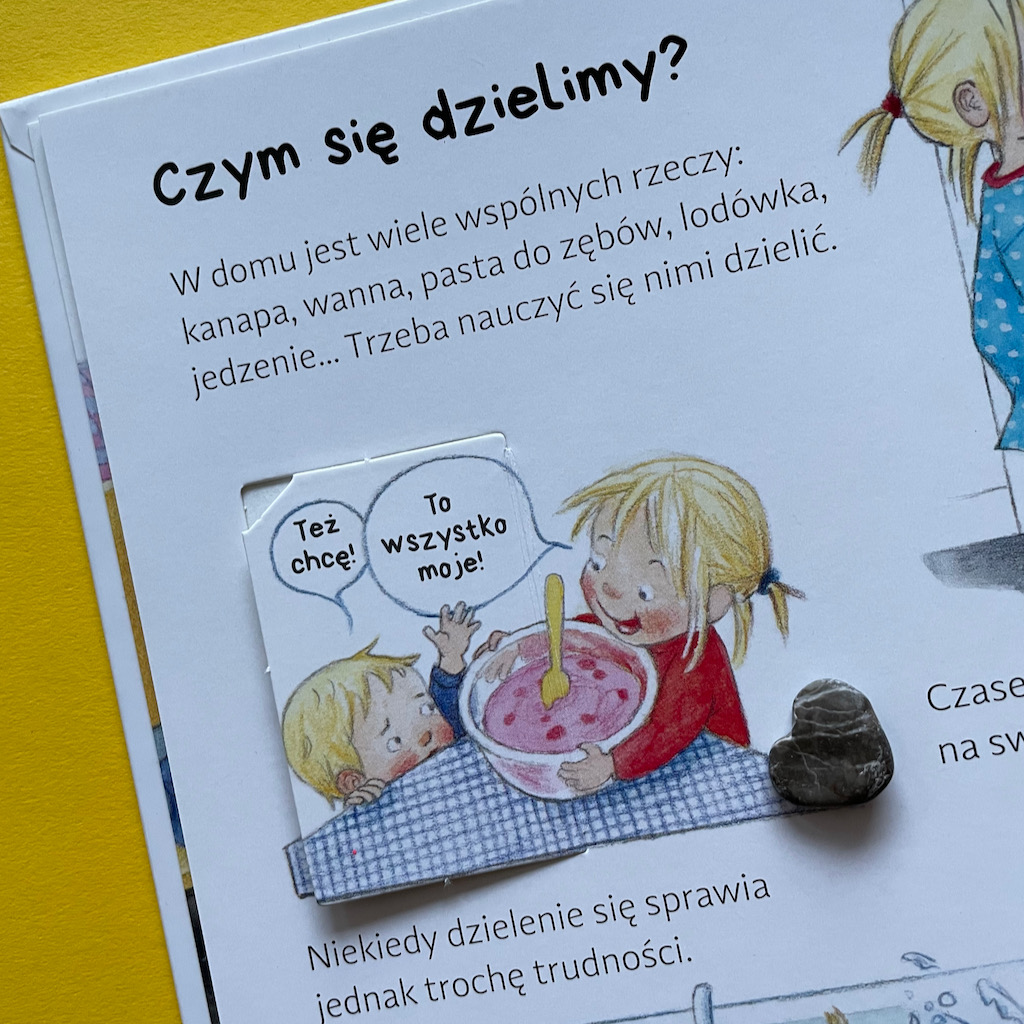 Nie znajdziemy tu fabularyzowanej opowieści z wplecionym głównym wątkiem czy jakimś szczególnym problemem. Tutaj dziecko dostanie odzwierciedlenie swojej rzeczywistości. Sytuacji z jakimi spotyka się każdego dnia – w kontaktach z rodzeństwem, w przedszkolu, na placu zabaw. Czasem to ono czuje się poszkodowane, innym razem to ono jest sprawcą złego samopoczucia kolegi czy koleżanki. Ale jest maluchem, który się tego dopiero uczy, a ta książka przyjdzie mu z pomocą.