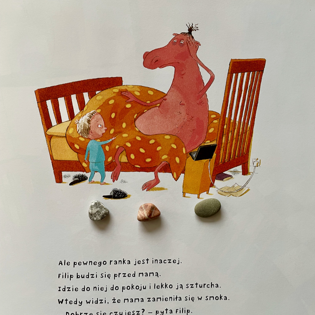 Okazuje się, że mama Filipa, któregoś dnia dochodzi do swoich granic i pewnego ranka budzi się jako… smok. Czy może raczej smoczyca. Nie pamięta, co powinna robić, jak przygotować śniadanie, jak pomóc synkowi w porannych rytuałach. Jest skołowana i bardzo zmęczona.