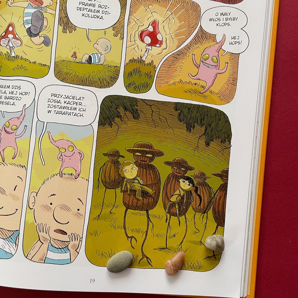 „Kacper i spółka. Uroczysko Szyszymory” to komiks, który kupiłam dla Sebastiana. Był nim oczywiście zachwycony i przeczytał go kilka razy z rzędu. Oczywiście ja też po niego sięgnęłam, bo skoro on był nim tak mocno zafascynowany, to chciałam wiedzieć, co go tak wciągnęło. Już po kilku pierwszych stronach to zrozumiałam. A chwilę potem siedział już do mnie przyklejony Tymek, więc czytaliśmy go razem. I również u niego nastąpił całkowity zachwyt. Śmiało więc mogę powiedzieć, że komiks świetnie się sprawdzi dla czterolatka, dziewięciolatka i osoby dorosłej.