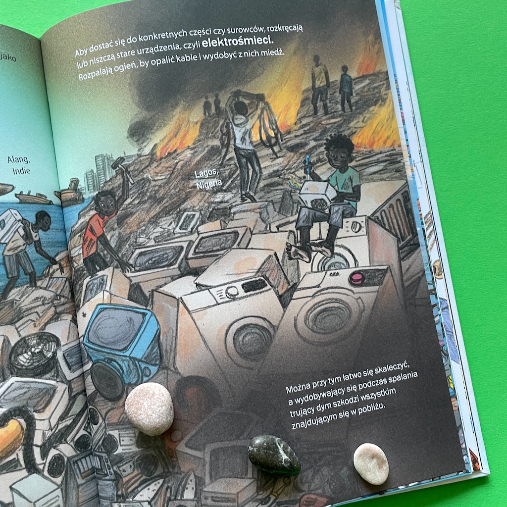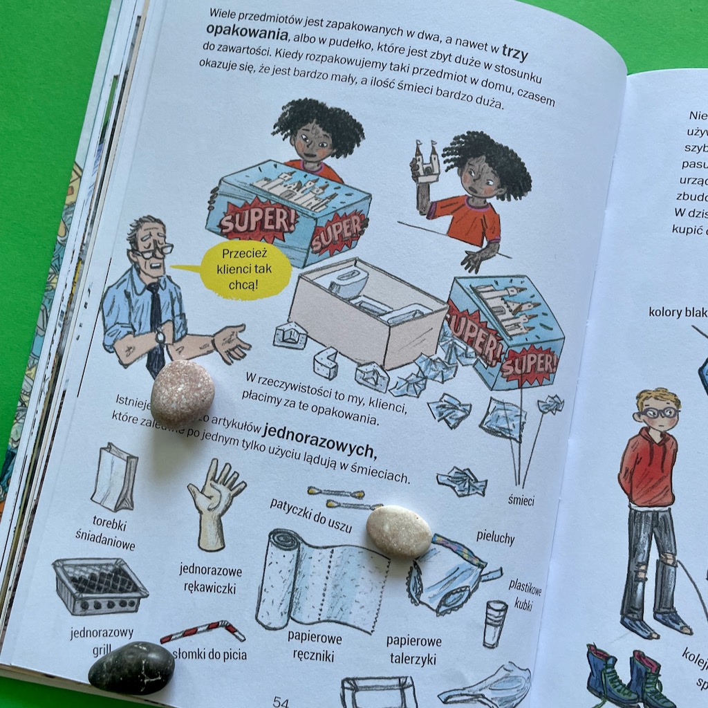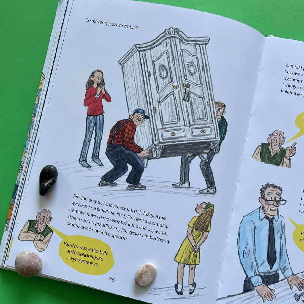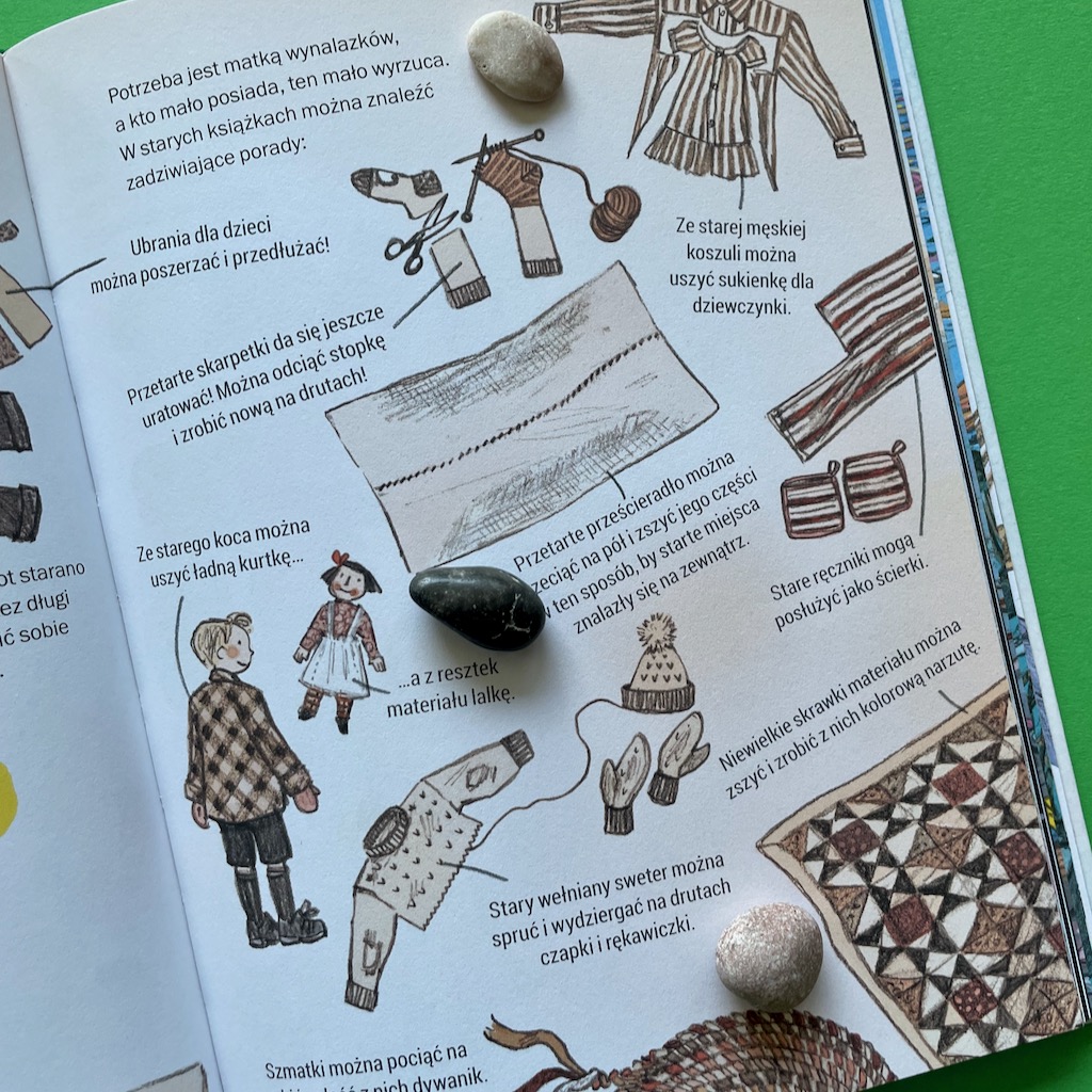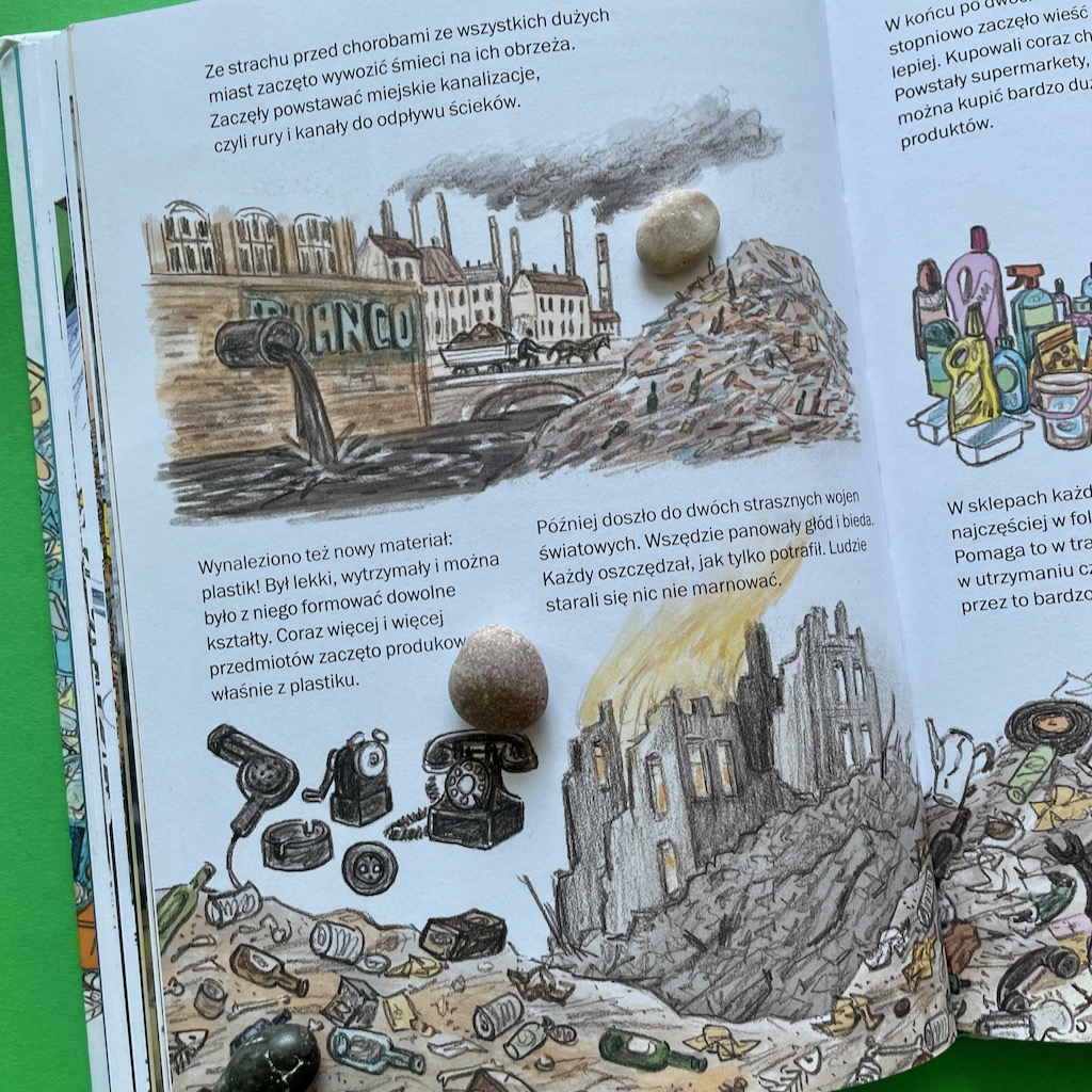 Jest tu mnóstwo informacji o recyklingu – na czym polega, dlaczego jest ważny, jak dobrze sortować śmieci, co się nadaje do recyklingu, a co nie. Dowiemy się też jakie są różnice w podejściu do produkowania śmieci dzisiaj i dawniej – z czego one wynikają, jak ludzie w przeszłości dbali o rzeczy i dawali im drugie życia.