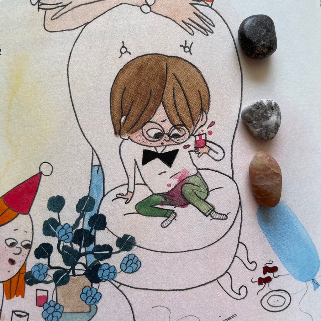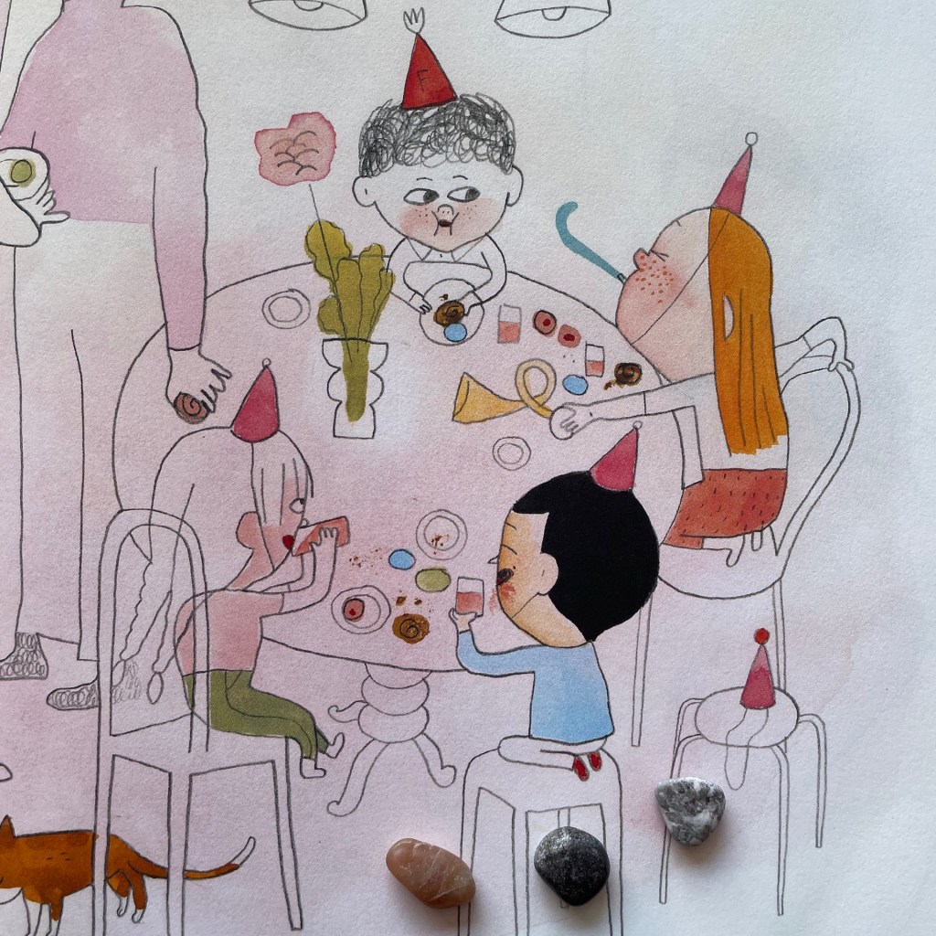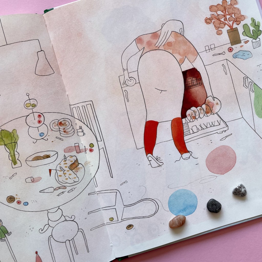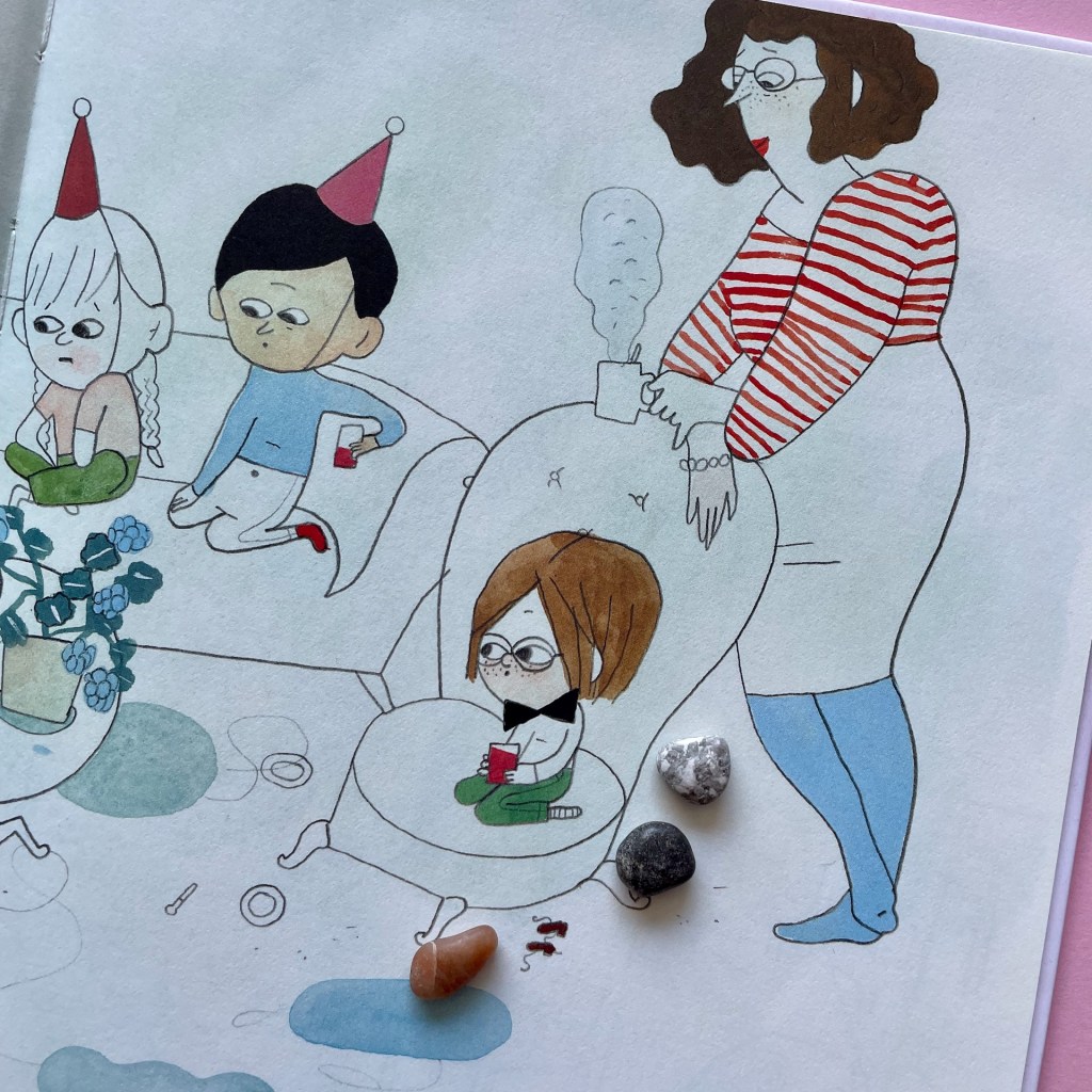 Mnóstwo informacji wyczytacie jednak z ilustracji. Tworzą niesamowite tło. Najpierw obserwujemy, jak przebiegają przygotowania do wyjścia (nudzenie się, bo mama się szykuje, czesanie włosów, przebieranie, pakowanie prezentu), a potem przyjęcie w domu kolegi. Bardzo podoba mi się to, że oba domy i jego mieszkańcy są zupełnie zwyczajni. W pokoju chłopca jest bałagan, w kuchni gotuje się zupa, a w domu panuje ogólny rozgardiasz – jak to przed każdym wyjściem. Na przyjęciu też nie jest cukierkowo. Dzieci jedzą, bawią się i bałaganią. Dorośli piją kawę, plotkują i obserwują swoje pociechy. A na koniec mama Freja zostaje z całym tym majdanem. No życie.