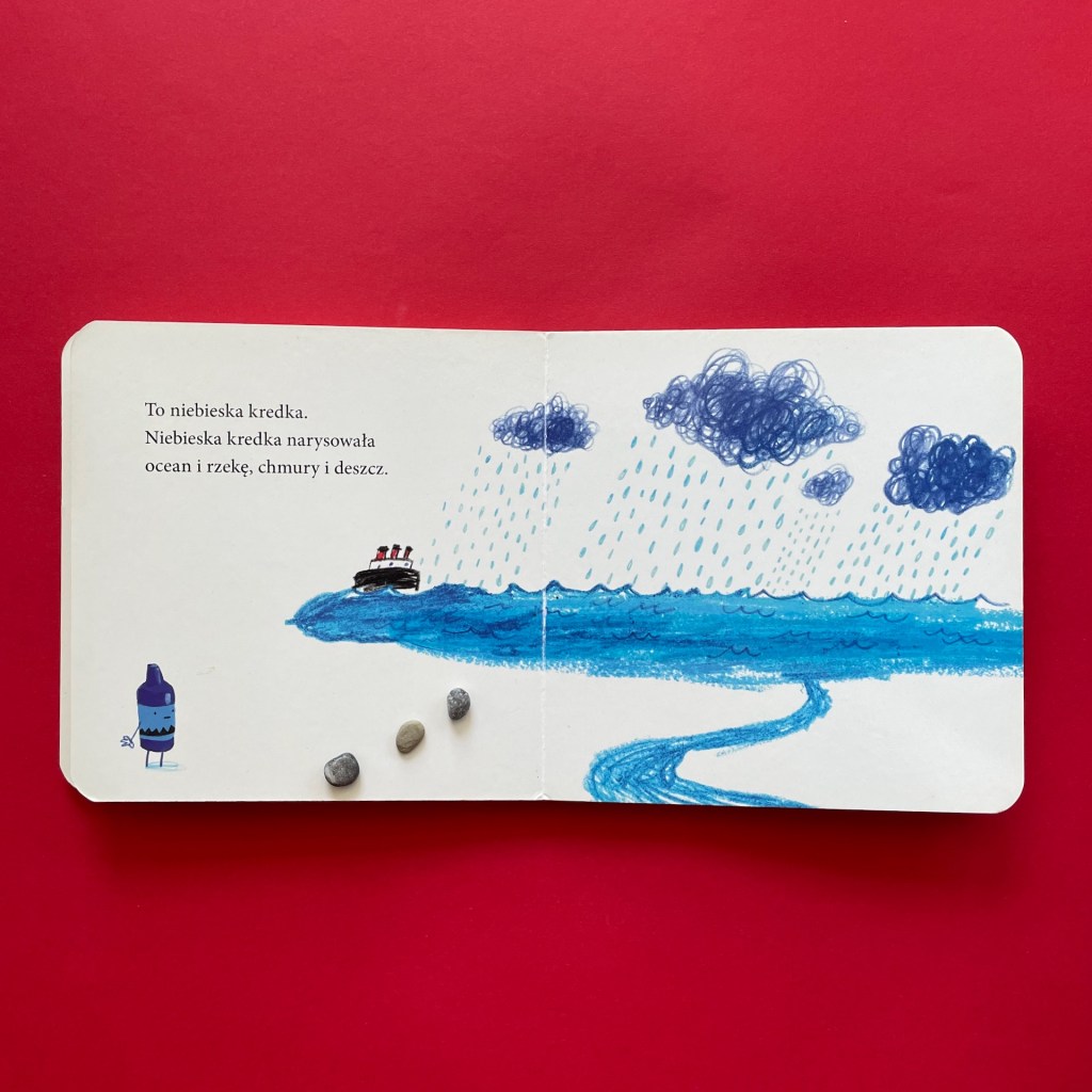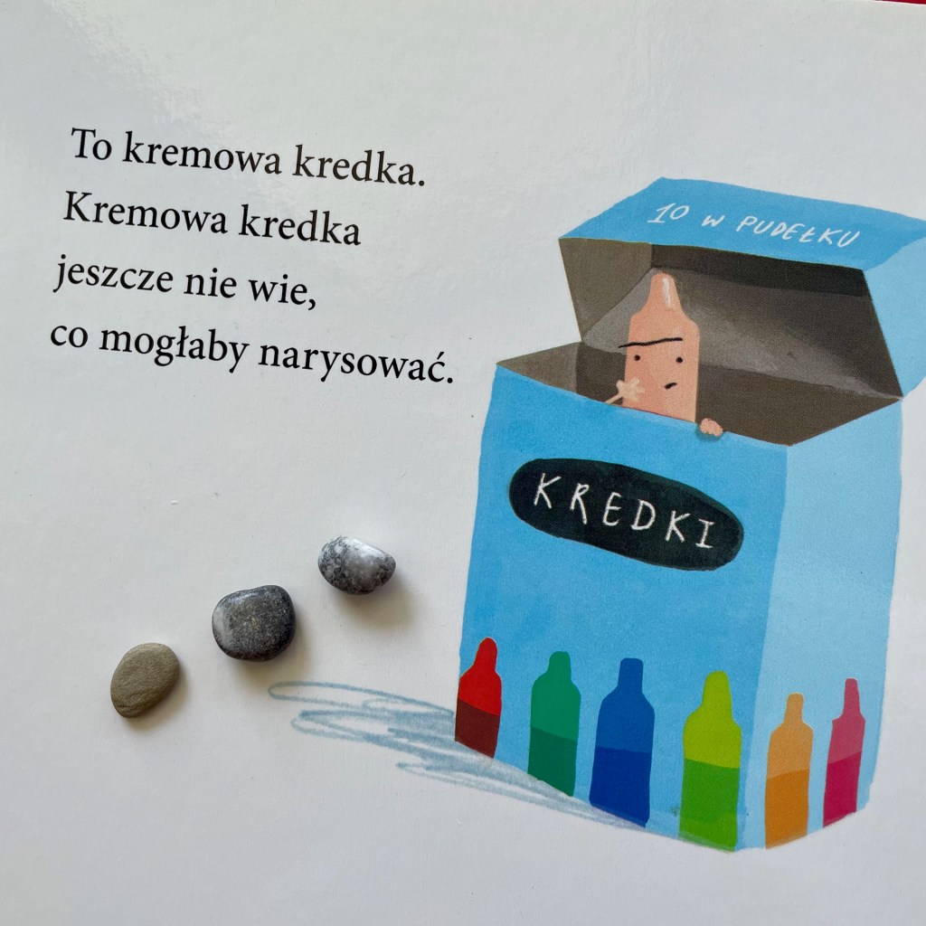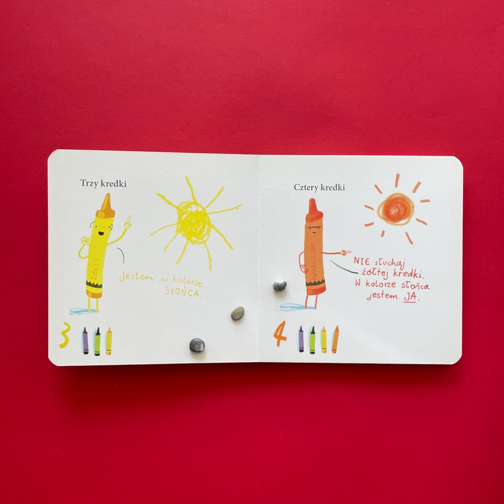 Bohaterkami książeczek są kredki. W części o kolorach narrator opowiada, co może narysować kredka w danym kolorze, a ona dopowiada, co jeszcze by mogła lub chciała namalować. I to bardzo duży plus tej książki, bo pokazuje, że słońce może być namalowane przez kredką żółtą lub pomarańczową, że obrazek narysowany przez czarną kredkę wcale nie musi być smutny, a kolor różowy nie musi być przeznaczony tylko dla księżniczek.