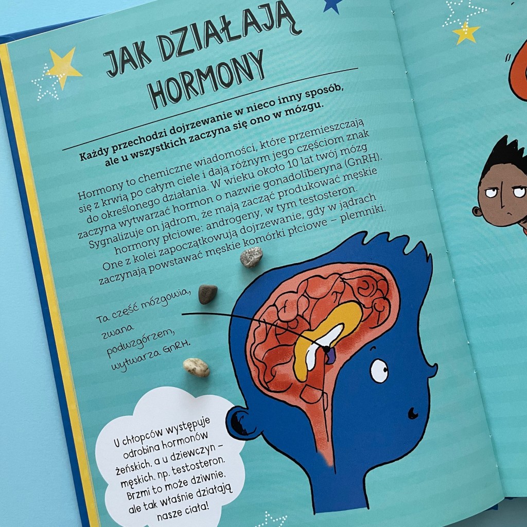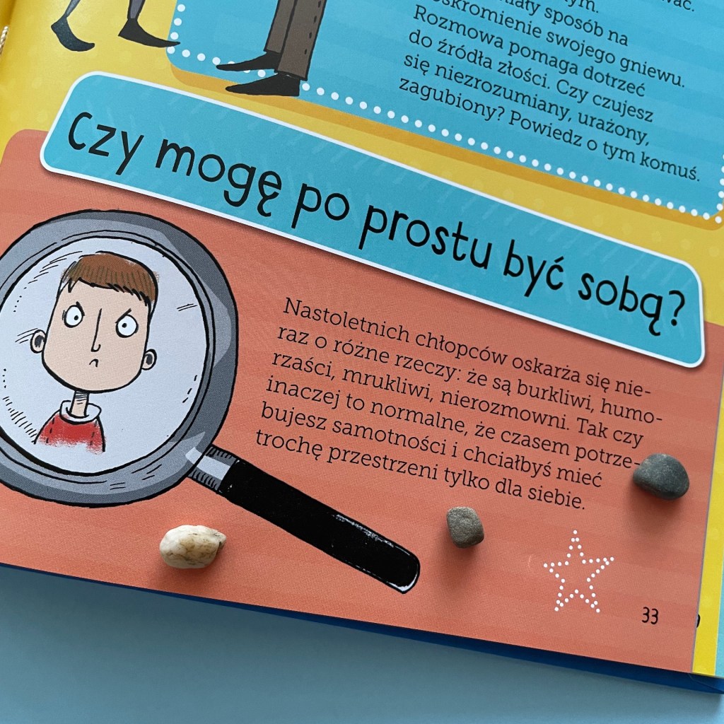 Oprócz zmian widocznych na zewnątrz jest także dużo informacji o zmianach hormonalnych, które wpływają na emocje, problemy z ich kontrolowaniem i huśtawki nastrojów. Autor podkreśla, że w społeczeństwie często oczekuje się od chłopców, że będą twardzi i dzielnie wszystko zniosą, gdy tymczasem oni potrzebują wsparcia. Muszą mieć bezpieczną przestrzeń, w której będą mogli porozmawiać o swoich lękach, kłopotach z przeżywanymi emocjami. Dlatego autor proponuje różne rozwiązania, z których dziecko może skorzystać, jeśli nie ma w domu wsparcia ze strony najbliższych.
