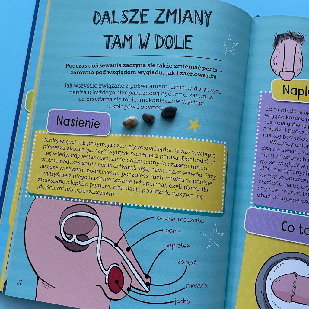 Penis, wzwód, moszna, napletek, jądra, nasienie to terminy, które pojawiają się w książce wielokrotnie. Czytelnik dostaje najważniejsze fakty – zawsze z informacją o tym, że ciało i jego rozwój są sprawą indywidualną i mogą wyglądać u każdego inaczej. Są także rysunki, więc chłopiec może się przekonać, że narządy płciowe mogą wyglądać bardzo różnie i wszystko jest z nimi w porządku; nie ma żadnej normy wzorcowej.