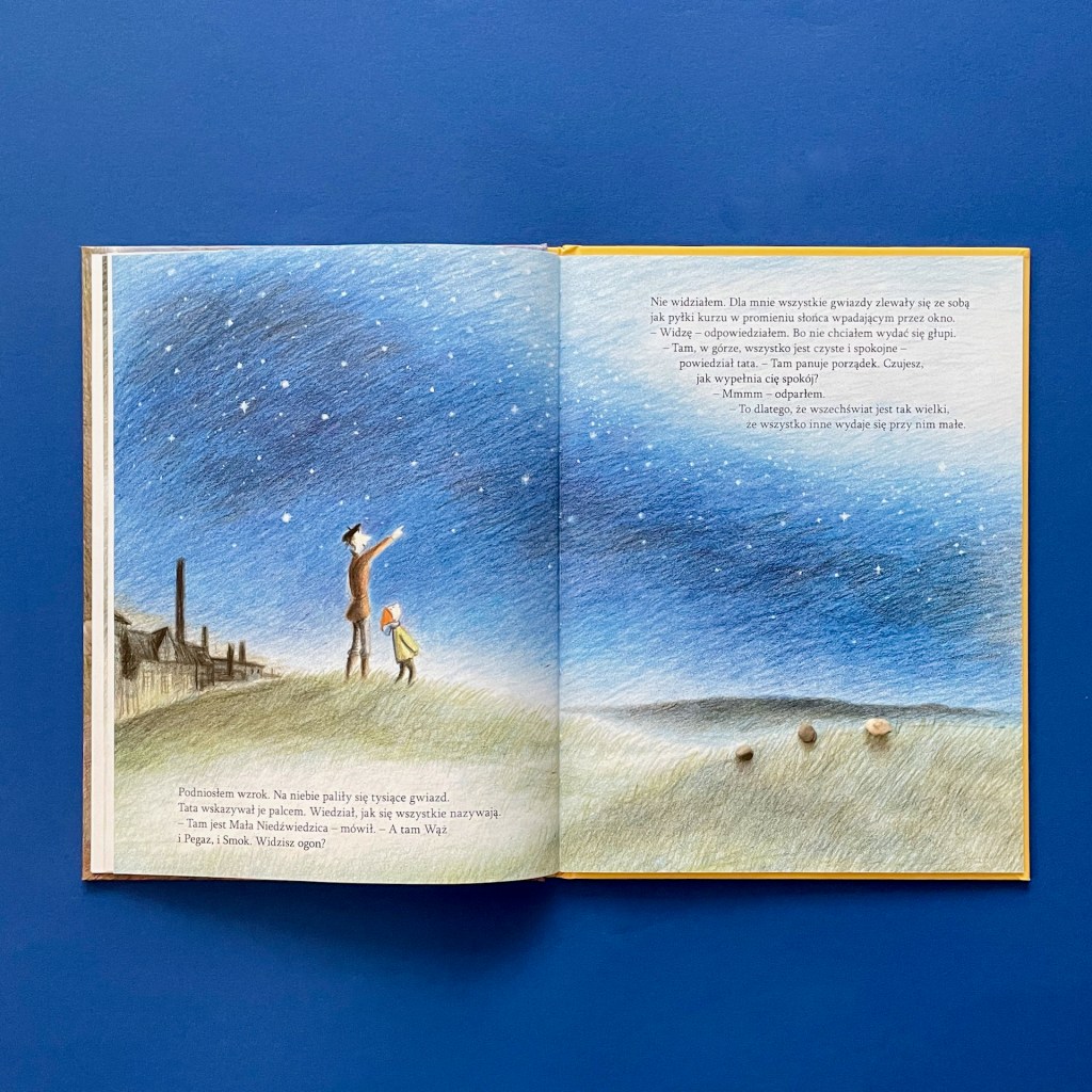 „Pewnego wieczoru tata powiedział, że pokaże mi wszechświat”. To pierwsze słowa książki, które natychmiast wprowadzają nas w ten niesamowity klimat. Utrzymuje się on przez cała historię. Jest tu świat widziany oczami dziecka. Świat chłopca, który jest podekscytowany nową przygodą. Świat synka, który niezwykle przeżywa te wspólne chwile z tatą.
