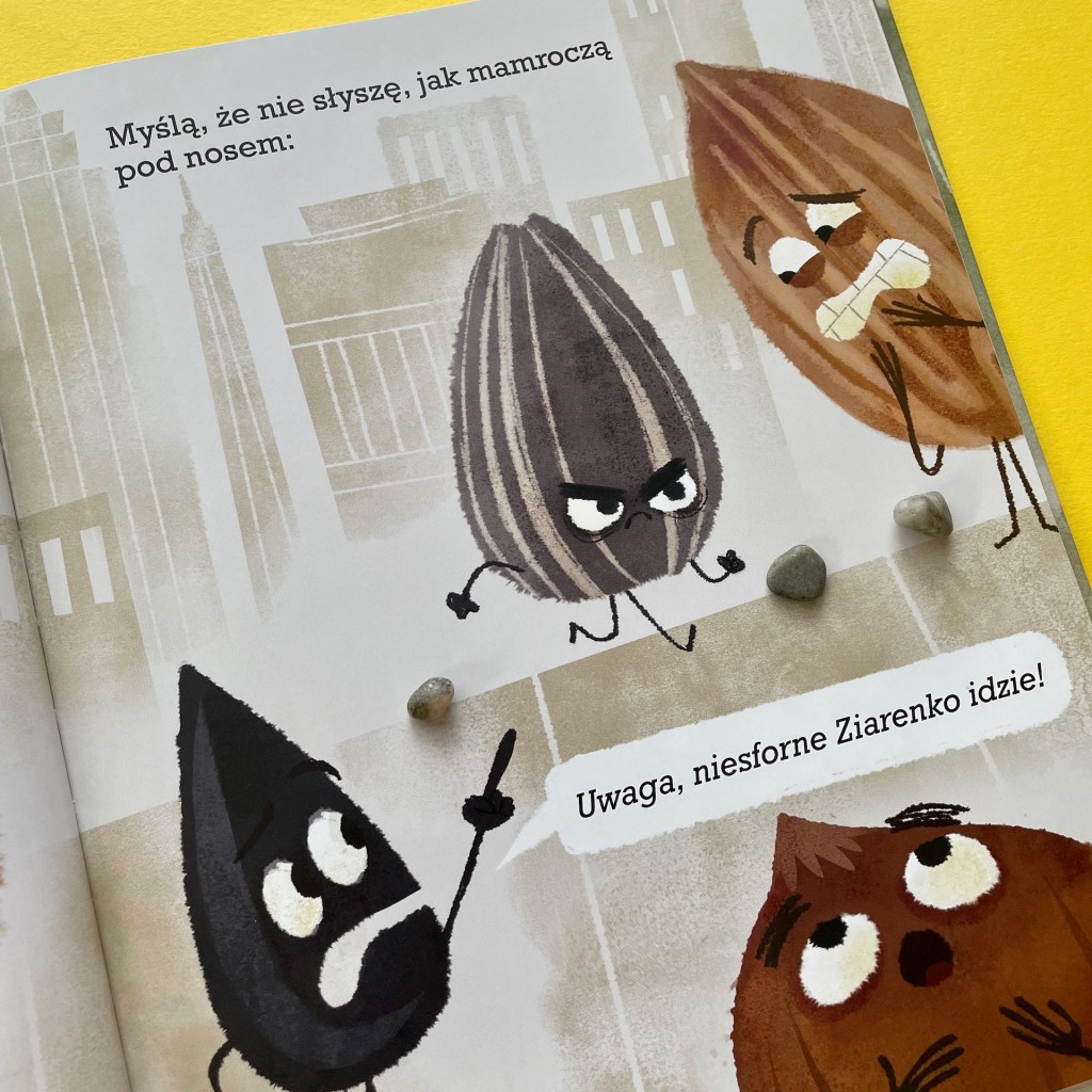Przyznaję, że Tymek nie od razu załapał przekaż tej książki. Spodobała mu się, ale z innych powodów. Jest zabawnie napisana, ma bardzo wesołe ilustracje i sama postać Ziarenka chwyciła Tymka za serce. Ale po każdym czytaniu (od razu było ich wiele) omawialiśmy temat, rozmawialiśmy, tłumaczyliśmy i teraz Tymek lepiej rozumie tę historię. Zaznaczam więc, że pomimo tego, że książka wydaje się lekka, to naprawdę warto się w nią z dzieckiem zagłębić, by wyciągnąć z niej to ukryte przesłanie. Szczególnie, że jest to temat bardzo bliski wszystkich dzieciom i na pewno niejednokrotnie się z nim w swoim życiu spotkają.