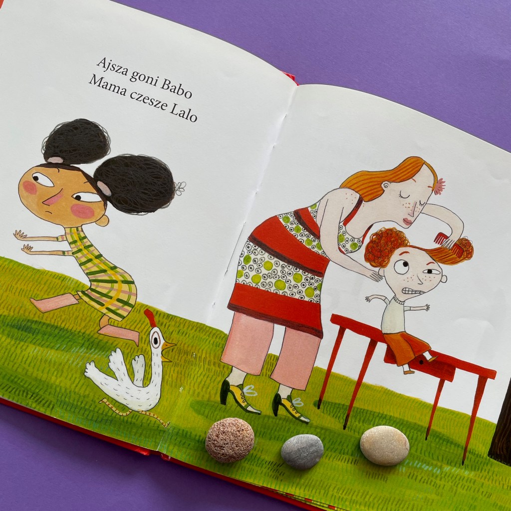 Było w czytelniczym życiu naszych synków kilka takich pozycji. Jedna z nich to „Lalo gra na bębnie” (o którym pisałam tutaj). Już nawet ten rytm wbijany przez Lalo słyszałam przez sen. Uratowała nas na szczęście jego siostra – Binta. Sięgnęliśmy po kolejną część z ulgą, ale także obawą, że historia się powtórzy. Mieliśmy rację. To była kolejna ukochana książka. Ukochana, a więc czytana nieliczoną ilość razy. Ale co zrobić, gdy dziecko takie szczęśliwe? Nic, tylko czytać.