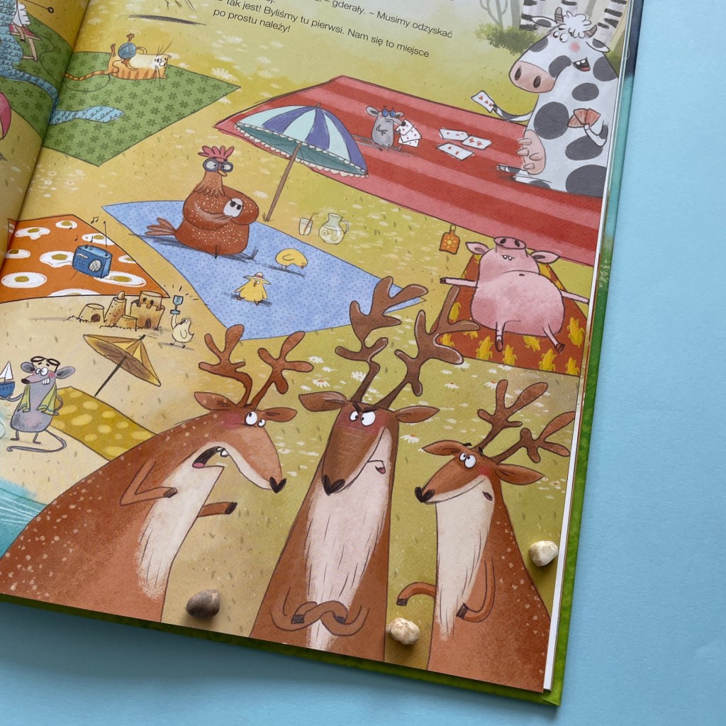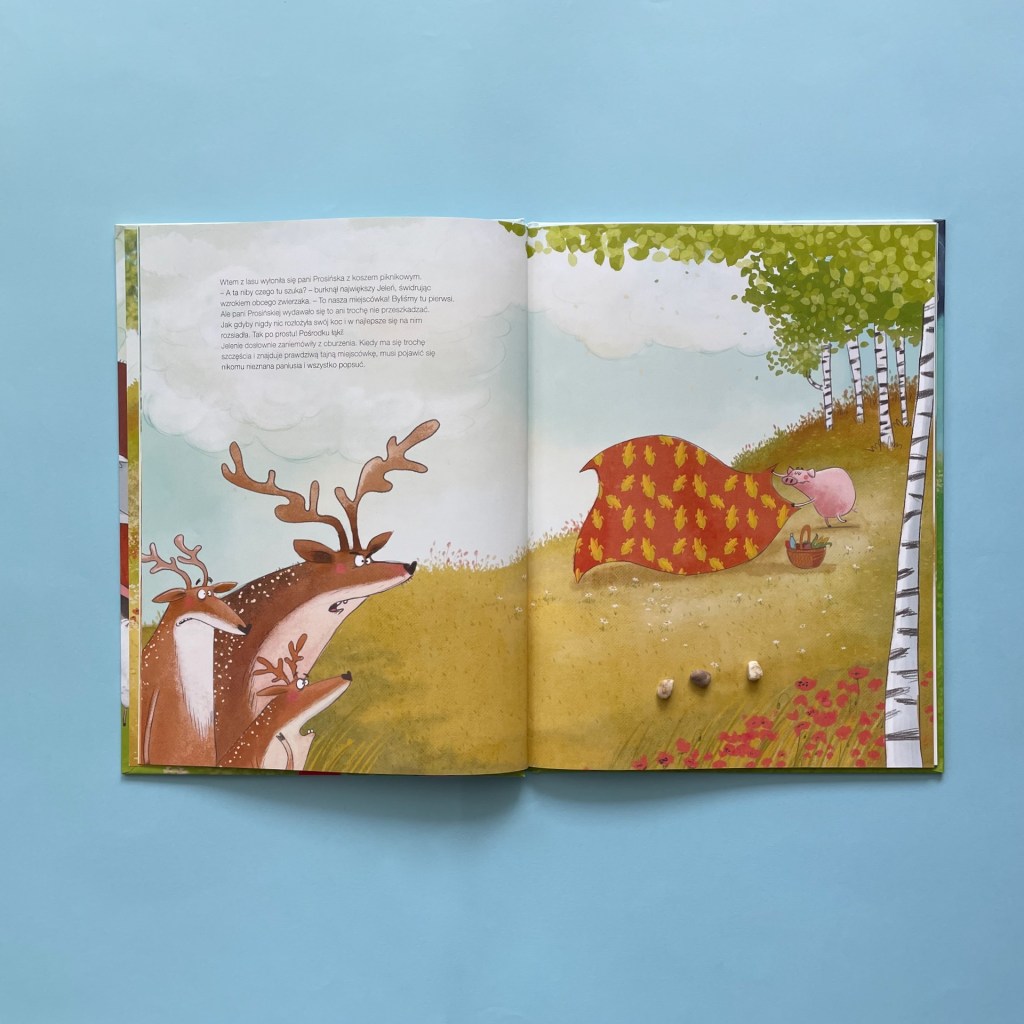 Ale ich szczęście nie trwa zbyt długo. Już po chwili pojawia się tam pani Prosińska i niezrażona niezadowoleniem Jeleni rozkłada swój kocyk. Na dodatek to dopiero początek, bo z każdą minutą na polance przybywa zwierząt. Tajna miejscówka przestaje być już taka tajna.