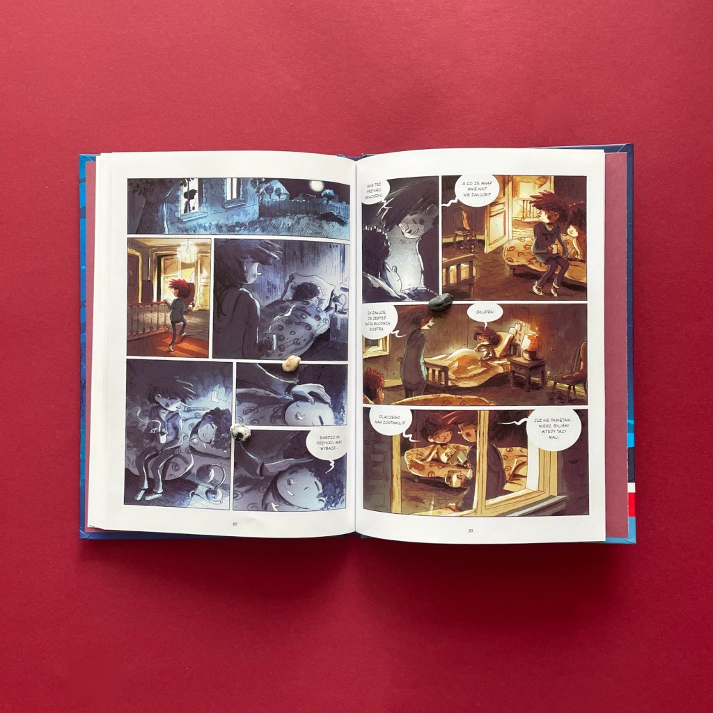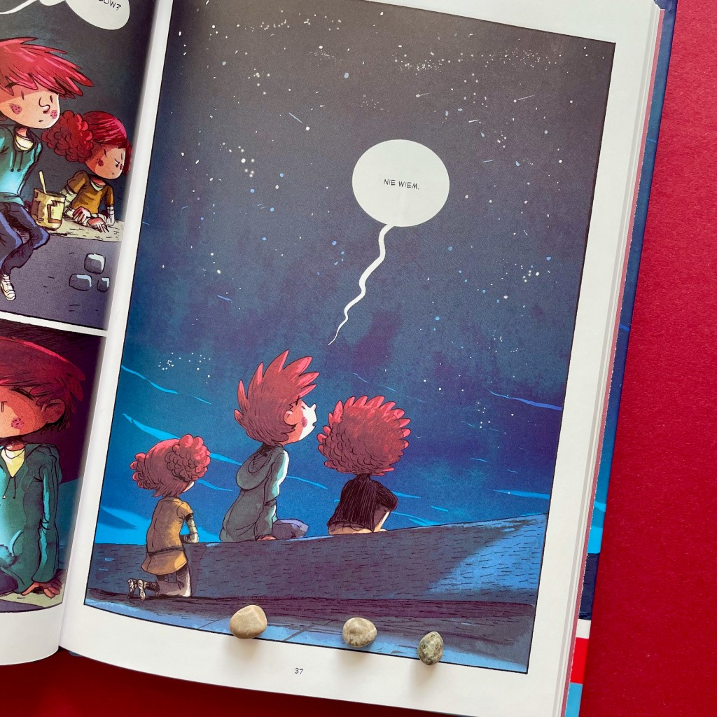 W tej historii ujęły mnie relacje pomiędzy braćmi i siostrą. Wszyscy są bardzo dojrzali i jest to cześciowo związane z ich kosmicznym pochodzeniem, a częściowo z koniecznością dostosowania się do sieroctwa – ponieważ nikt dorosły nie sprawuje nad nimi opieki, muszą być samodzielni. Jednak samodzielność w codziennych czynnościach da się wypracować, a samodzielność emocjonalna jest dużo trudniejsza do osiągnięcia. Dzieci potrzebują wsparcia, więc radzą sobie we trójkę jak potrafią. Kiedy dochodzi między nimi do do poważnej kłótni i emocje za bardzo ich ponoszą, mamy wrażenie, że nastąpi załamanie. Ale Mat odpuszcza i wychodzi, by ochłonąć. To pięknie rozrysowane sceny. Nie pada tam żadne słowo. Widzimy tylko Mata, który spaceruje, przeżywa wydarzenia tego wieczoru i powoli układa sobie wszystko w głowie. Potem wraca do brata i spokojnie rozmawiają. Widać, jak bardzo się potrzebują i jak walczą o to, by relacje między nimi były dobre.
