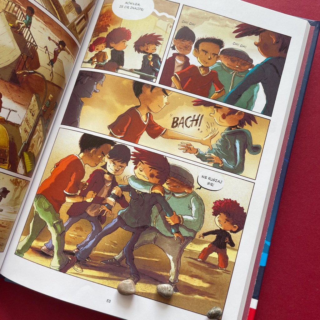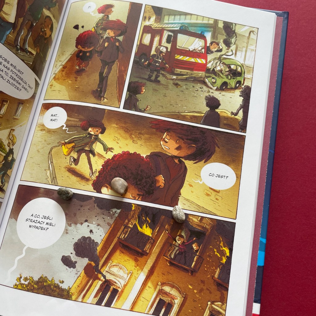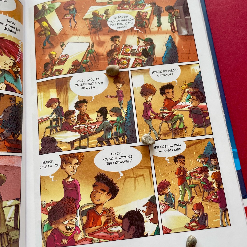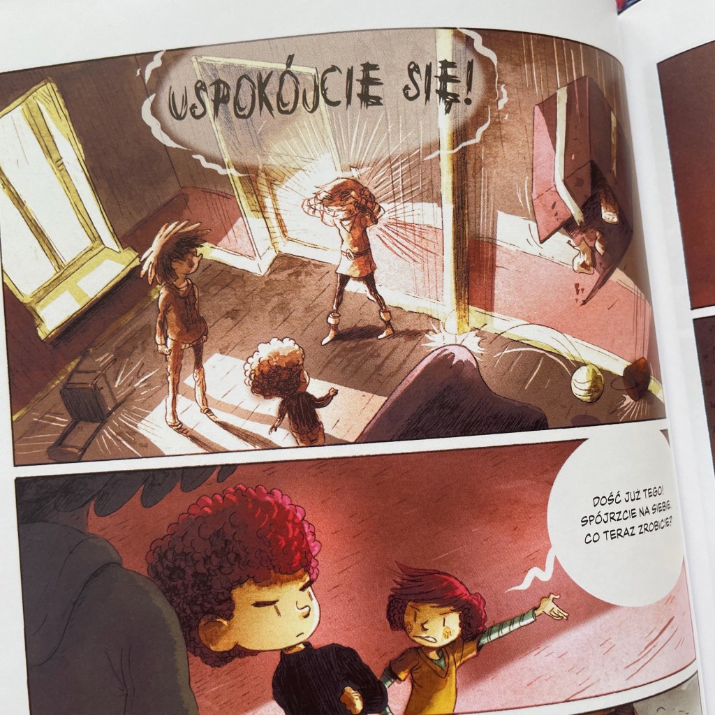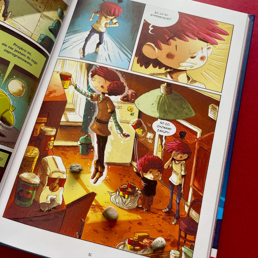 Ale oczywiście nie brakuje innych emocji. To komiks skrojony pod uczniów. Mamy więc delikatnie kiełkujące uczucie między Matem i Joanną. Mamy pierwszego kumpla. Pierwszego złośliwego łobuza szkolnego, z którym Mat szybko poprawa w konflikt. Jest oczywiście stopniowy pokaz supermocy naszych bohaterów, kilka mocniejszych scen zawierających bójki, no i akcja, w której rodzeństwo pierwszy raz decyduje się na niesienie pomocy, choć całkiem potajemnie.