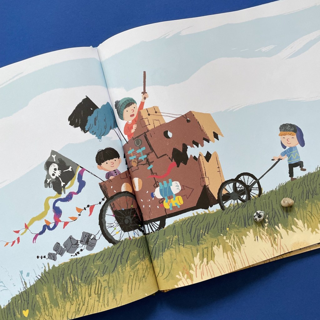 Pierwsze czytanie niekoniecznie przyniesie zainteresowanie dziecka głównym wątkiem. Tymek zadał kilka pytań, ale kiedy na końcu pojawił się niezwykły kartonowy pojazd, to wszystko inne zeszło na dalszy plan. Kolejnych kilka czytań było właśnie po to, by jeszcze raz zobaczyć radość chłopców ze wspólnej zabawy. Ale już następne razy były spokojniejsze, było w nich więcej miejsca na refleksję. Porozmawialiśmy z Tymkiem o uczuciach chłopców i mogliśmy odnieść je do sytuacji z jego przedszkolnych doświadczeń.