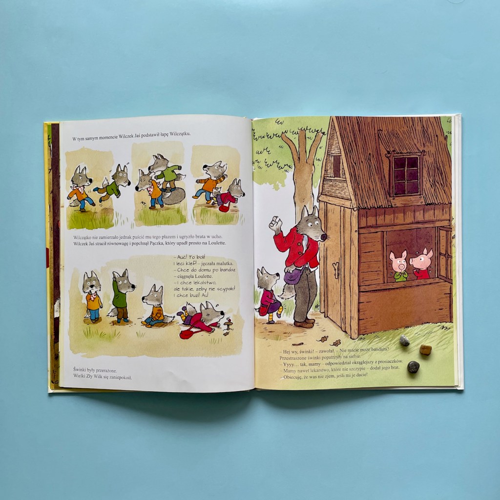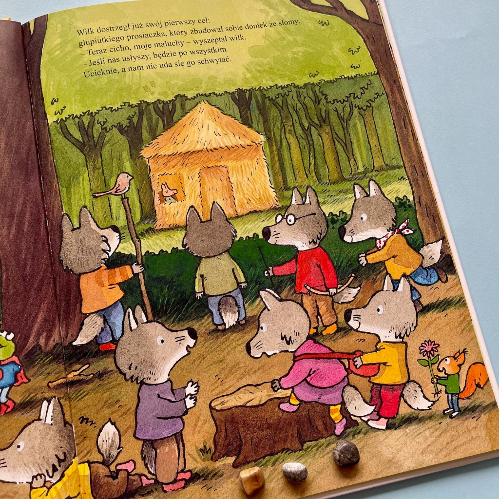 Przewrotna historia, w której zarówno dzieci, jak i dorośli znajdą coś dla siebie. Małemu czytelnikowi na pewno spodobają się niesforne wilczątka, ich pomysły i kombinacje, a rodzic ze zrozumieniem będzie się przyglądał reakcjom taty. Opowieść o trzech świnkach jest tylko podwaliną do tej przygody, ale to bardzo ciekawy zabieg. Sprawia, że dziecko odnajduje znane sobie elementy, ale jest zaskoczone tym, że wydarzenia toczą się inaczej. Może dopowiadać historię według jej pierwotnego zapisu i porównywać zmiany, które pojawiają się w książce.